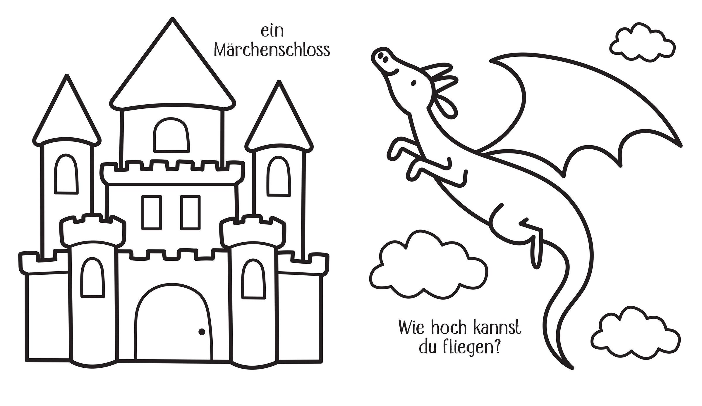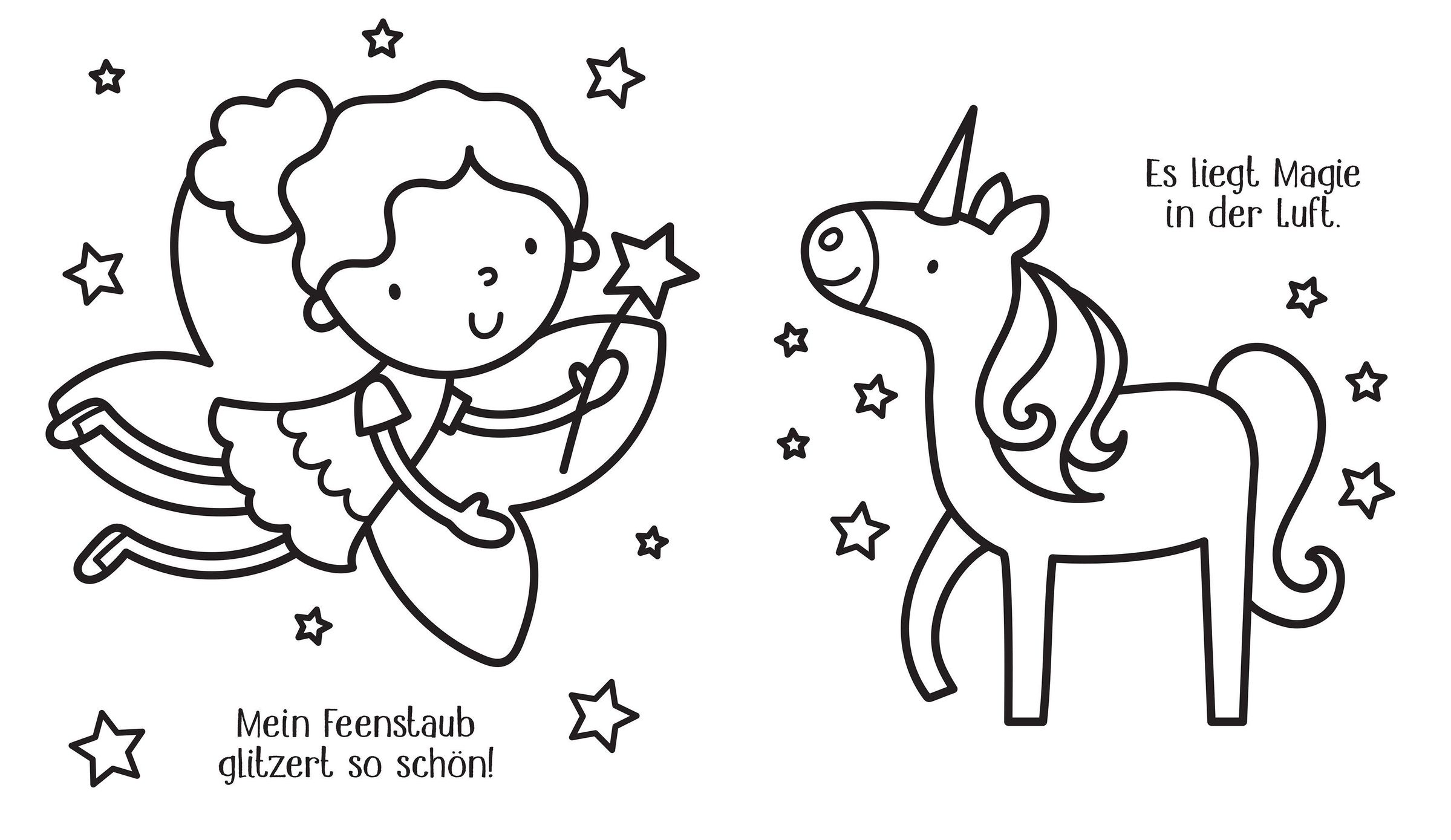 Feen, die mit Schmetterlingen spielen oder mit dem Zauberstab Glitzer rieseln lassen, verspielte Einhörner sowie Drachen, Wichtel und Meerjungfrauen. Dank breiter Konturen und einfacher Formen sind diese Malvorlagen perfekt für erste Ausmalversuche geeignet. So üben kleine Künstlerinnen und Künstler spielerisch den sicheren Umgang mit dem Stift!