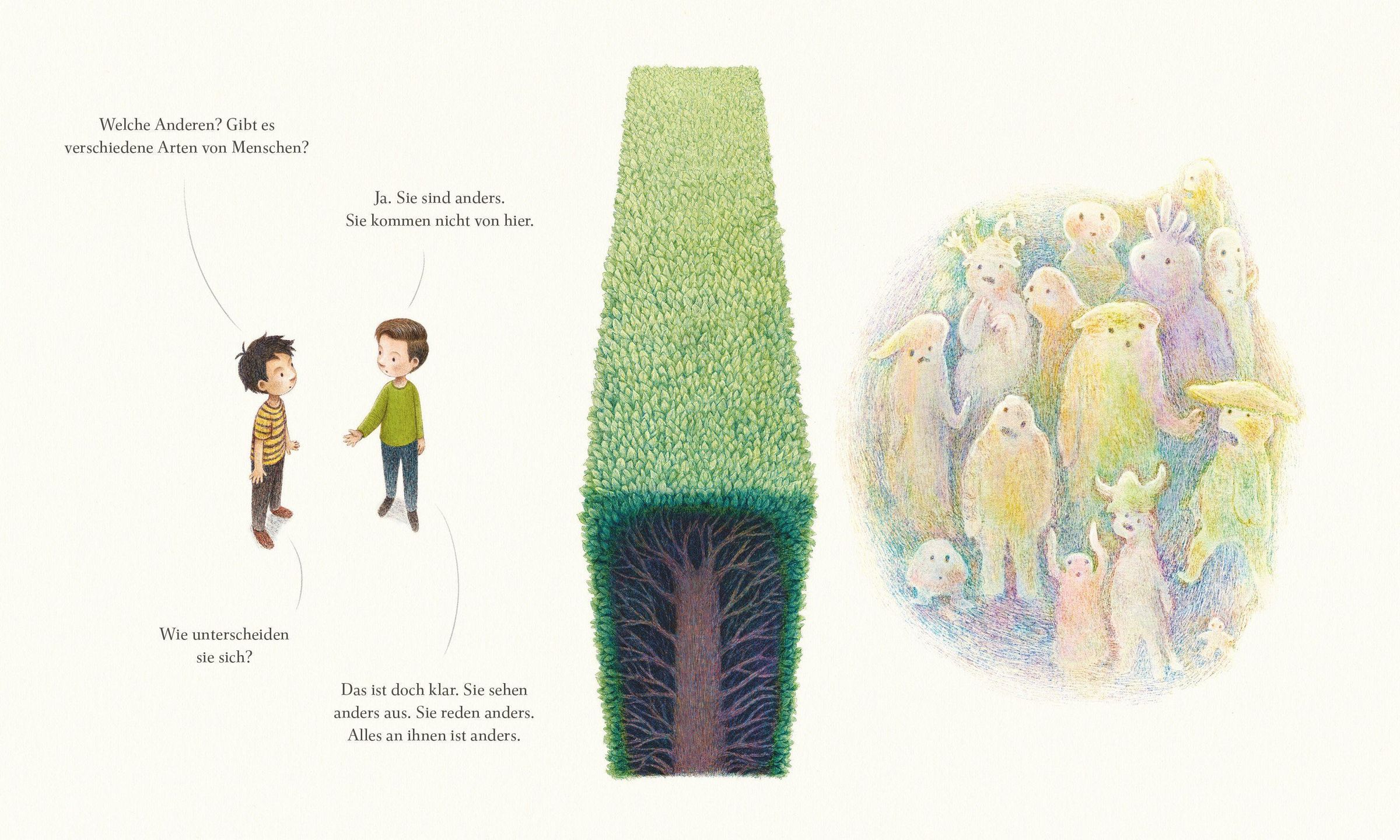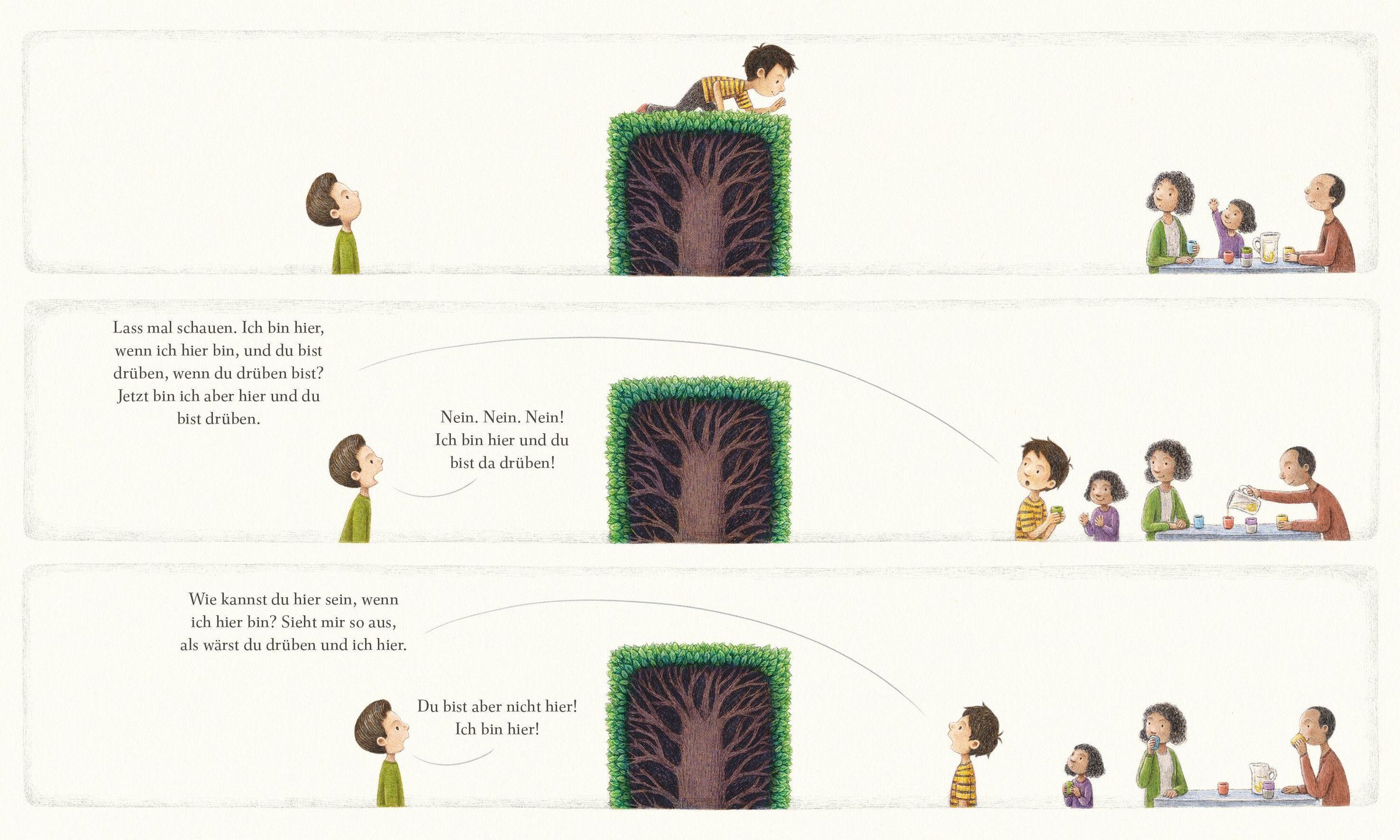 Zwei Kinder stehen an einer hohen Hecke und sprechen über die Menschen auf der anderen Seite.