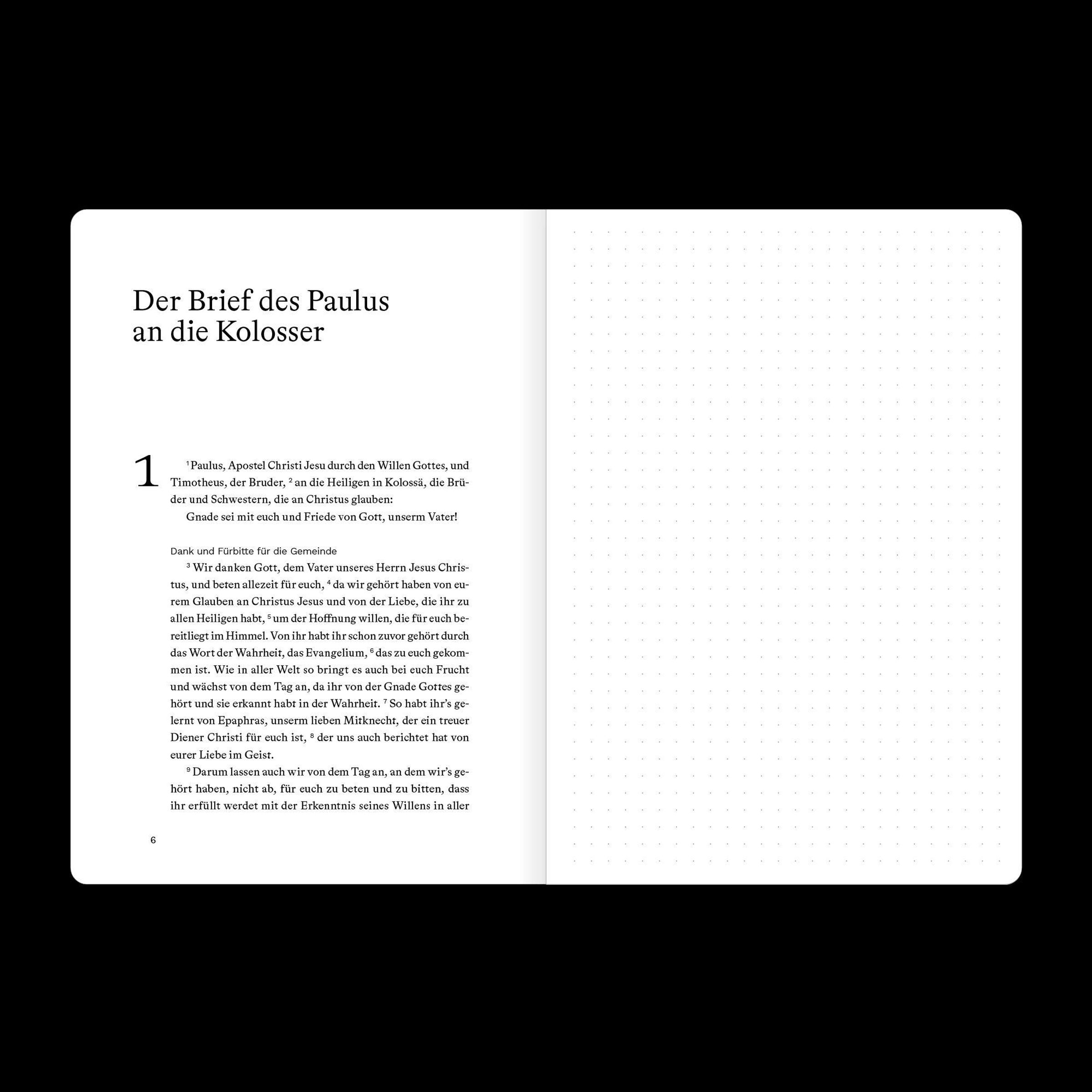 Dieses Bibeljournal kombiniert den vollständigen Bibeltext eines biblischen Buches (Luther 2017) und eine gegenüberliegende Seite mit dezentem Punktraster für deine persönlichen Notizen, Gedanken oder Gebete. So kannst du direkt neben dem Text festhalten, was dich beim Lesen bewegt.