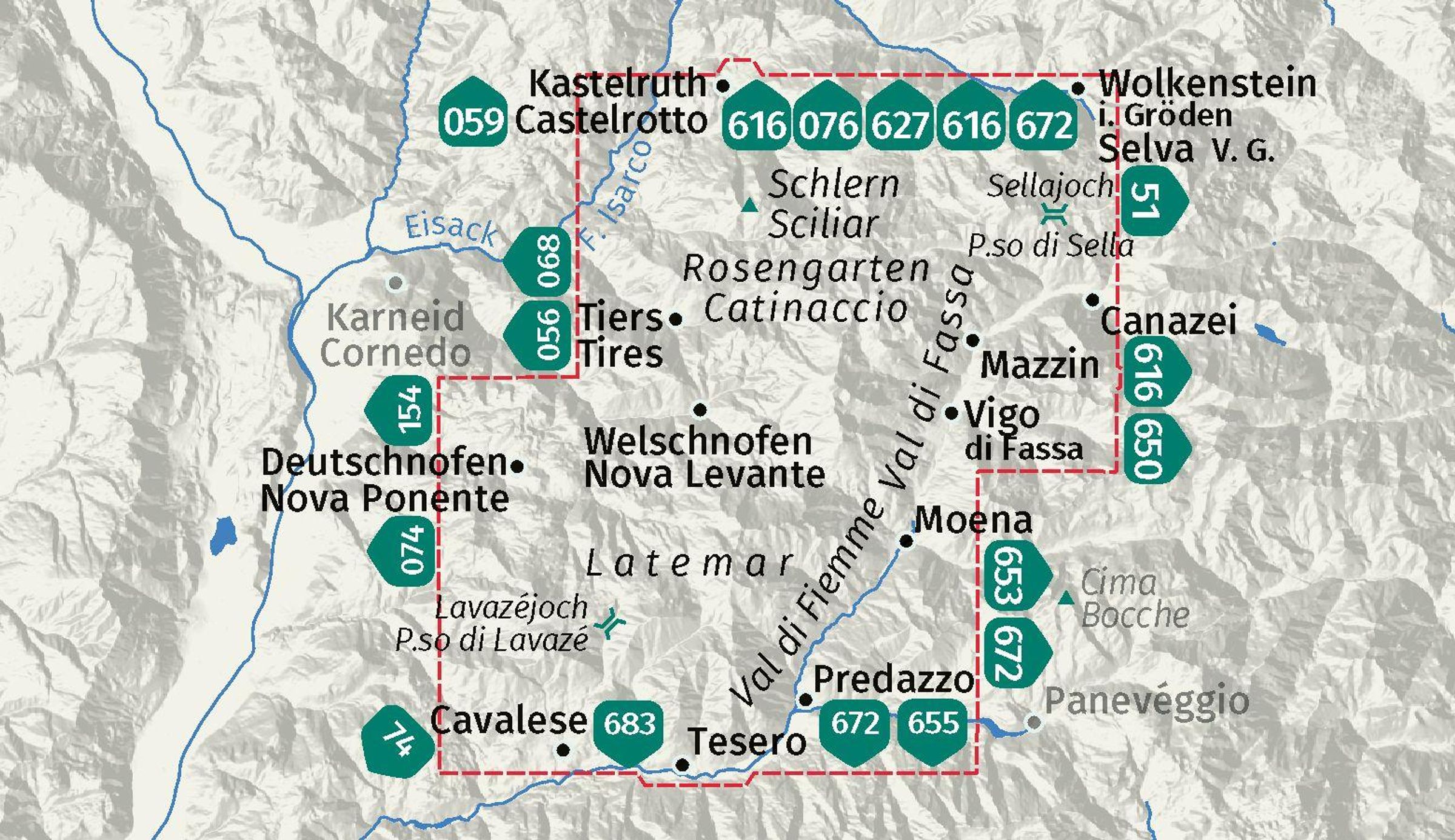 Ausstattung der Wanderkarte Schlern, Rosengarten, Latemar, Lavazejoch / Sciliar, Catinaccio, Latemar, Passo di Lavaze: