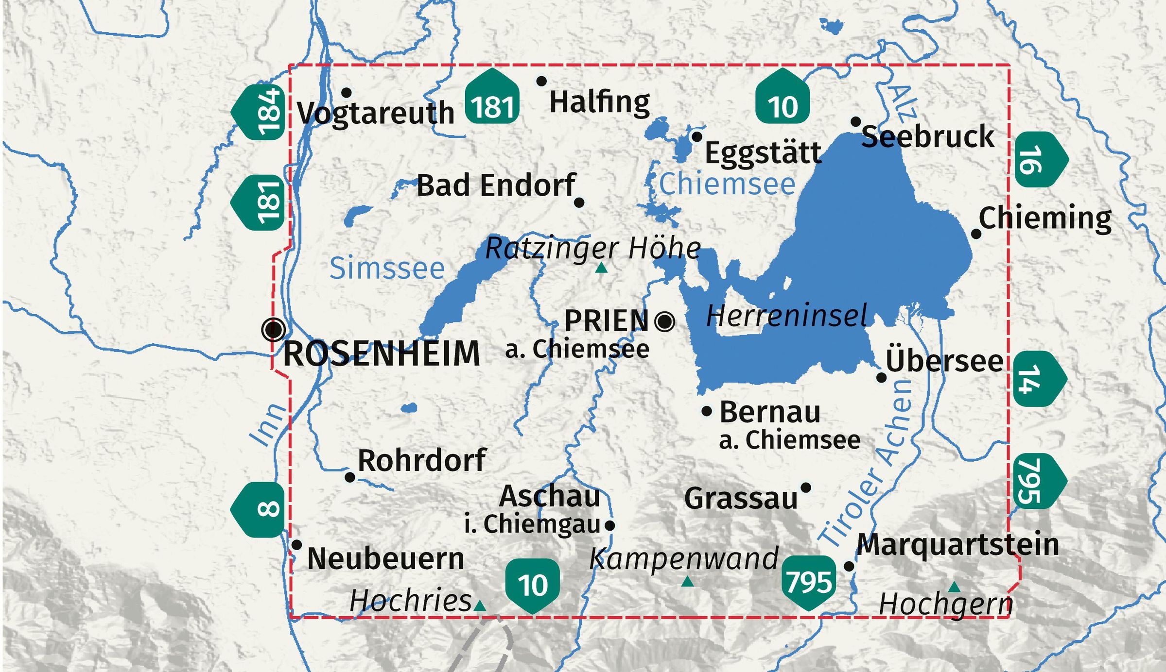 Ausstattung der Wanderkarte Chiemsee, Simssee: