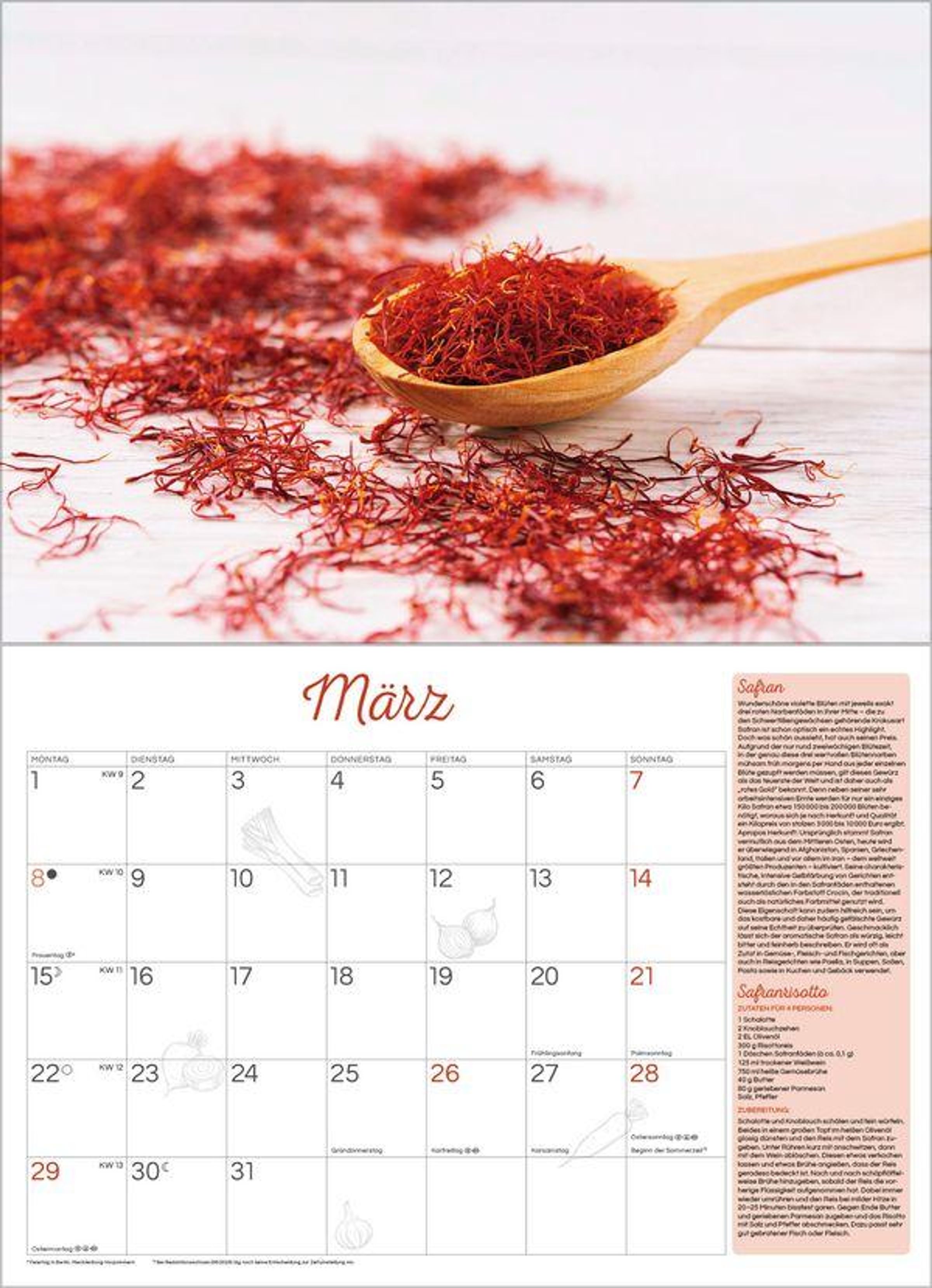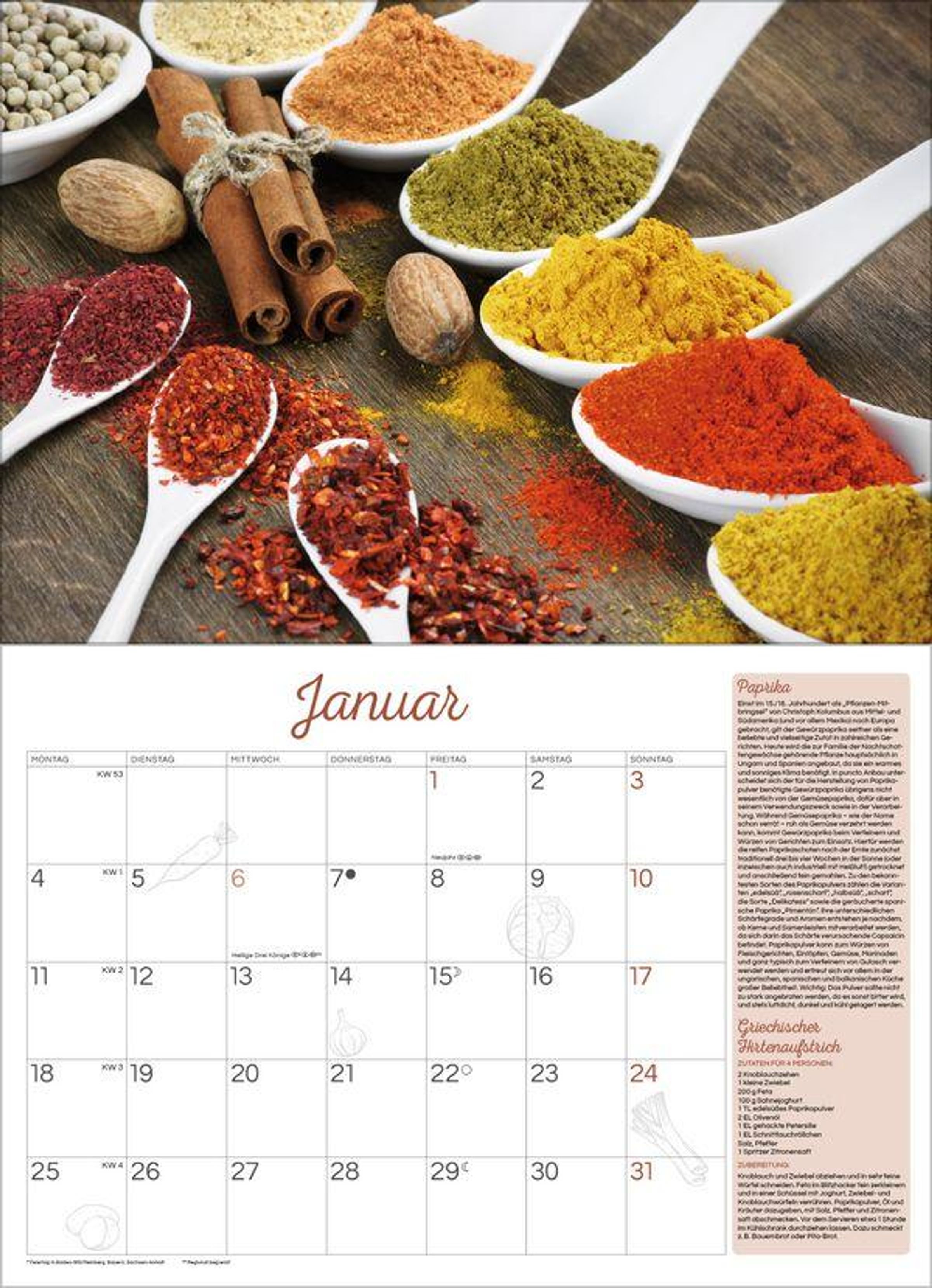 Der praktische Kalender zeigt 12 Stillleben mit Infotexten und Rezepten zu den beliebtesten Kräutern und Gewürzen. Mit viel Platz für Notizen und einer Übersicht mit Ferienterminen.
