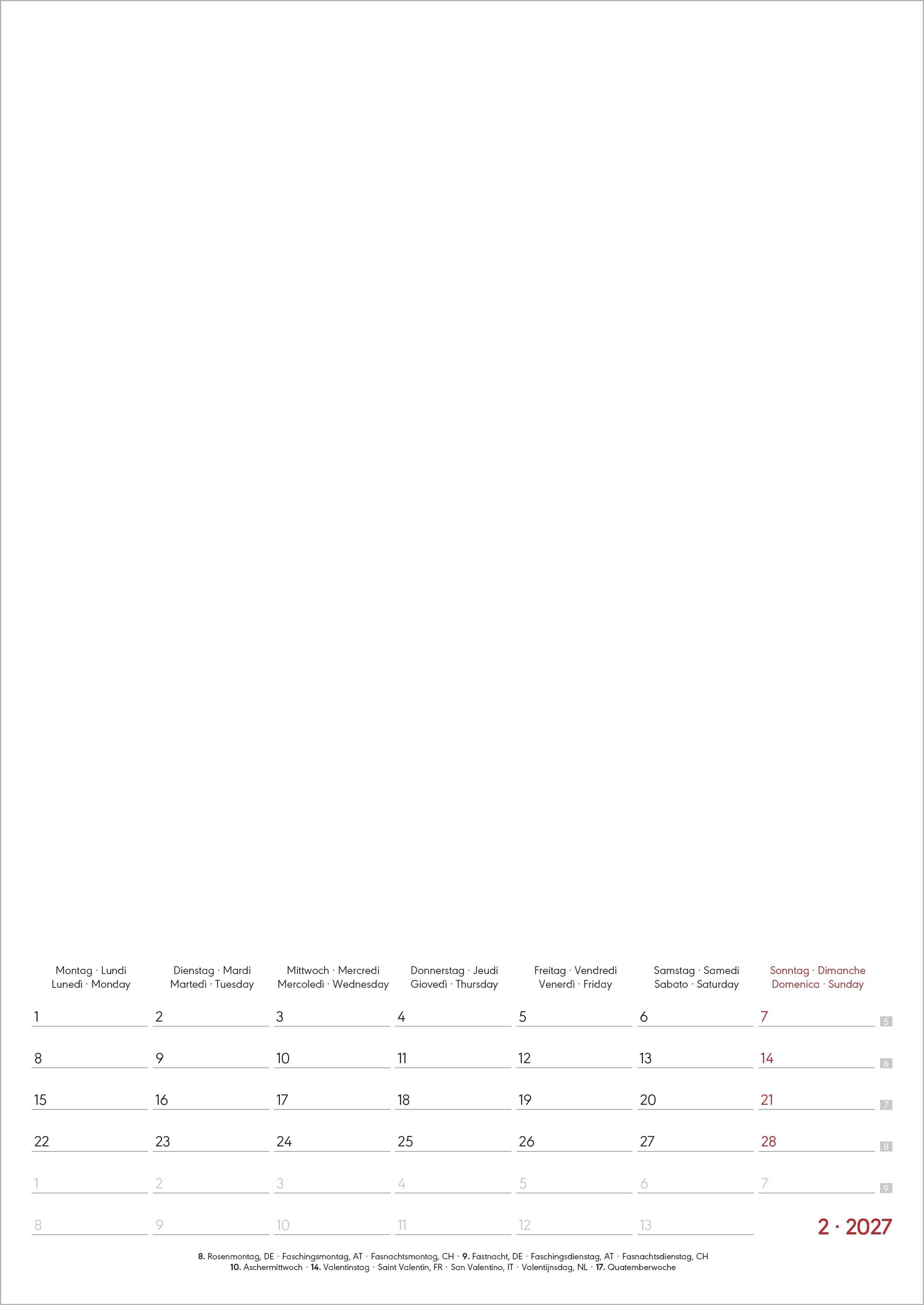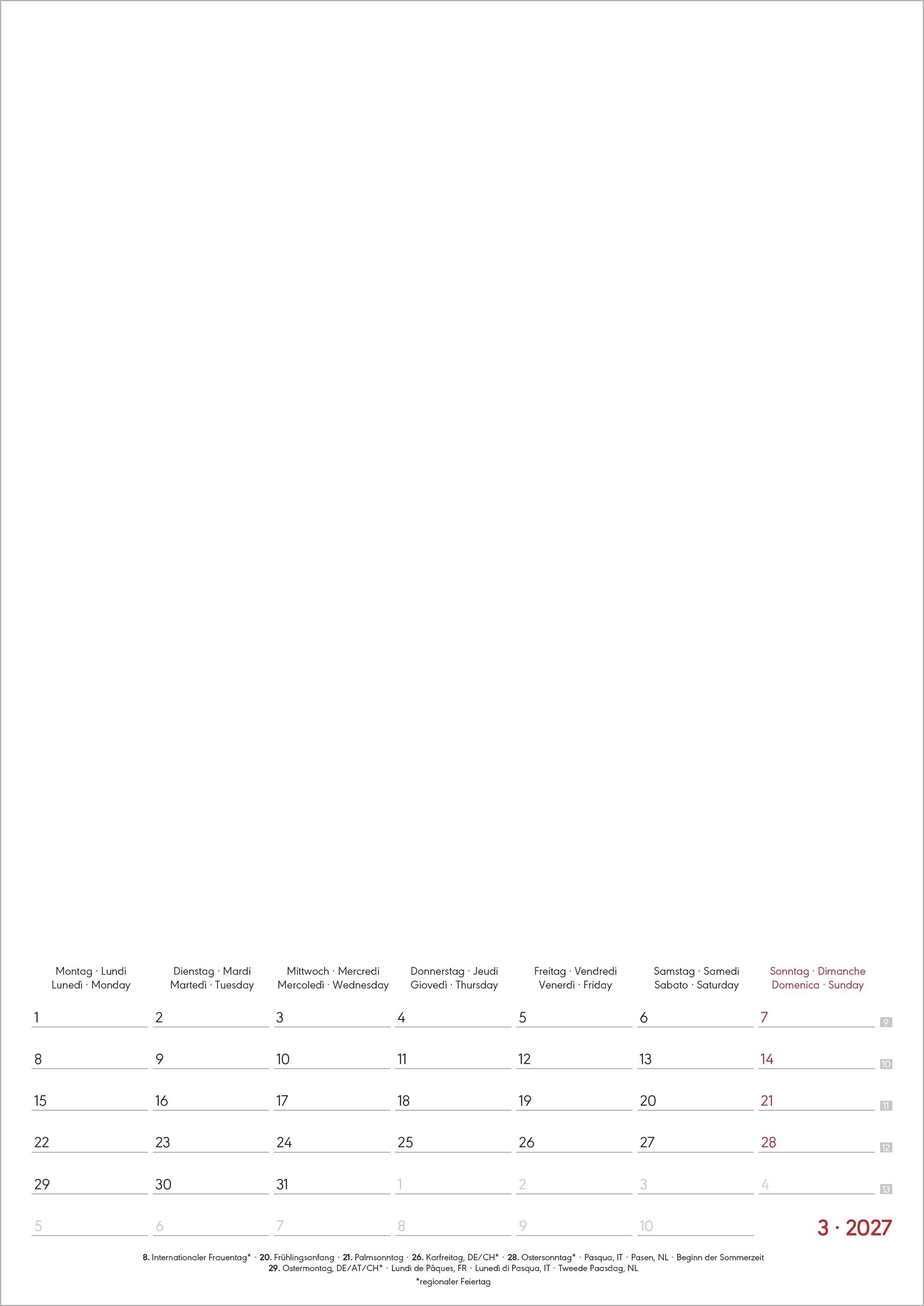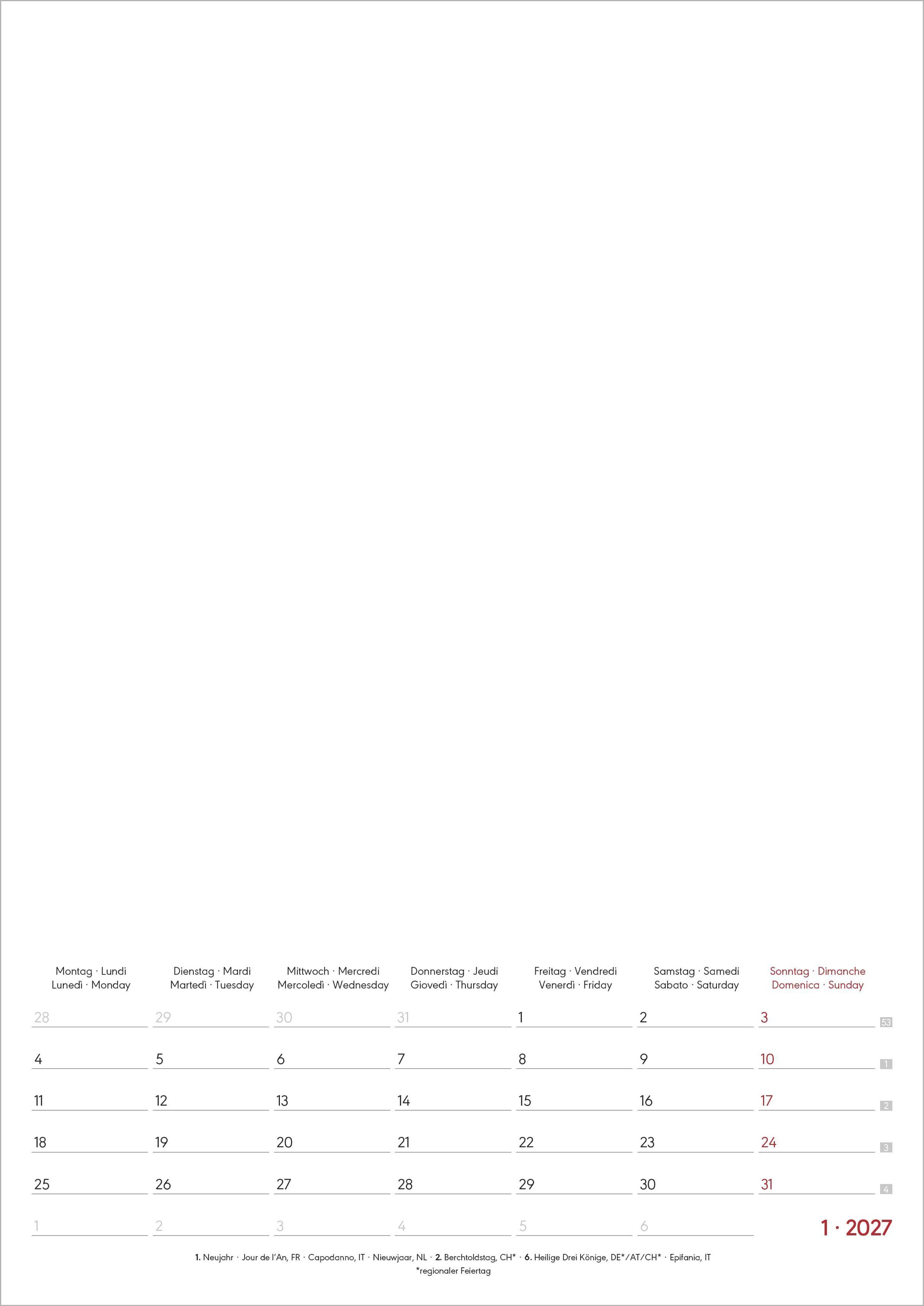 International nutzbar: 4-sprachiges Kalendarium (DE/FR/IT/GB) mit Feiertagen (DE/AT/CH/FR/IT)