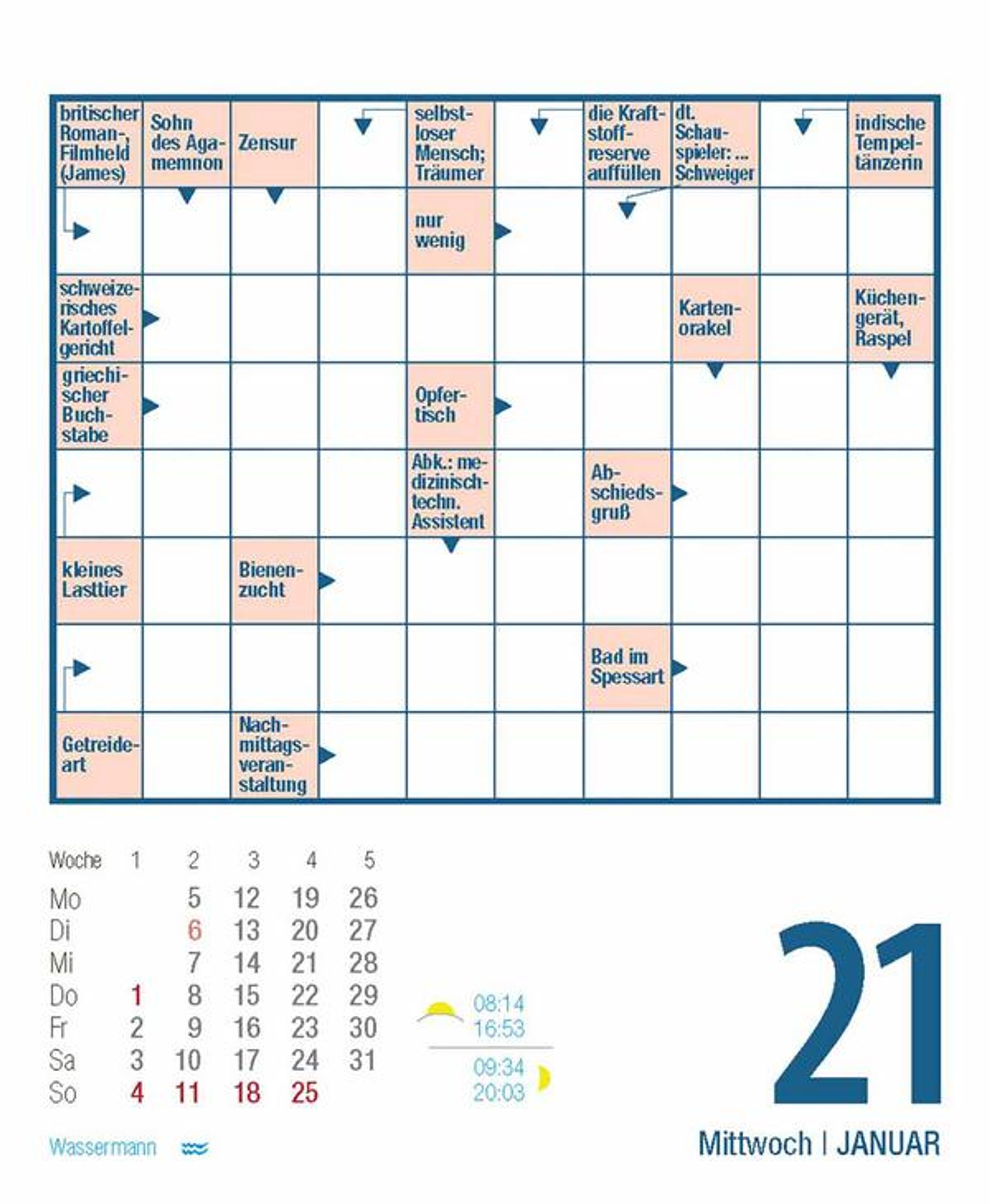 Mit diesem Kalender trainieren Sie täglich Ihre Gehirnzellen und werden mit spannenden Kreuzworträtseln bestens unterhalten. Und wenn Sie mal nicht weiterwissen: Auf der Rückseite finden Sie die Lösung.