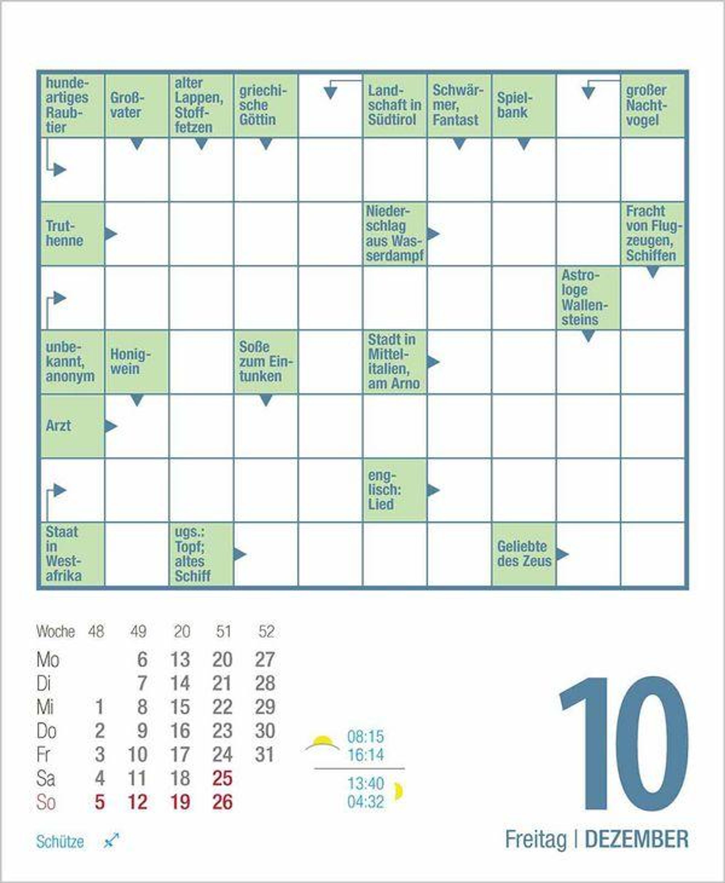 Mit diesem Kalender trainieren Sie täglich Ihre Gehirnzellen und werden mit spannenden Kreuzworträtseln bestens unterhalten. Und wenn Sie mal nicht weiterwissen: Auf der Rückseite finden Sie die Lösung.