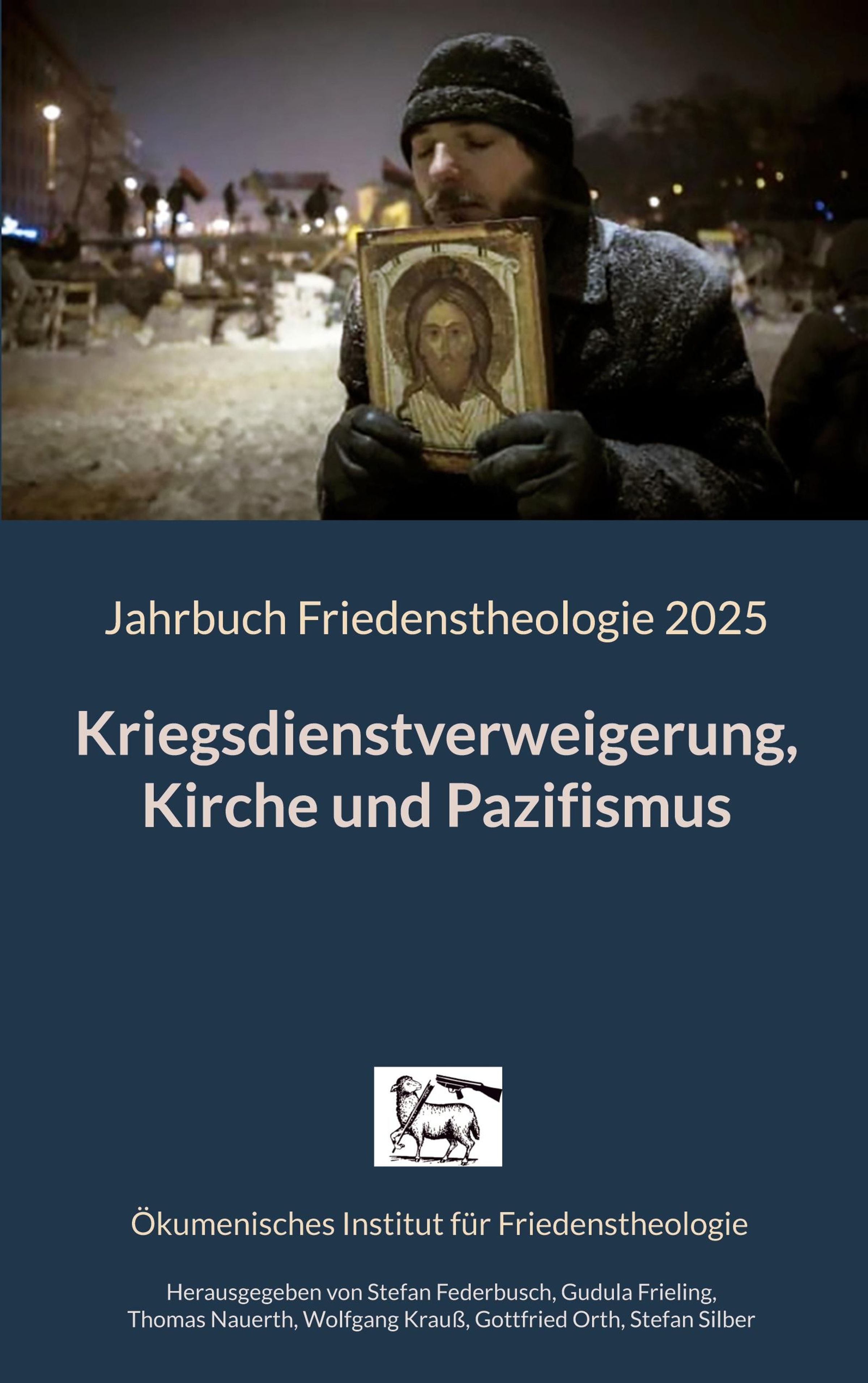 Ein Mann hält ein Ikonenbild draußen im Schnee. Text: „Jahrbuch Friedenstheologie 2025 - Kriegsdienstverweigerung, Kirche und Pazifismus“. Logo mit Lamm und Kreuz., Buch
