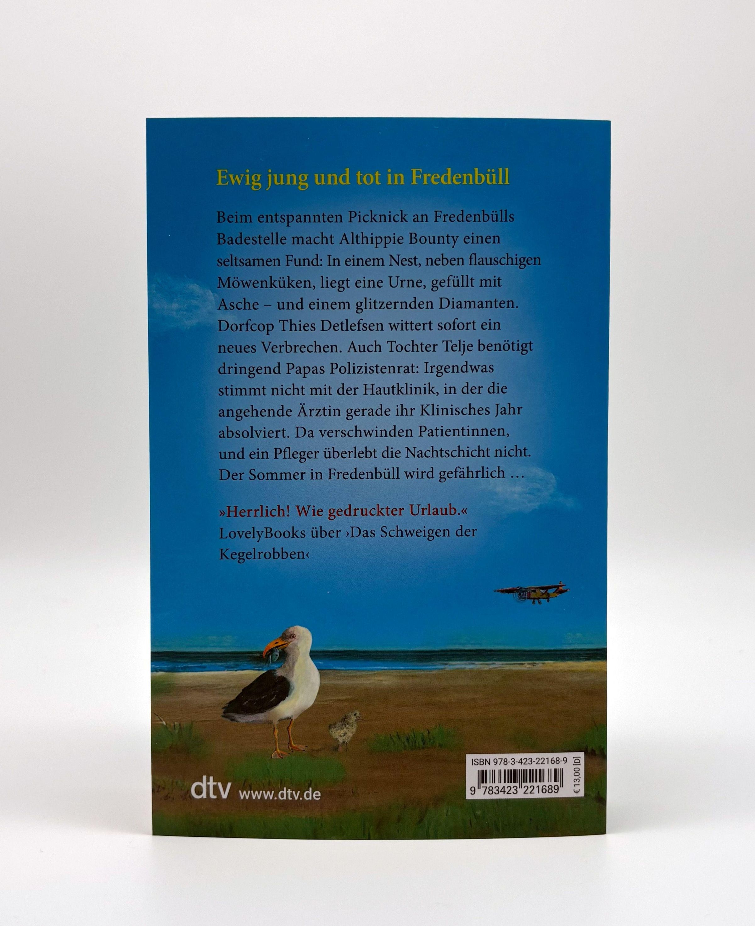 Der entspannte Sommerabend an Fredenbülls Badestelle nimmt für Althippie Bounty und seine Freunde von Stehtisch 2 ein unerwartetes Ende, als sie in einem Möwennest neben flauschigen Küken eine Urne entdecken, gefüllt mit Asche - und einem glitzernden Diamanten. Dorfpolizist Thies Detlefsen wittert sofort ein neues Verbrechen und leitet die Ermittlungen ein.
