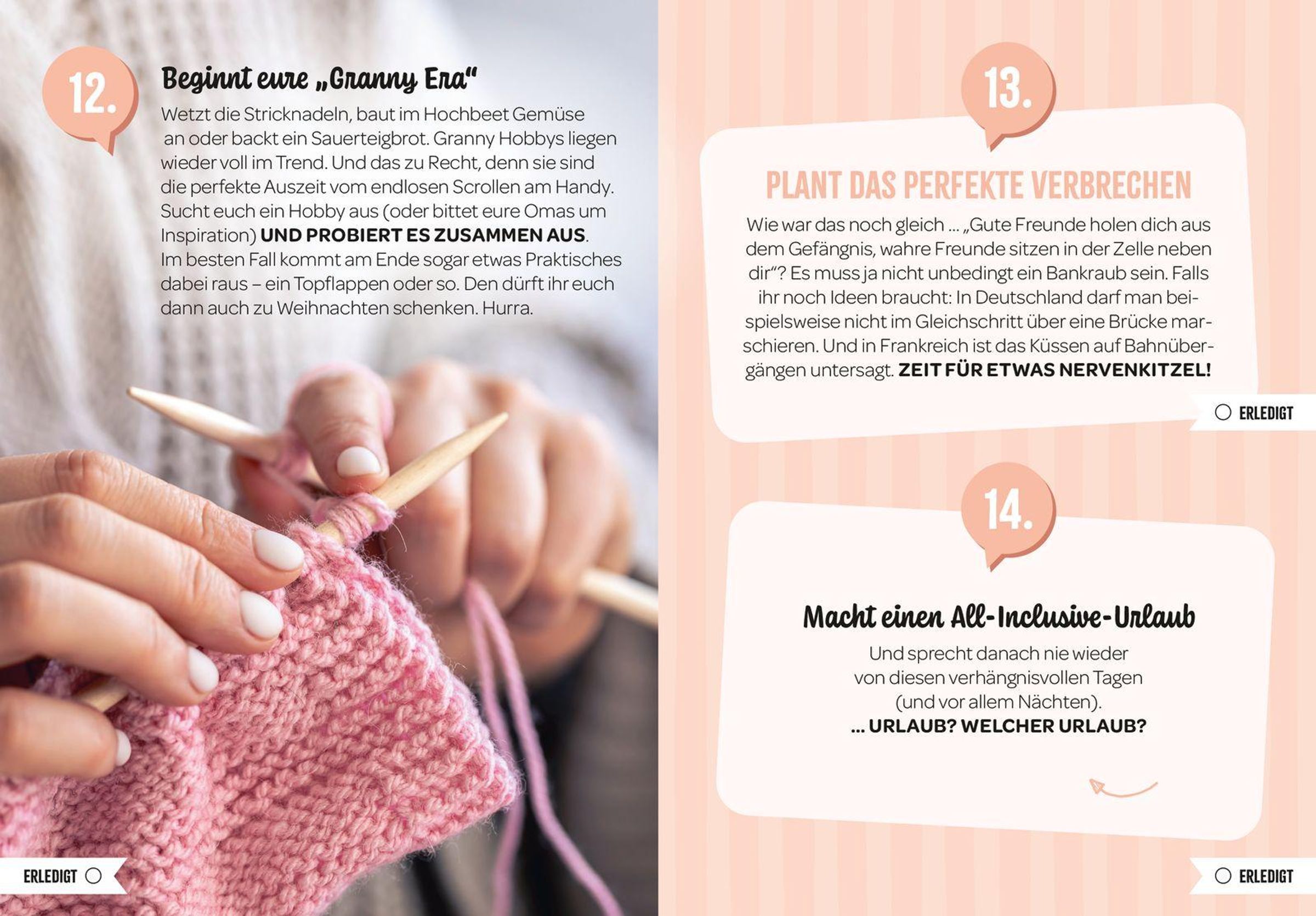 Die moderne Gestaltung mit fröhlichen Fotos und Illustrationen macht das Buch zu einem besonderen Begleiter. Es ist dasperfekte Geschenk für liebste Freundinnen, mit denen man gern noch mehr Zeit verbringen möchte. Jede der 100 abwechslungsreichen Challenges wird ergänzt von einem kleinen "Erledigt"-Kästchen, das abgehakt werden kann, wenn ihr den Punkt in die Tat umgesetzt habt. Im handlichen Buchformat ist diese Bucket List der perfekte Ideengeber, damit Langeweile keine Chance mehr hat.