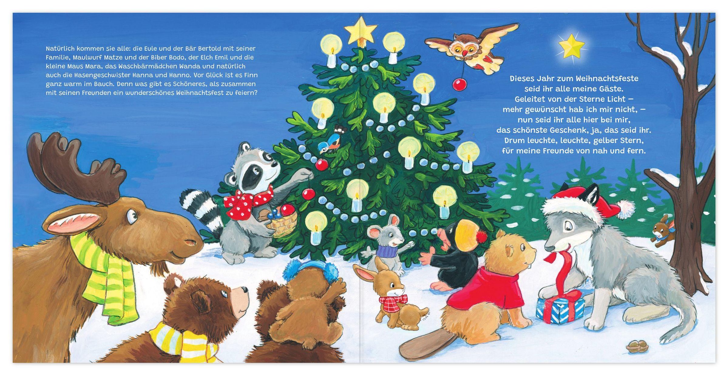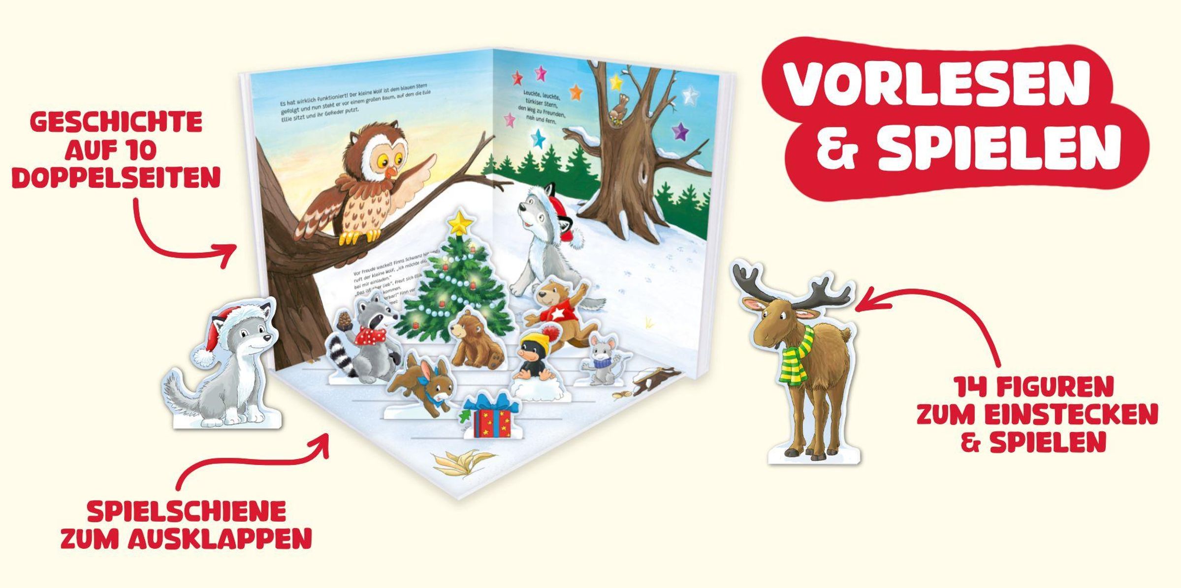 Das Kinderbuch enthält 14 Steckfiguren , die passend zur Geschichte nach und nach herausgenommen werden können. Auf der integrierten Spielschiene lassen sich die Figuren arrangieren und Szenen aus der weihnachtlichen Tiergeschichte nachspielen. Die farbenfroh illustrierten Seiten des Buchs dienen dabei als lebendige Hintergründe.