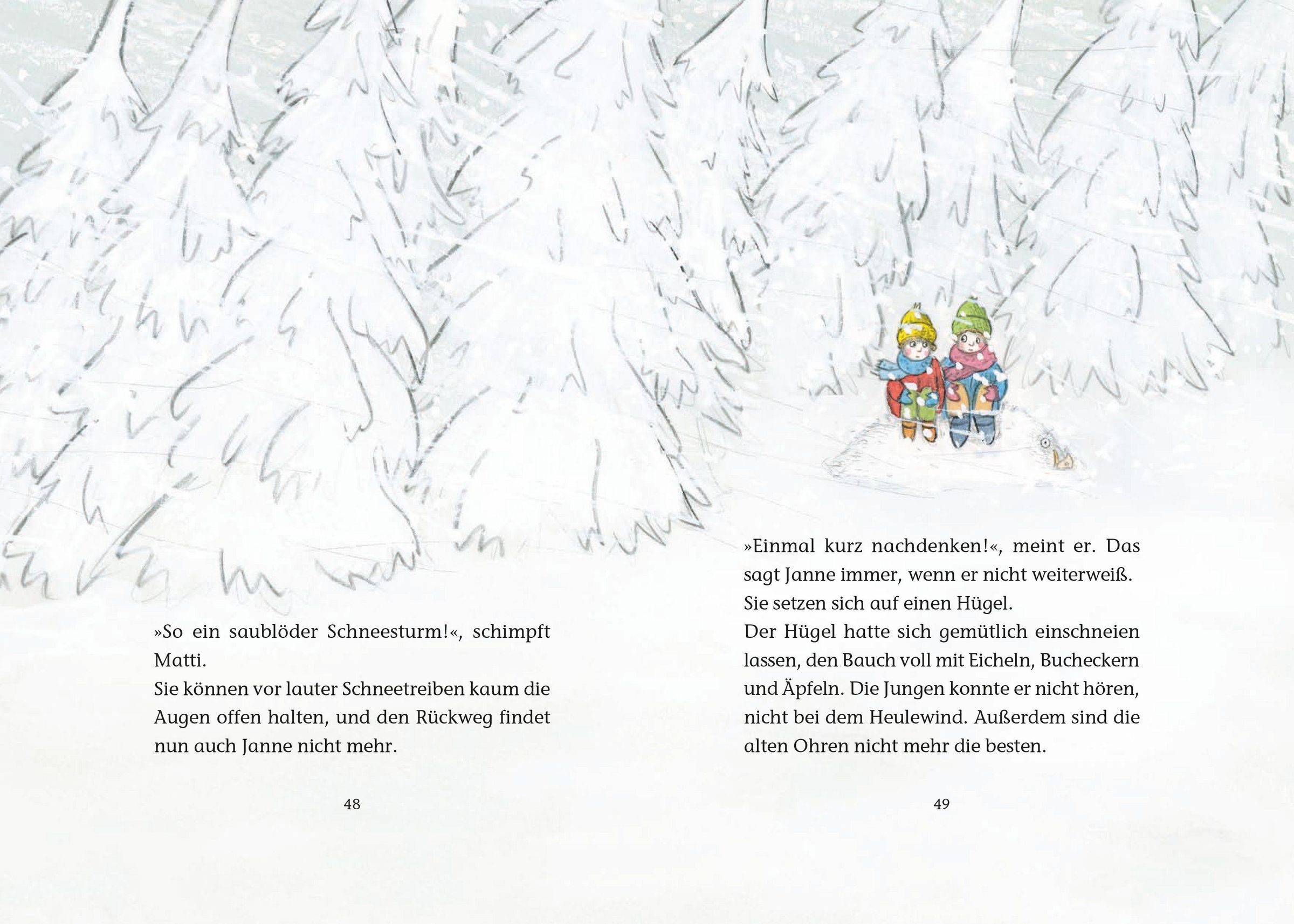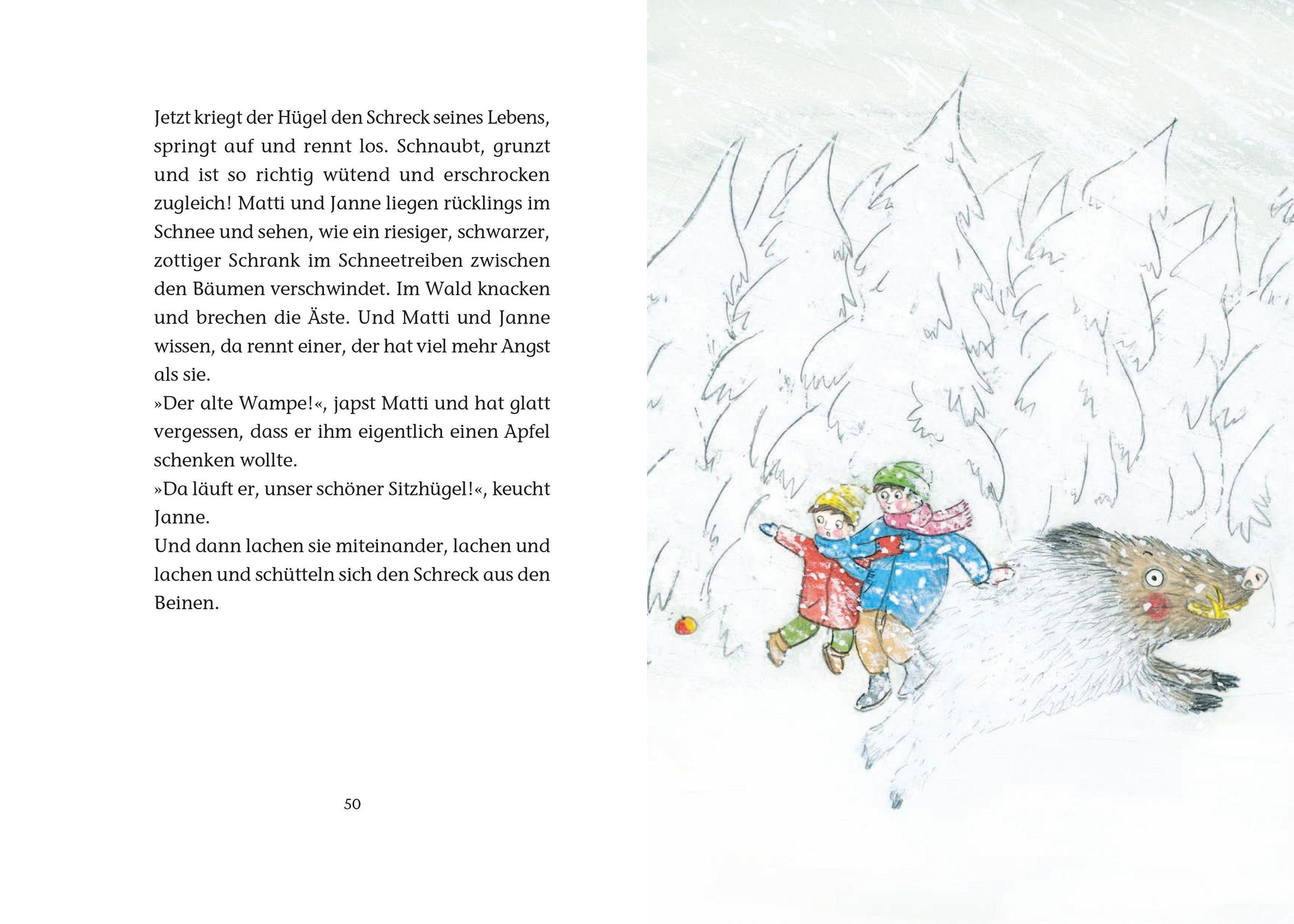 Matti und Janne verbringen die Winterferien bei Tante Olga, die noch mit Holz aus dem Schuppen heizt. Außerdem lebt ganz in ihrer Nähe Wampe, ein alter Keiler, den selbst sie noch nie zu Gesicht bekommen hat. Matti und Janne sind gespannt, ob es ihnen gelingen wird. Schon am zweiten Tag ist es so weit: Im tief verschneiten Winterwald entdecken sie bei einer Futterraufe Wampes Spuren. Hätten sie geahnt, dass sich Wildschweine bei Schnee gerne einschneien lassen, hätten sie sich bestimmt nicht auf den kleinen Hügel gesetzt ... Kristina Andres möchte mithilfe guter und spannender Geschichten möglichst viel Wissenswertes über Tiere und Natur weitergeben. Dazu gehören auch Wildschweine, die immer wieder Gegenstand schauriger Erzählungen sind.