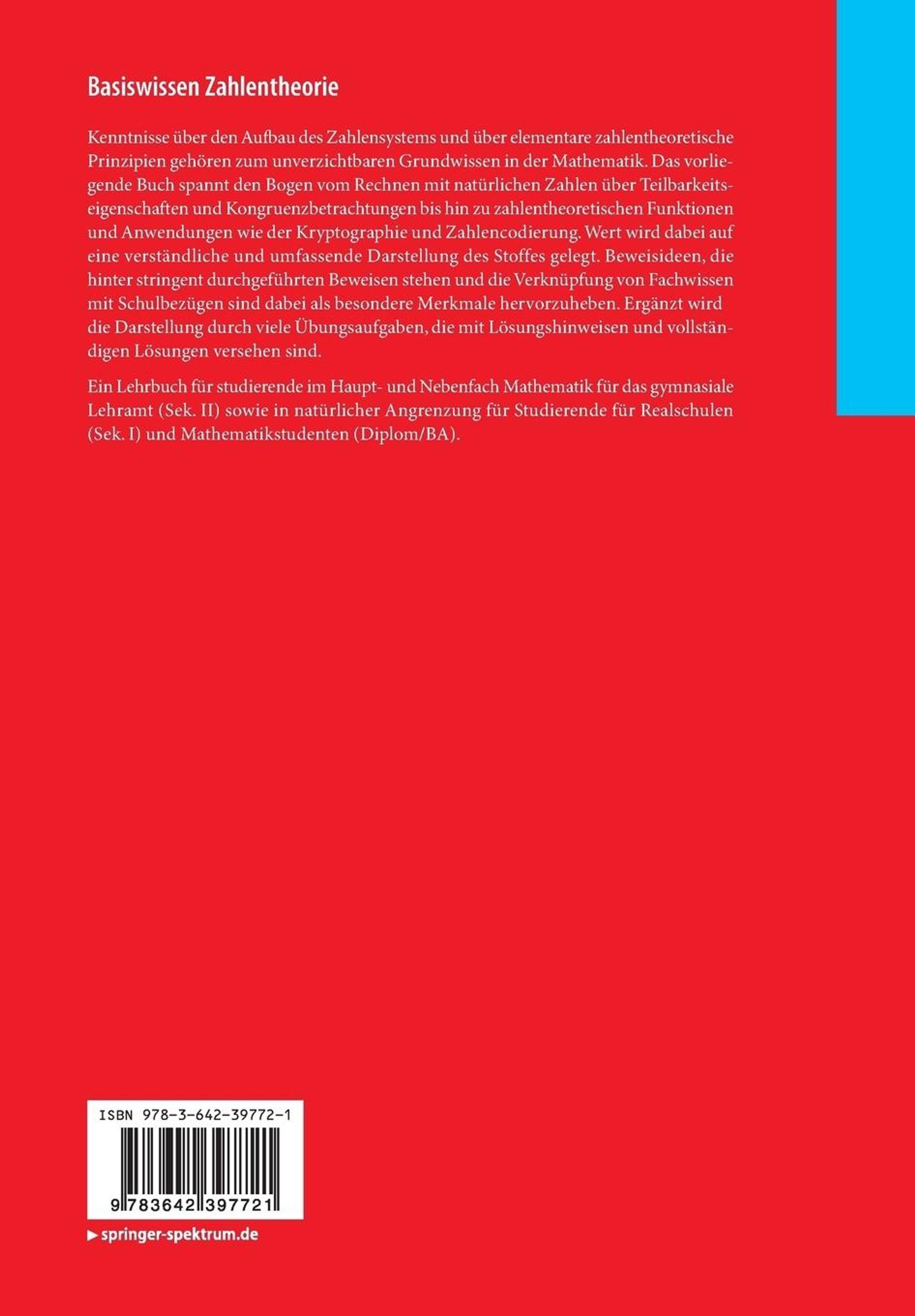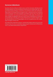 Kenntnisse über den Aufbau des Zahlensystems und über elementare zahlentheoretische Prinzipien gehören zum unverzichtbaren Grundwissen in der Mathematik. Das vorliegende Buch spannt den Bogen vom Rechnen mit natürlichen Zahlen über Teilbarkeitseigenschaften und Kongruenzbetrachtungen bis hin zu zahlentheoretischen Funktionen und Anwendungen wie der Kryptographie und Zahlencodierung. Wert wird dabei auf eine verständliche und umfassende Darstellung des Stoffes gelegt. Beweisideen, die hinter stringent durchgeführten Beweisen stehen und die Verknüpfung von Fachwissen mit Schulbezügen sind dabei als besondere Merkmale hervorzuheben. Ergänzt wird die Darstellung durch viele Übungsaufgaben, die mit Lösungshinweisen und vollständigen Lösungen versehen sind.