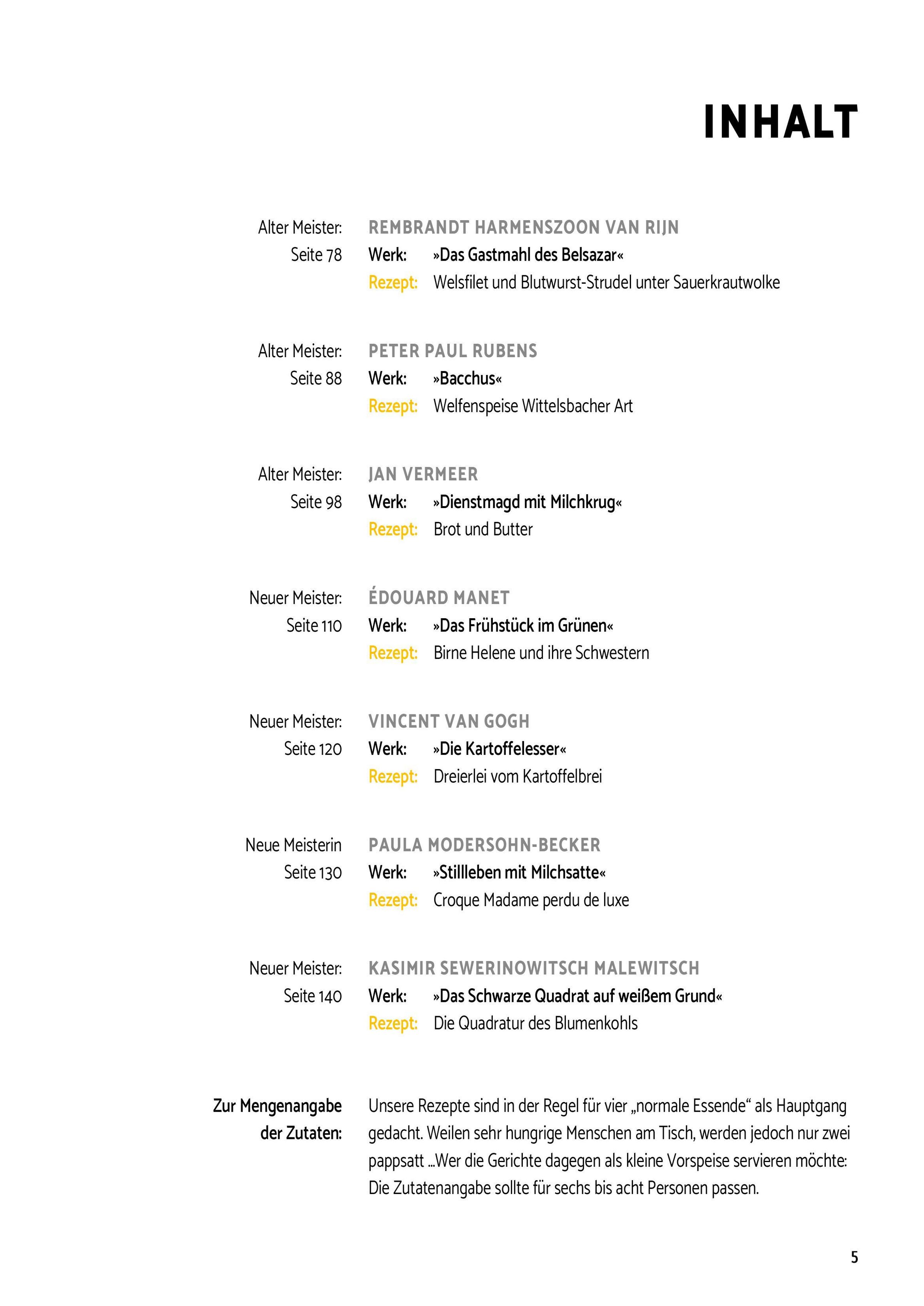 "KUNST ESSEN" ist ein faszinierender Bildband, der Koch- und Kunstbuch vereint. Im Mittelpunkt steht das Essen als kulturprägender Bestandteil der Kunst. In 15 Kapiteln werden bedeutende Werke der Kunstgeschichte vom Mittelalter bis heute neu interpretiert und ihre Meisterinnen und Meister vorgestellt. Inspiriert von den Gemälden entstehen Gerichte mit Rezepten zum Nachkochen. Die Speisen werden als eigenständige, fotografisch inszenierte Gesamtkunstwerke präsentiert, ganz anders als jeder herkömmliche Serviervorschlag! Das Buch verbindet klassische Gemälde, praktische Küchentipps, humorvolle Texte und innovative Food-Fotografie zu einem einzigartigen geistigen und sinnlichen Vergnügen. Es soll Lust machen auf Museumsbesuche, Kochen und Kunst an sich - sei es an der Leinwand, mit der Kamera oder am Herd.