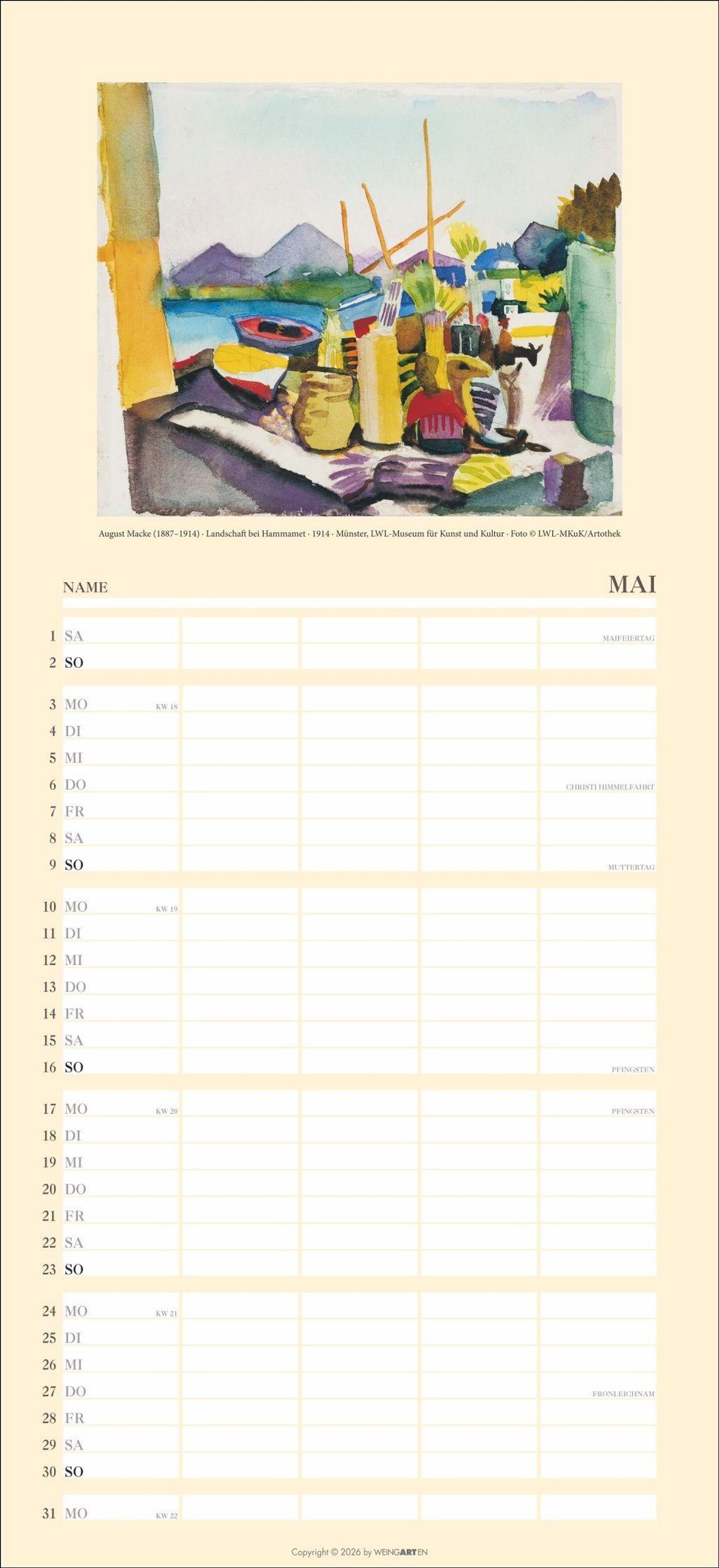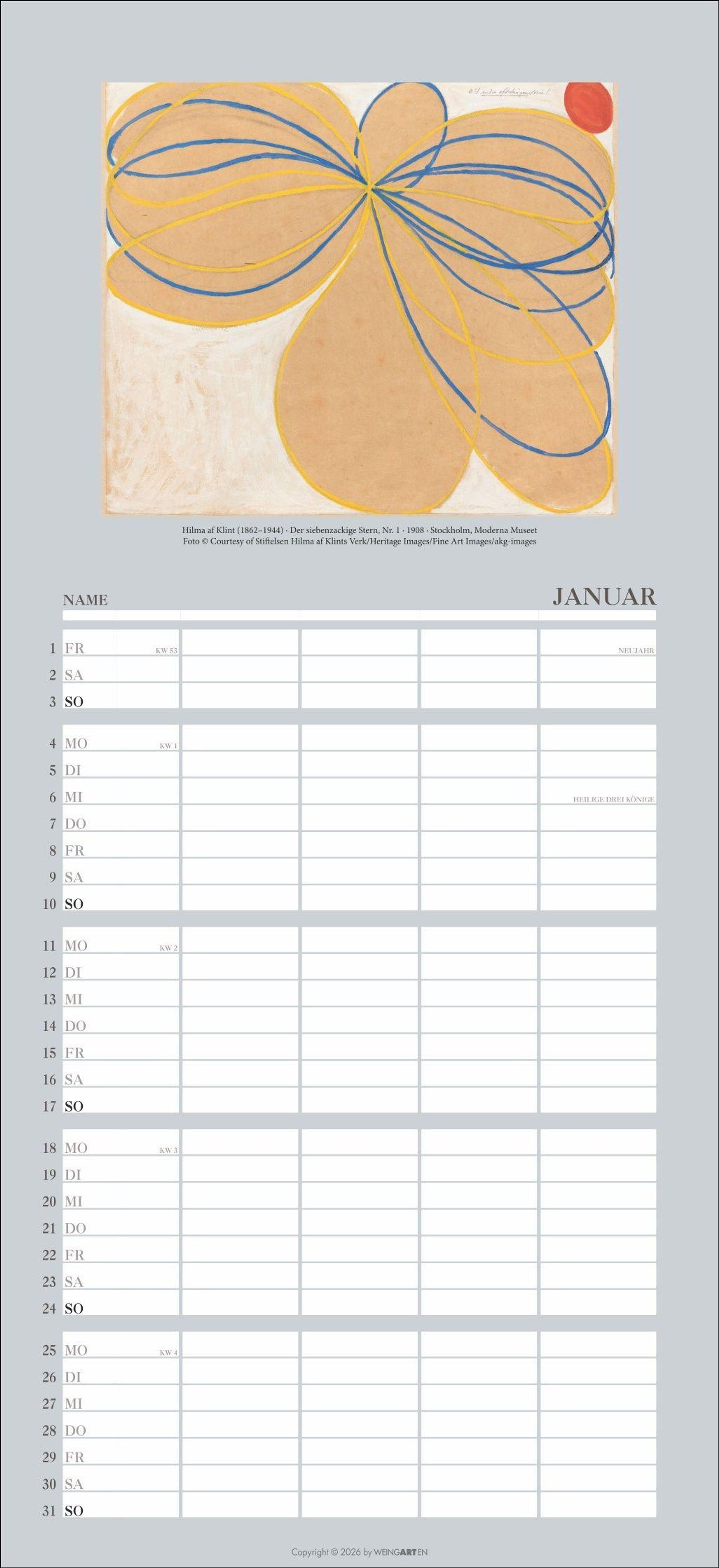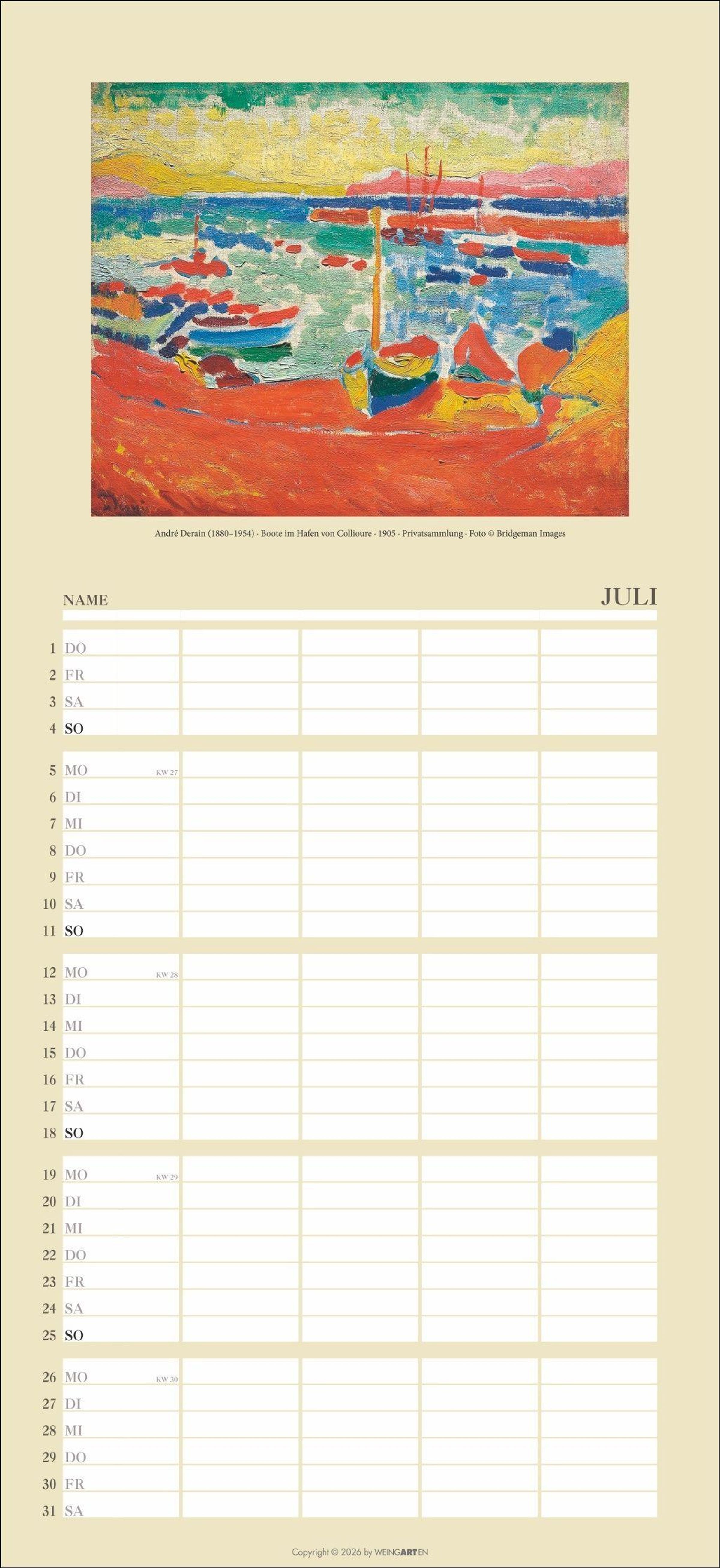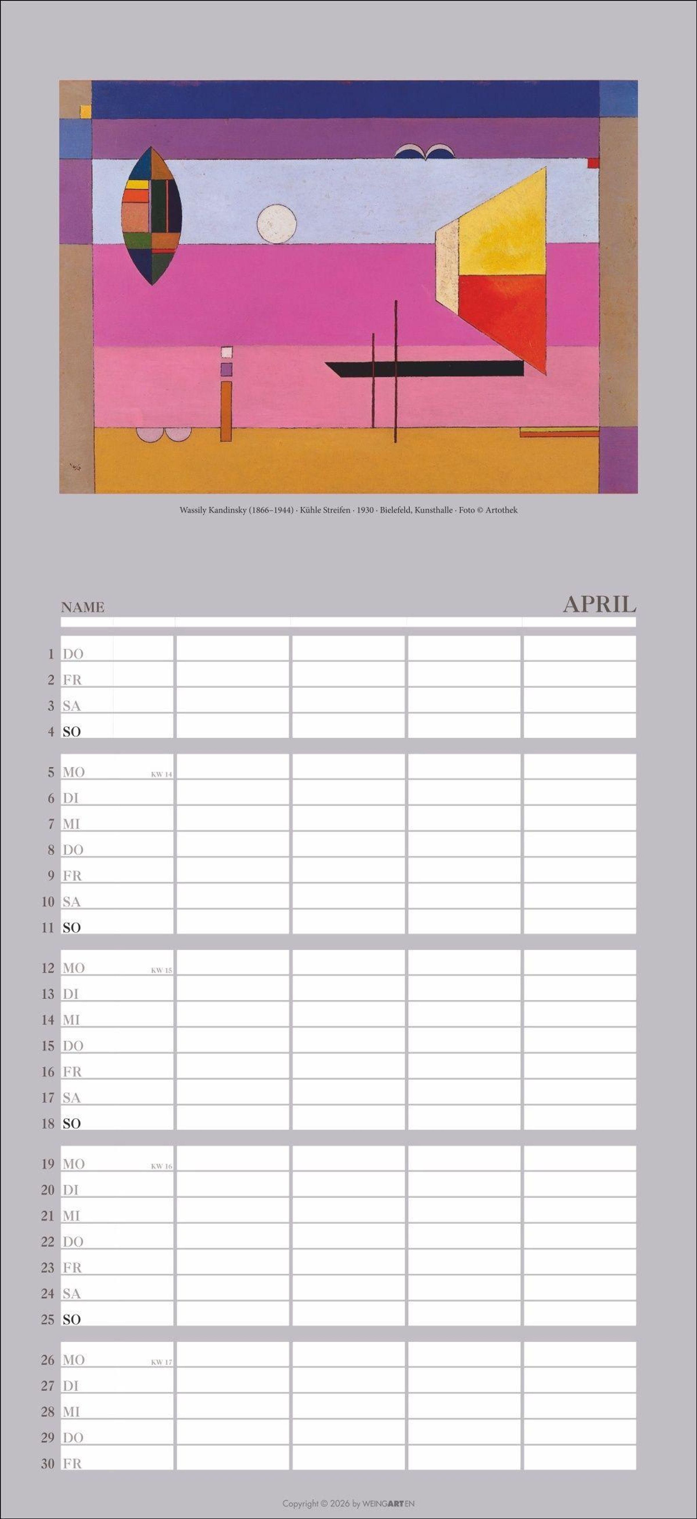 Farbenfrohe Organisationshilfe für den täglichen Termin-Wirrwarr: Terminkalender mit 5 Spalten und einem Kunstwerk pro Monat