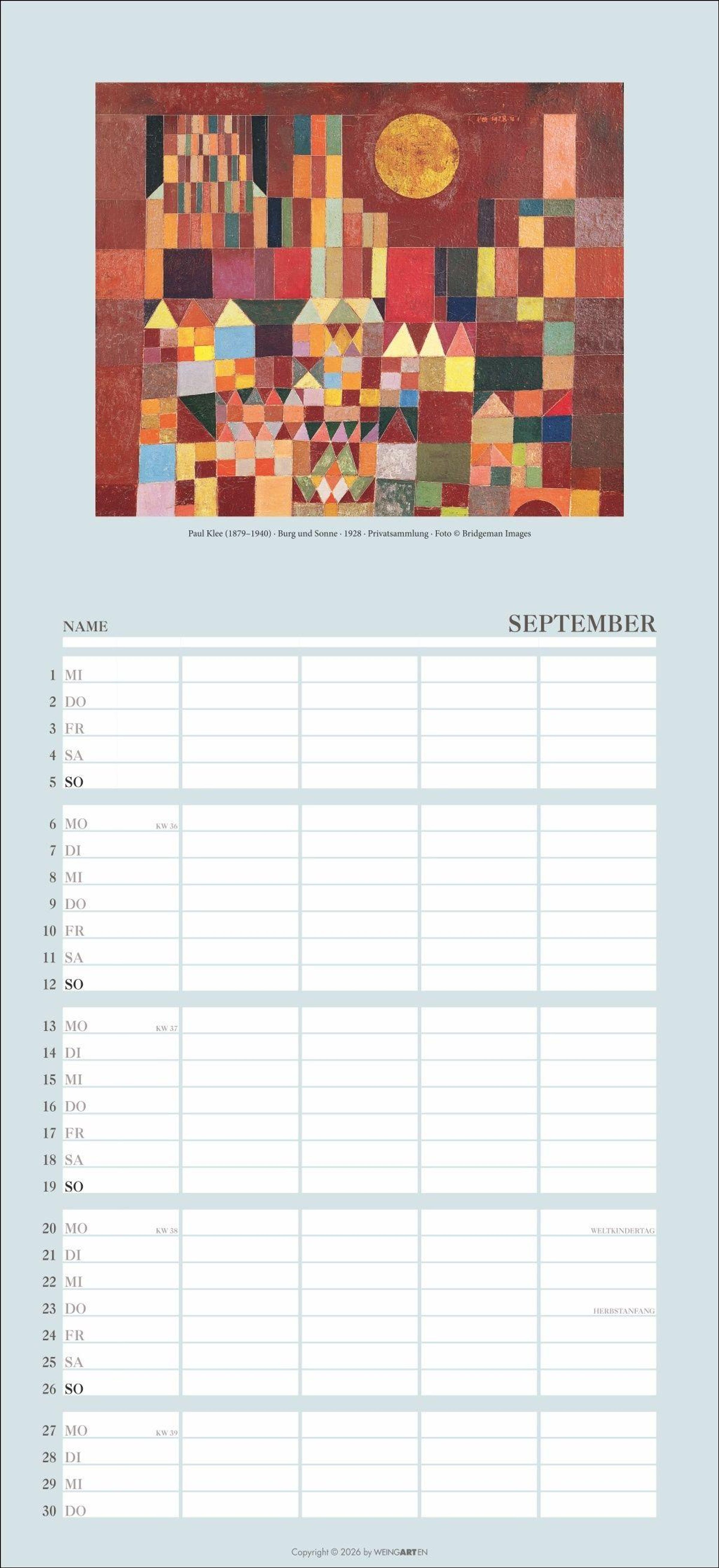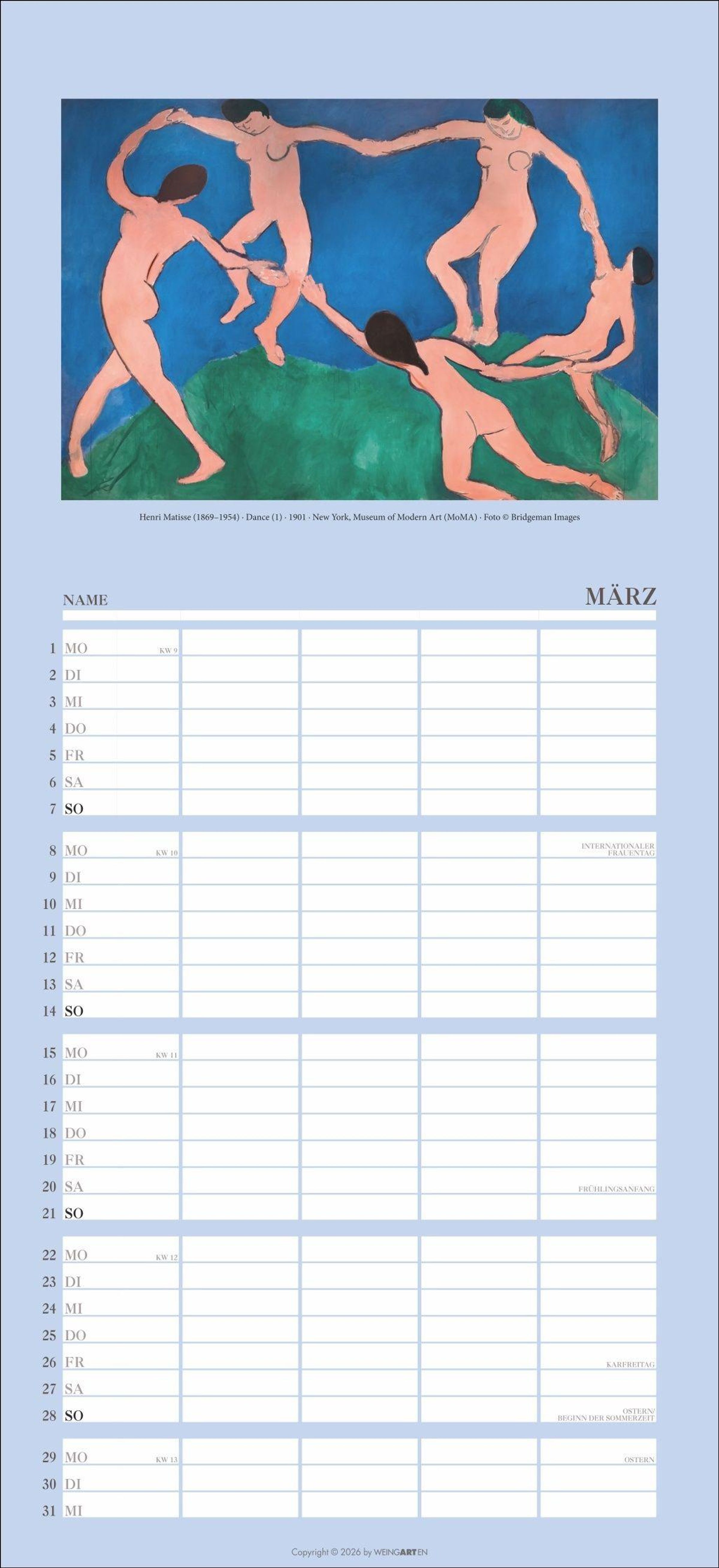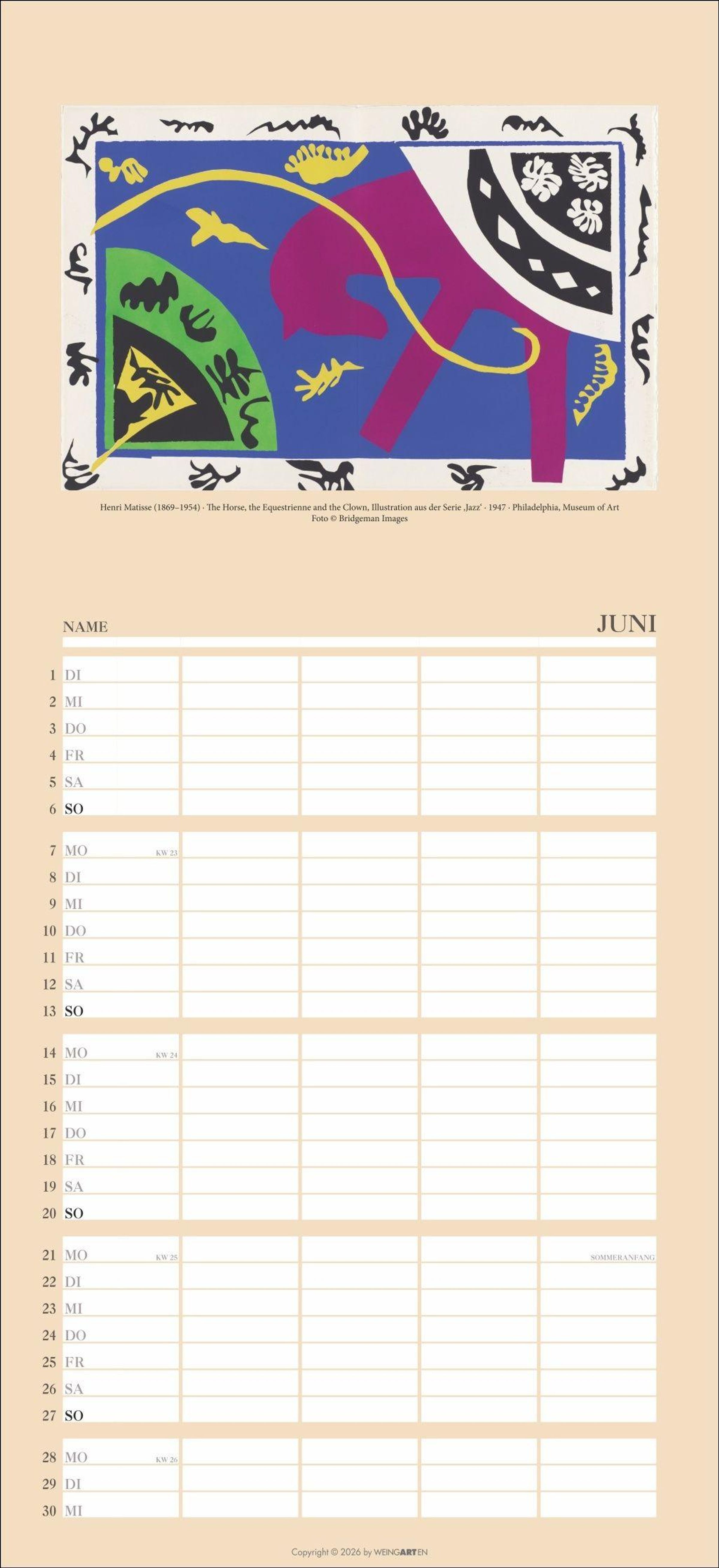 Farbenfrohe Organisationshilfe für den täglichen Termin-Wirrwarr: Terminkalender mit 5 Spalten und einem Kunstwerk pro Monat