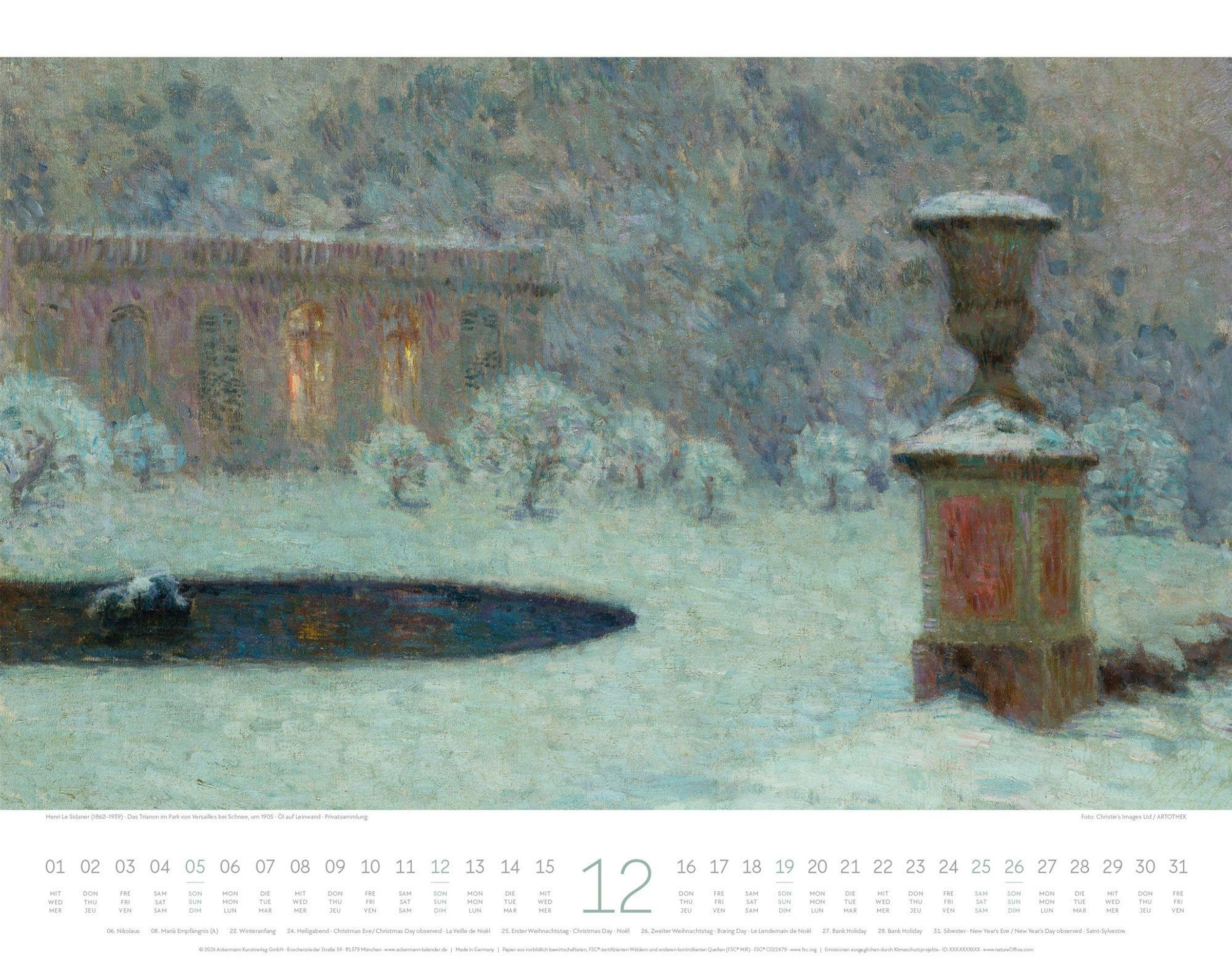 Lassen Sie sich mit dem Kunstkalender "Kunstwerk Garten" Monat für Monat von der stillen Schönheit und der lebendigen Vielfalt der Gärten verzaubern. Zwölf kunstvolle Gemälde großer Meister fangen das Licht, die Farben und die zarte Harmonie blühender Landschaften auf einzigartige Weise ein. So wird jeder Garten zum Sinnbild für Ruhe, Inspiration und künstlerische Freiheit. Von Impressionismus bis Expressionismus über Modernisme bis Jugendstil deckt dieser Kalender herausragende Gartendarstellungen der frühen Epochen moderner Kunst ab.