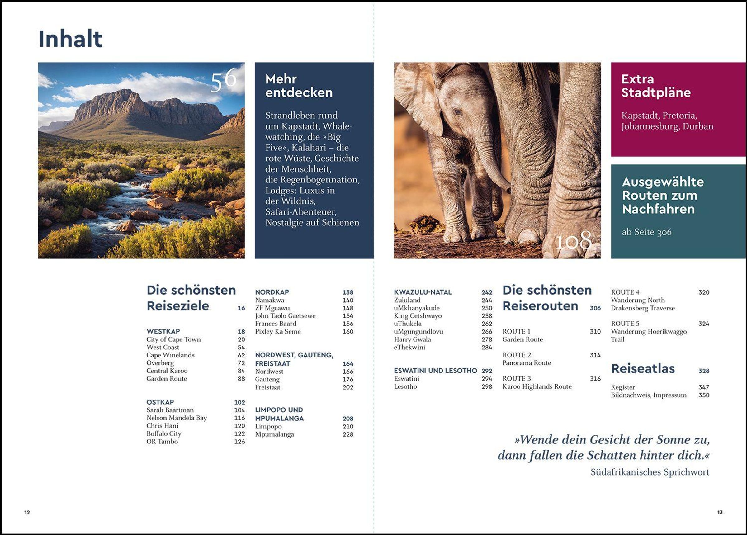 Abenteuer, Kultur und Natur - Südafrika hat alles! Nationalparke wie Kruger, Addo Elephant und Kgalagadi bieten unvergessliche Safari-Erlebnisse. Städte wie Kapstadt, Johannesburg oder Pretoria bestechen durch ihre lebendige Atmosphäre. Alle wichtigen Highlights des Landes werden in dem großen KUNTH Reisebuch "Unterwegs in Südafrika" vorgestellt. Bilder lassen staunen über die Vielfalt des Landes zwischen Urbanität, langer Historie, spektakulärer Landschaft und artenreicher Tierwelt. Themenseiten erzählen von berühmten Persönlichkeiten Südafrikas wie Nelson Mandela und Nadine Gordimer, bieten Wissenswertes zu den Big Five und weiteren heimischen Tieren, und berichten von den Traditionen verschiedener Ethnien. Mit fünf Routenvorschlägen - darunter zwei Trekkingtouren -, Stadtplänen und einem detaillierten Reiseatlas lässt sich die Reisevorbereitung erleichtern.