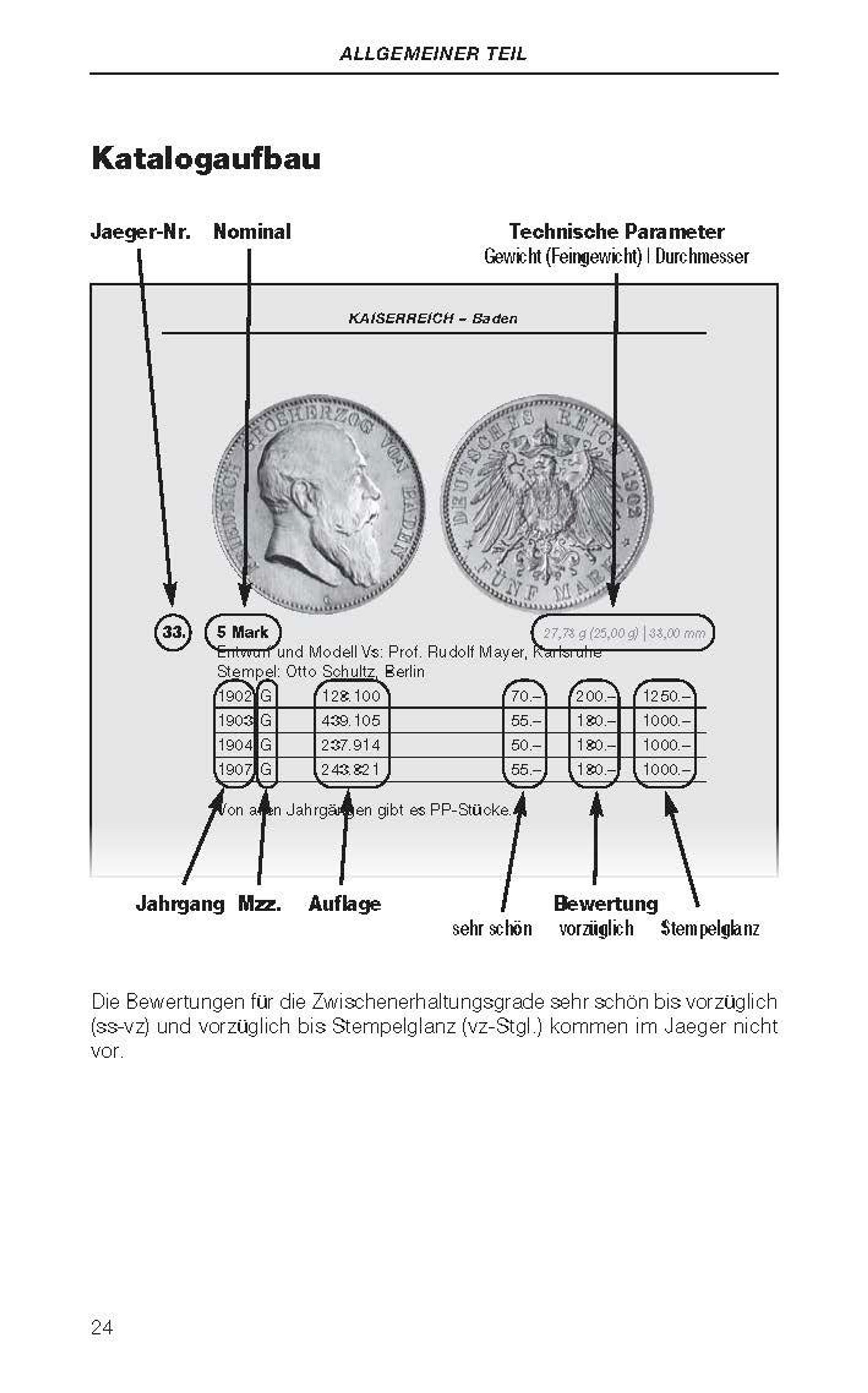 Keine Preislisten und keine Auktionskataloge, die nicht nach den Katalognummern des "Jaeger" zitieren. Ein Standardwerk, das erstmals 1942 erschienen und seitdem das Grundlagenwerk für Münzhandel und Sammler ist und ein numismatischer Bestseller, von dem mittlerweile mehrere hunderttausend Exemplare verkauft wurden. Man kommt nicht an ihm vorbei, wenn man deutsche Münzen seit der Gründung des Kaiserreichs präzise bestimmen und bewerten möchte. Der "Jaeger" dokumentiert komplett alle Epochen der Mark-Währung in Deutschland einschließlich seiner Kolonien und Besatzungsausgaben, von der Schaffung der Goldwährung 1871 bis hin zur goldenen Abschiedsmark der Deutschen Bundesbank aus dem Jahr 2001. Ebenso erfasst sind die deutschen Euro-Kursmünzen, die "Starter-Kits", die deutschen Euro-Kursmünzensätze und die deutschen Euro-Gedenkmünzen in Gold und Silber. Mit sehr vielen Abbildungen - alle in Originalgröße - mit Einleitungstexten zur Geschichte, Übersichtstabellen zu jedem Gebiet und mit aktuellen, exakten Auflagezahlen. Alle Münzen, inklusive der neuesten deutschen Euro-Prägungen, sind fachmännisch bestimmt und in Euro in mehreren Erhaltungsgraden aktuell bewertet.