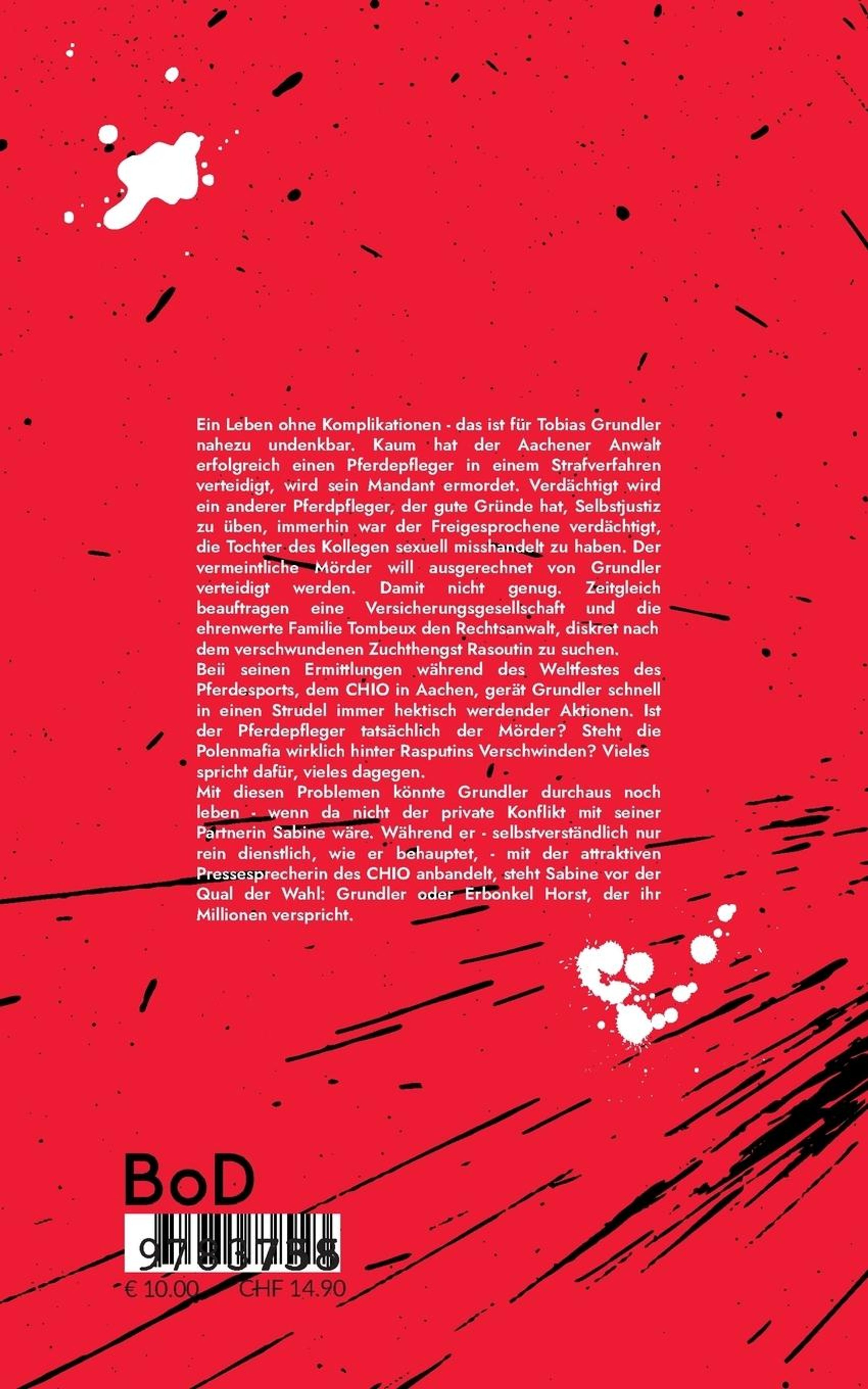 Ein Leben ohne Komplikationen - das ist für Tobias Grundler nahezu undenkbar. Kaum hat der Aachener Anwalt erfolgreich einen Pferdepfleger in einem Strafverfahren verteidigt, wird sein Mandant ermordet. Verdächtigt wird ein anderer Pferdpfleger, der gute Gründe hat, Selbstjustiz zu üben, immerhin war der Freigesprochene verdächtigt, die Tochter des Kollegen sexuell misshandelt zu haben. Der vermeintliche Mörder will ausgerechnet von Grundler verteidigt werden. Damit nicht genug. Zeitgleich beauftragen eine Versicherungsgesellschaft und die ehrenwerte Familie Tombeux den Rechtsanwalt, diskret nach dem verschwundenen Zuchthengst Rasoutin zu suchen. Beii seinen Ermittlungen während des Weltfestes des Pferdesports, dem CHIO in Aachen, gerät Grundler schnell in einen Strudel immer hektisch werdender Aktionen. Ist der Pferdepfleger tatsächlich der Mörder? Steht die Polenmafia wirklich hinter Rasputins Verschwinden? Vieles spricht dafür, vieles dagegen. Mit diesen Problemen könnte Grundler durchaus noch leben - wenn da nicht der private Konflikt mit seiner Partnerin Sabine wäre. Während er - selbstverständlich nur rein dienstlich, wie er behauptet, - mit der attraktiven Pressesprecherin des CHIO anbandelt, steht Sabine vor der Qual der Wahl: Grundler oder Erbonkel Horst, der ihr Millionen verspricht.