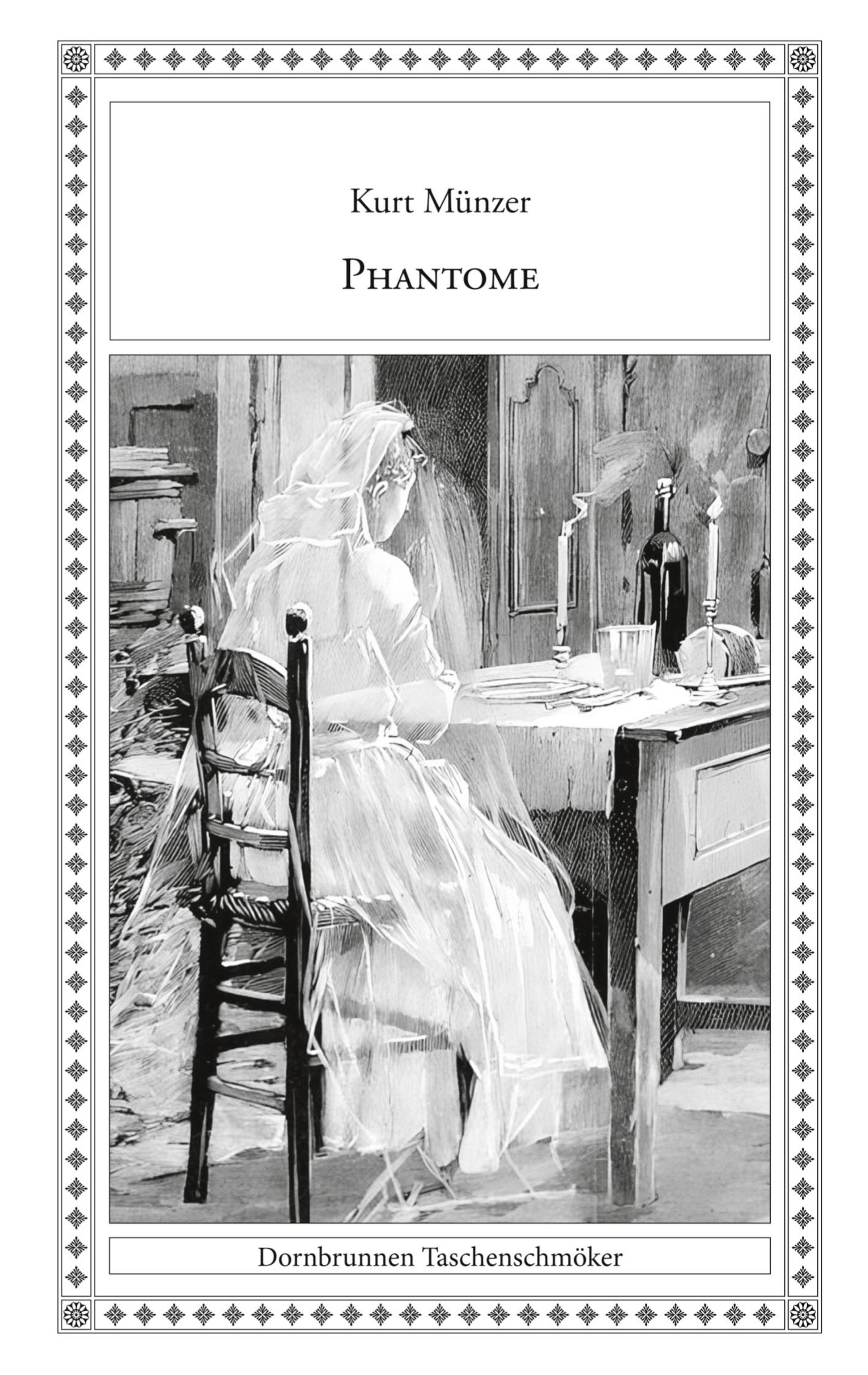 Kurt Münzer: "Phantome". Dornbrunnen Taschenschmöker. Illustration: Frau in Schleier am Tisch mit Kerzen., Buch