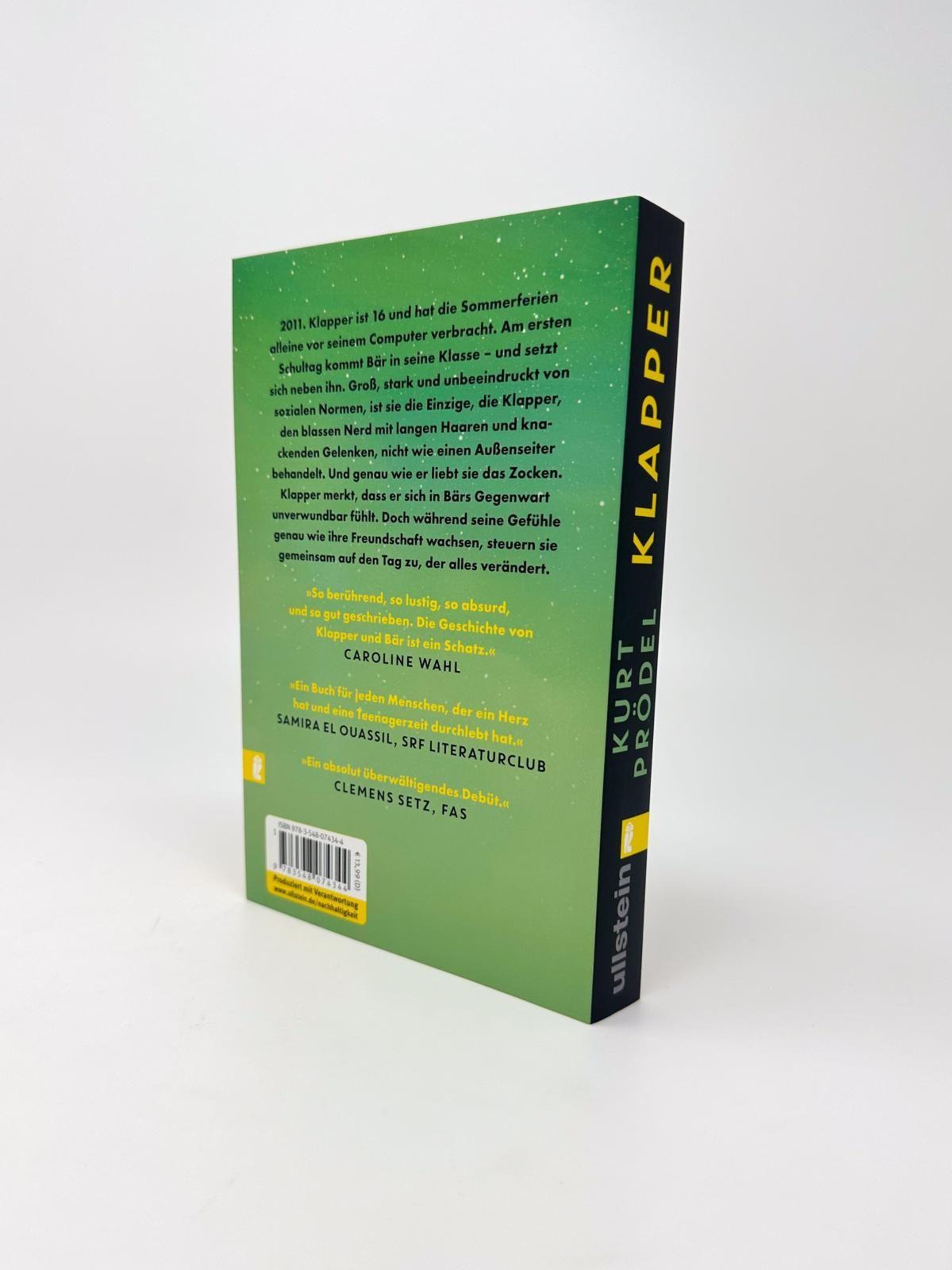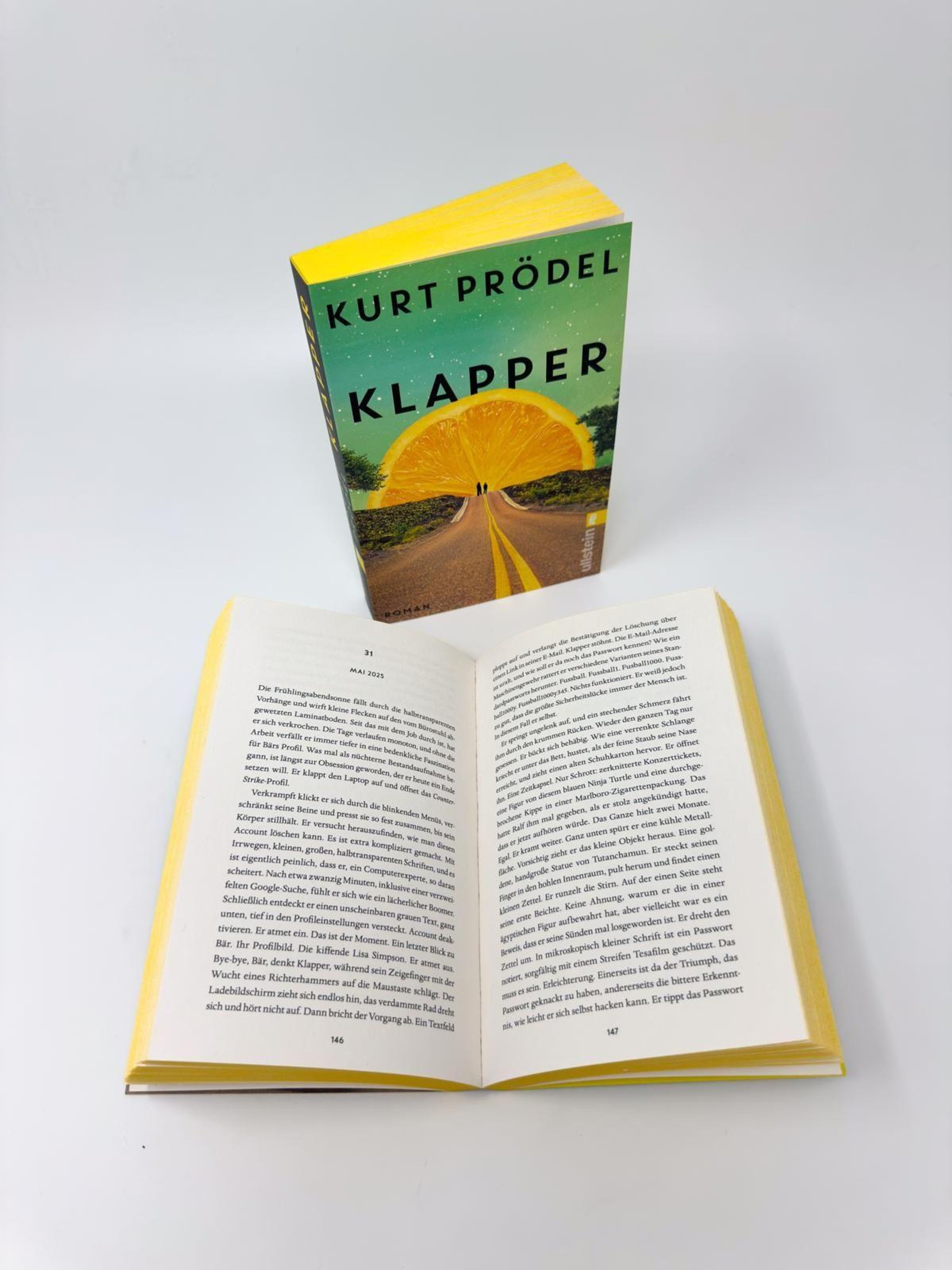 KURT PRÖDEL, KLAPPER, ROMAN. Straße führt zu riesiger Zitronenscheibe im Hintergrund, zwei Menschen darauf. Logo „ullstein“., Buch