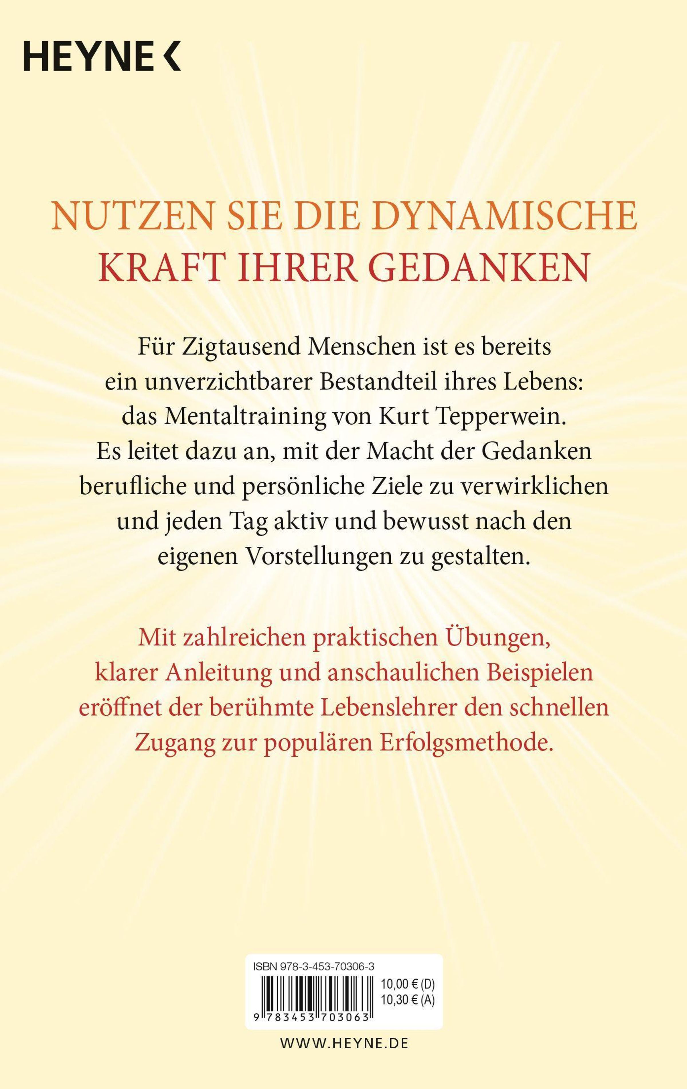 Zigtausend Menschen haben mit dem Mentaltraining von Kurt Tepperwein erlebt, dass sich mit der Macht der Gedanken berufliche und persönliche Ziele verwirklichen lassen. Sie gestalten jeden Tag aktiv und bewusst nach den eigenen Vorstellungen. Mit zahlreichen praktischen Übungen, klarer Anleitung und anschaulichen Beispielen eröffnet der berühmte Lebenslehrer den schnellen Zugang zur populären Erfolgsmethode.