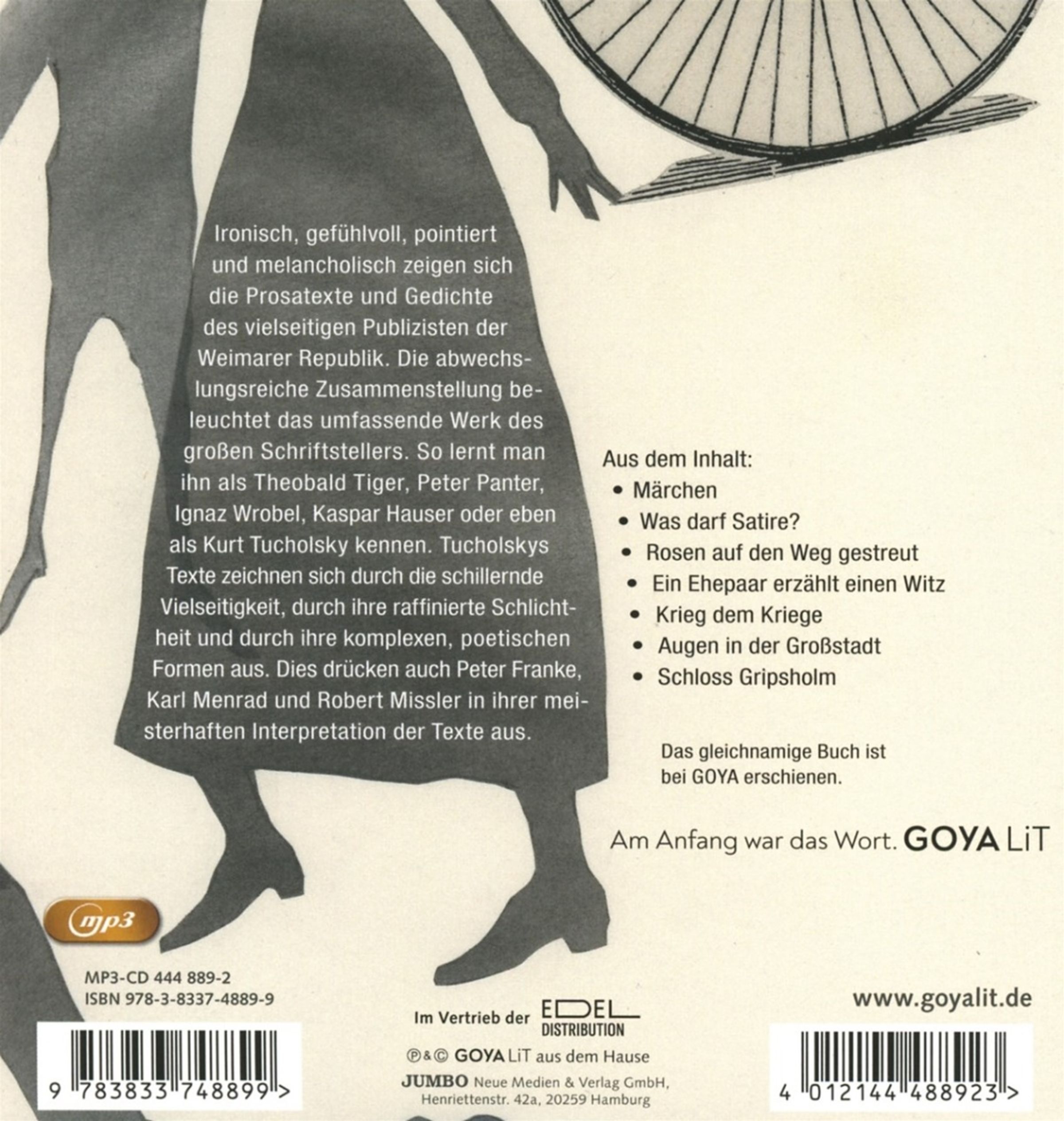 Ironisch, gefühlvoll, pointiert und melancholisch zeigen sich die Prosatexte und Gedichte des vielseitigen Publizisten der Weimarer Republik. Die abwechslungsreiche Zusammenstellung beleuchtet das umfassende Werk des großen Schriftstellers. So lernt man ihn als Theobald Tiger, Peter Panter, Ignaz Wrobel oder eben als Kurt Tucholsky kennen.