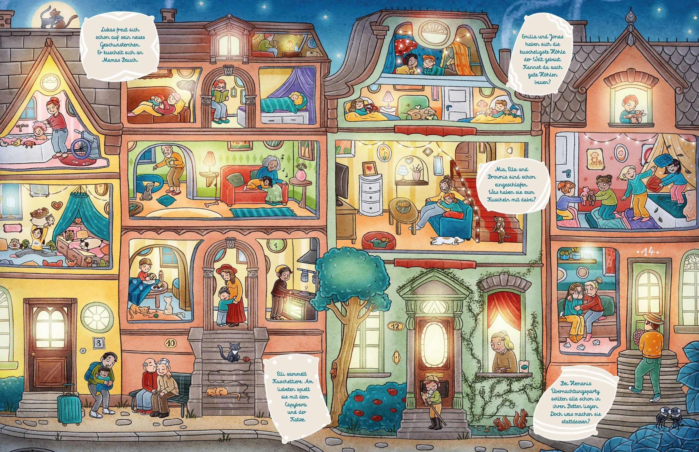 Entdecke die zauberhafte Welt des Kuschelns in diesem wunderschönen Wimmelbuch! Auf jeder Seite erwarten dich fröhliche Familien, die in den unterschiedlichsten Situationen Nähe und Geborgenheit erleben. Da dürfen natürlich auch die kleine Katze und der flauschige Hund nicht fehlen!