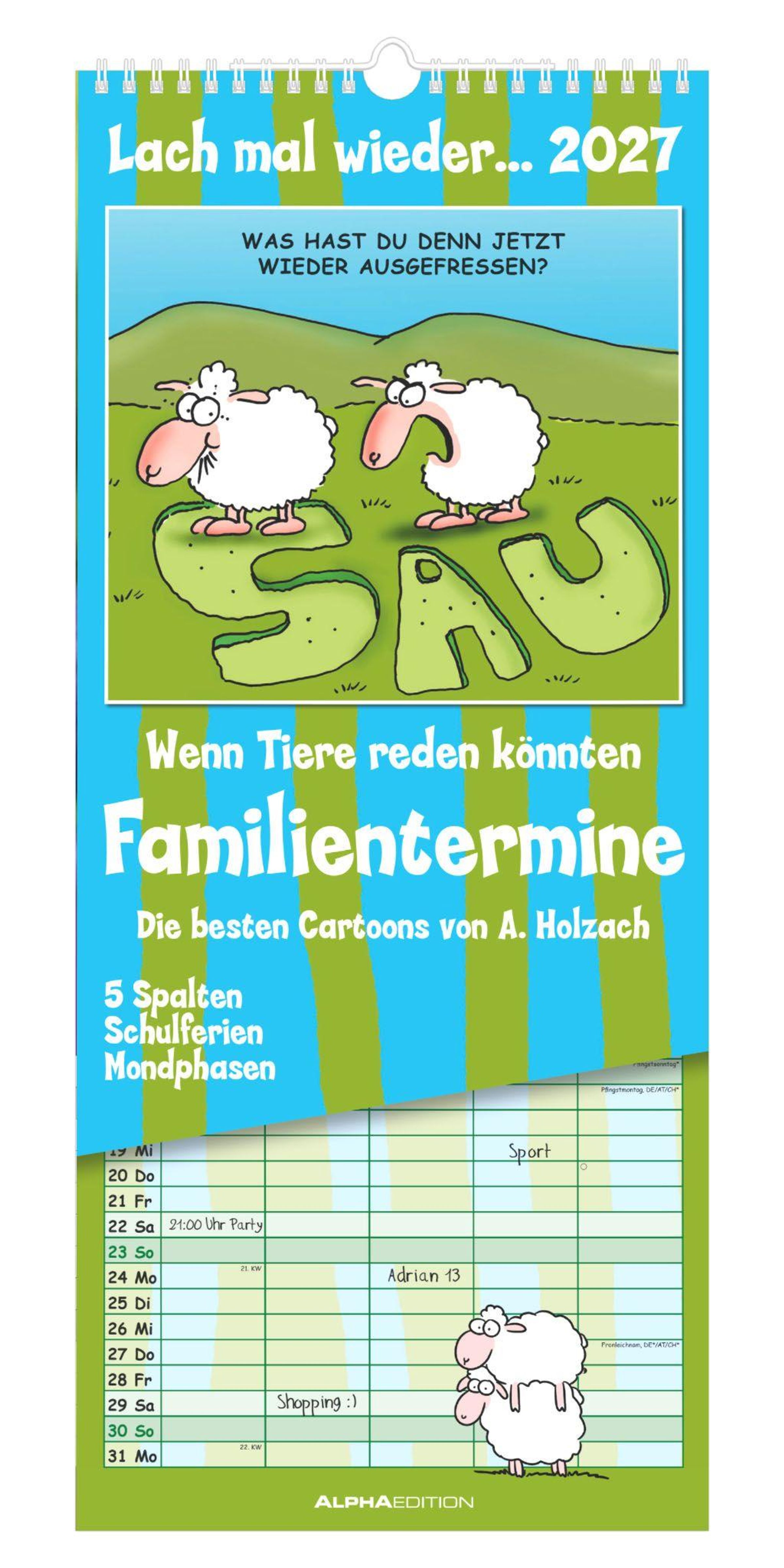 Bringen Sie gute Laune in Ihre Terminplanung -- mit dem Familienplaner Lach mal wieder...2027 von Alpha Edition. Dieser humorvolle Wandkalender vereint praktische Organisation mit charmanten Cartoons, die Monat für Monat ein Lächeln ins Gesicht zaubern.
