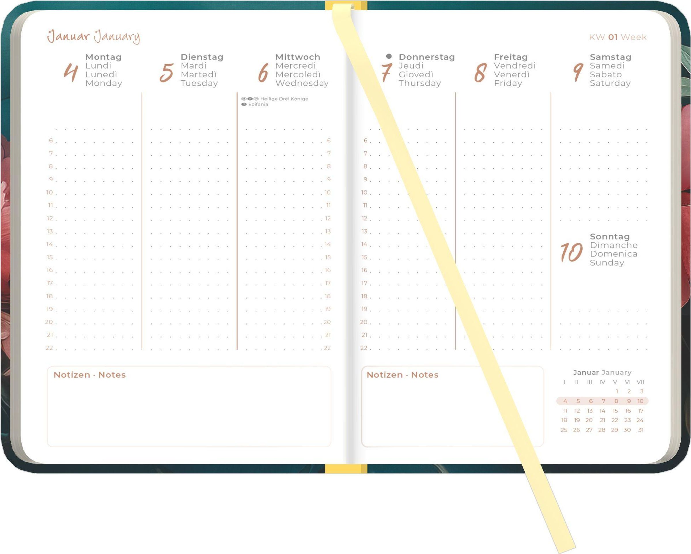 - Gebunden, Lesebändchen, internationales Kalendarium, leicht abgerundete Ecken, 1 Woche 2 Seiten, A6