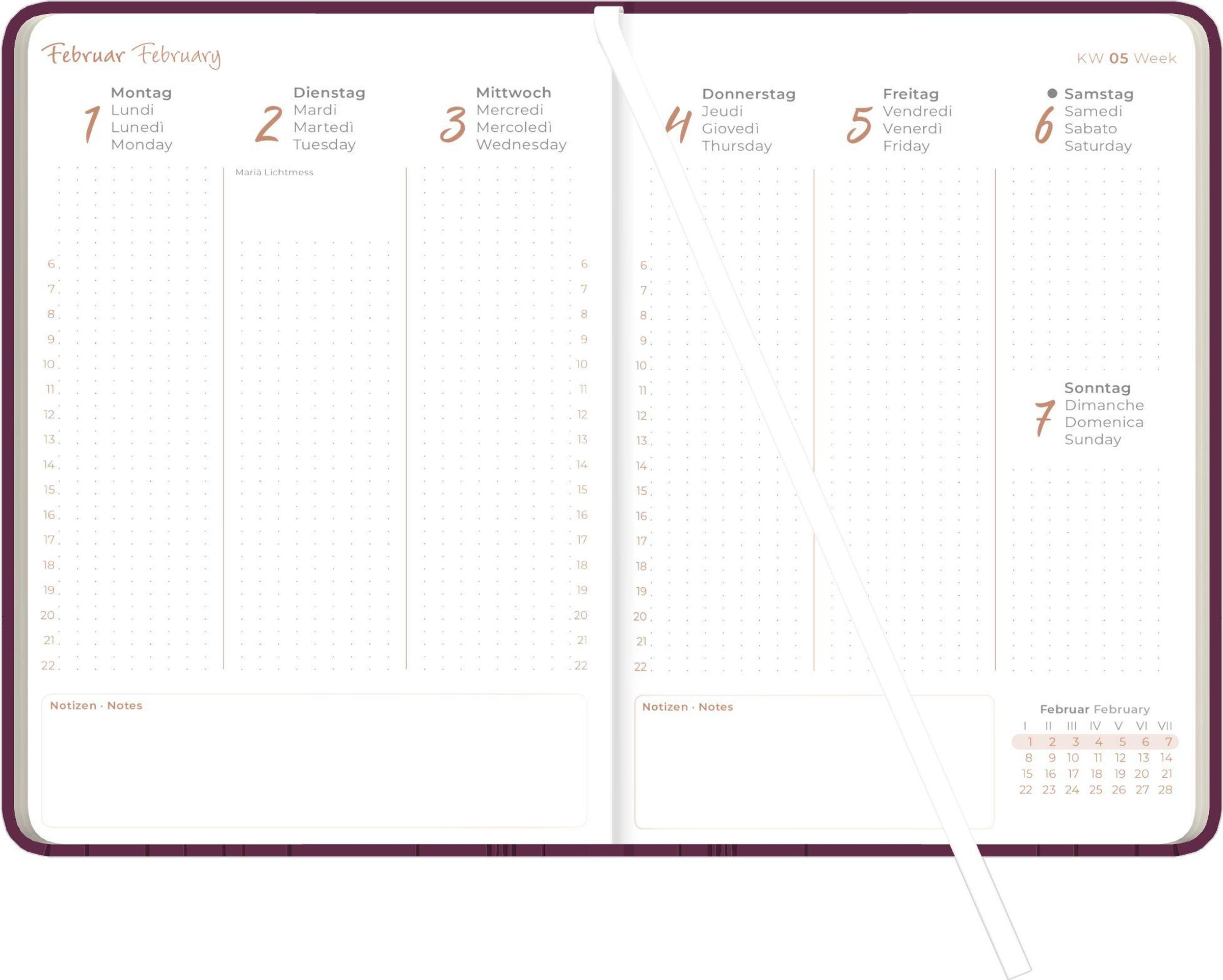 Übersichtliche Planung: 1 Woche pro Doppelseite mit Zeiteinteilung 06--22 Uhr und Platz für Notizen