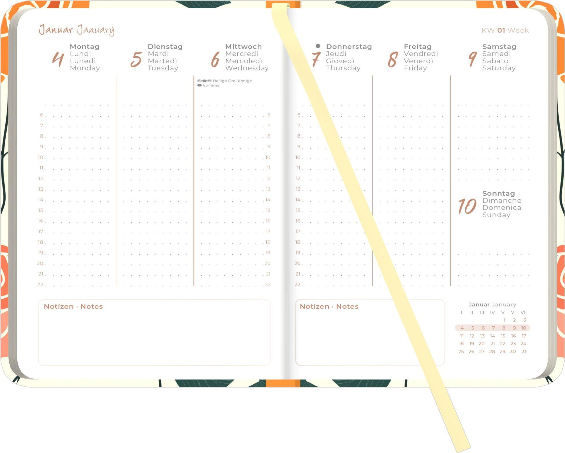 Umfassende Organisation: 192 Seiten mit Monatsübersicht, Notizbereich, Adressteil und Zeiteinteilung von 07--22 Uhr