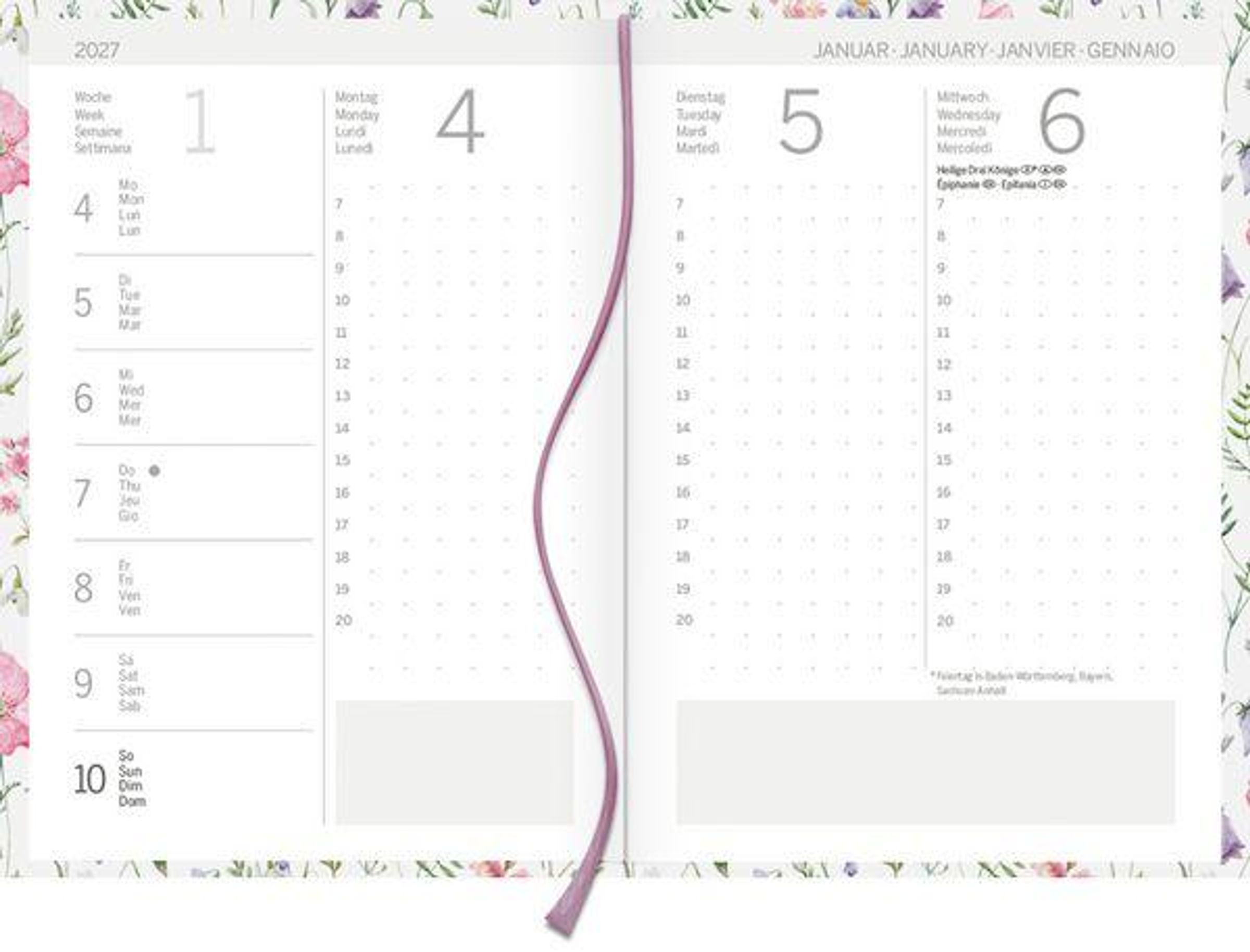 Der praktische Taschenplaner für die moderne Frau mit 4 Seiten pro Woche zum Eintragen und hochwertigem Einband mit einem floralen Motiv.