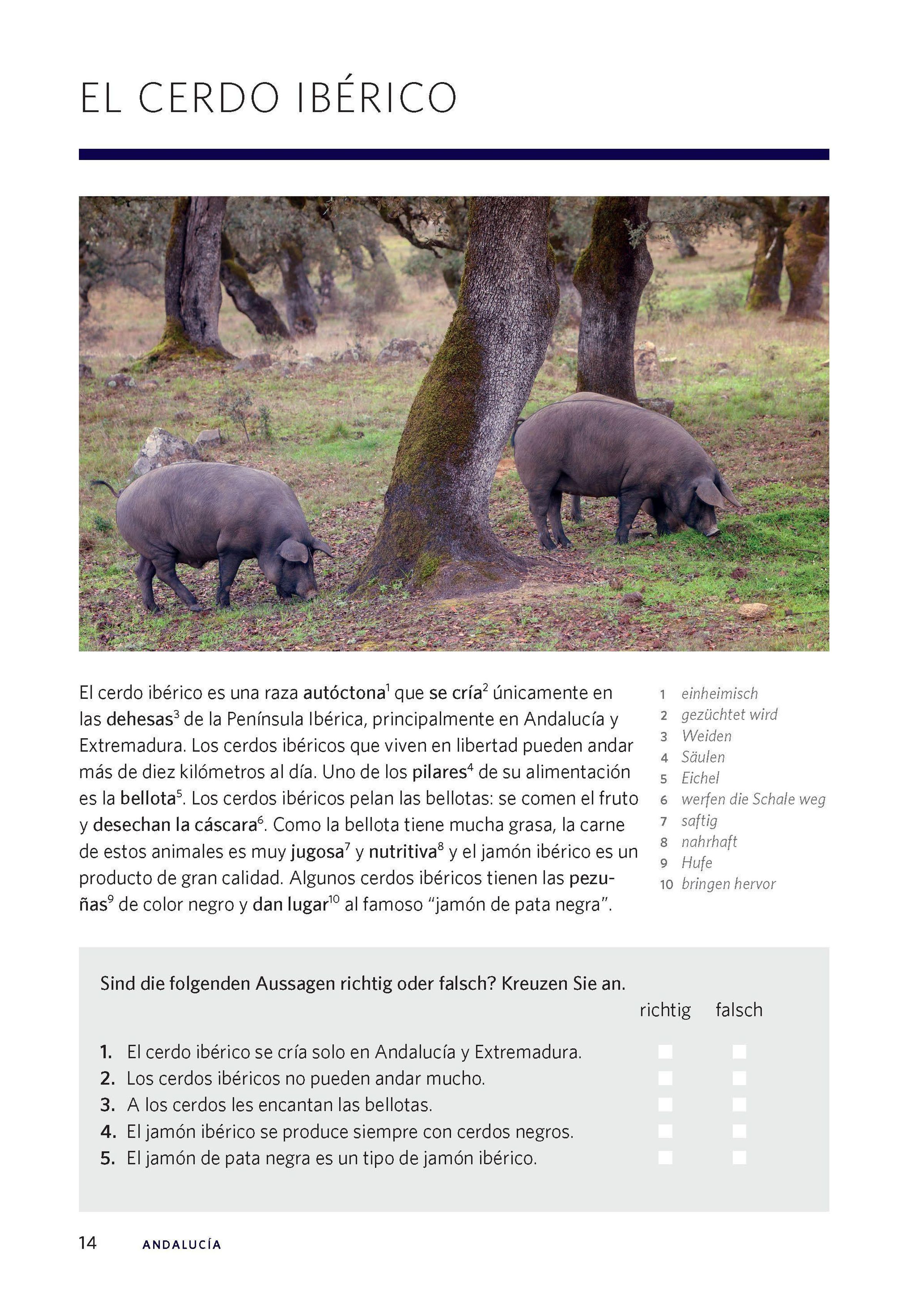 - Lernen Sie in zahlreichen Geschichten, Dialogen und Interviews viel Wissenswertes rund um die typisch spanischen Produkte und Gerichte