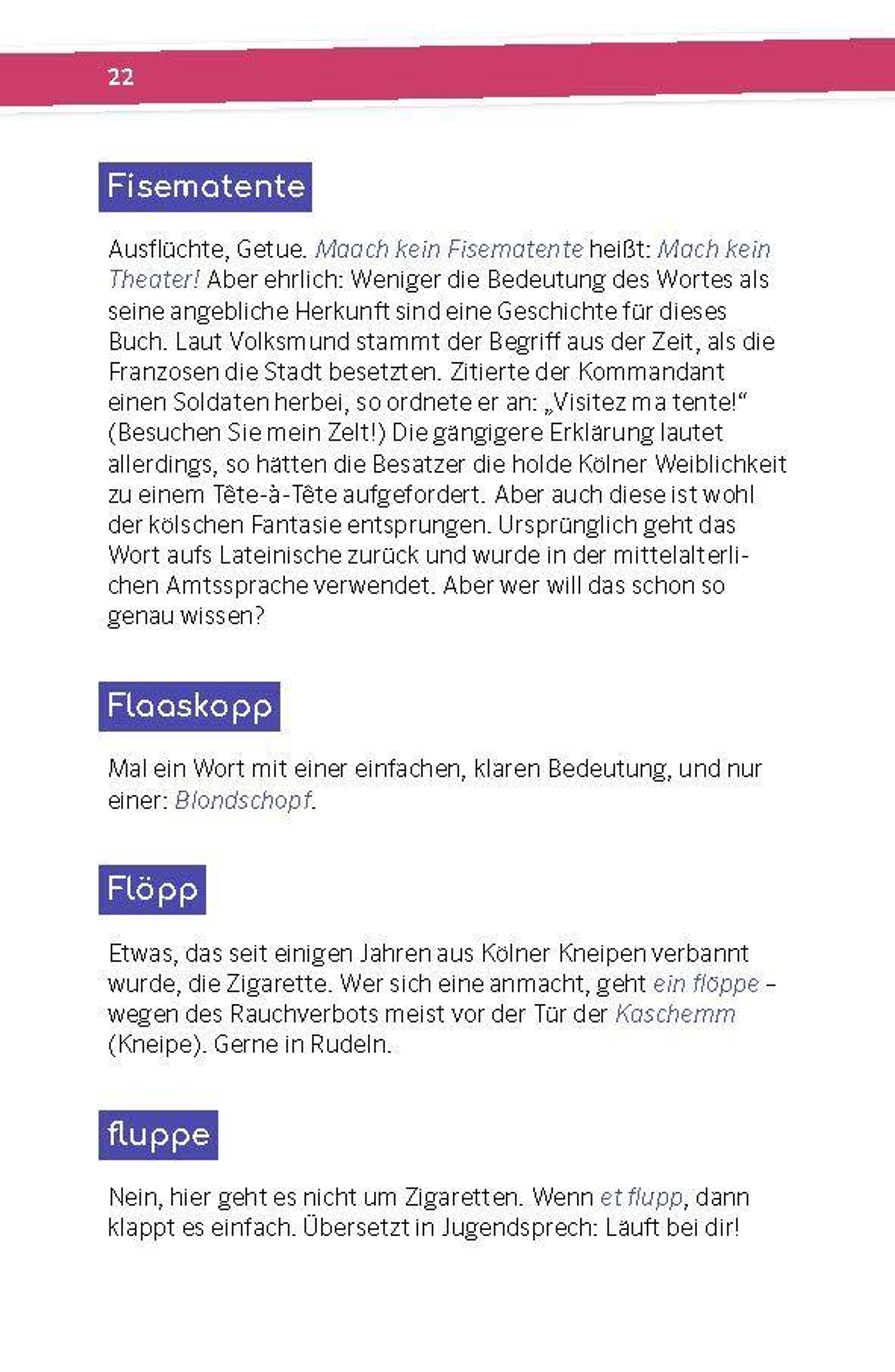 Anhand vieler charmanter Worterklärungen und Anekdoten lernen Sie die kölsche Sprache und Mentalität mit all ihren Eigenheiten kennen. Sie werden auf jedes Drink doch ene mit! mit einem schlagfertigen Sicher dat! reagieren und Einheimische beeindrucken können. Ob vor däm Dom oderzu Fasteleer - mit diesem Ratgeber können Sie in jeder Situation mit de Jecke mitschwaade - janz ohne Fisematentche!