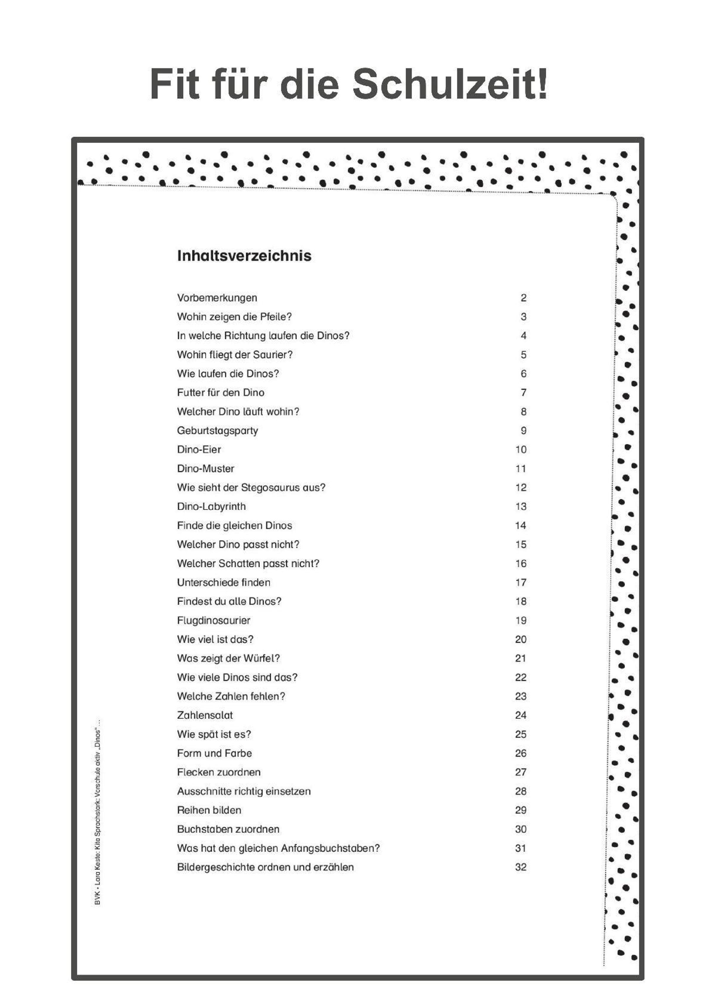 Aus dem Inhalt: In welche Richtung laufen die Dinos? - Linien nachfahren - Entgegengesetzte Schwungübungen - Welcher Dino passt nicht? - Wie viel ist das? - Welche Zahlen fehlen? - Form und Farbe - Was hat den gleichen Anfangsbuchstaben? ...