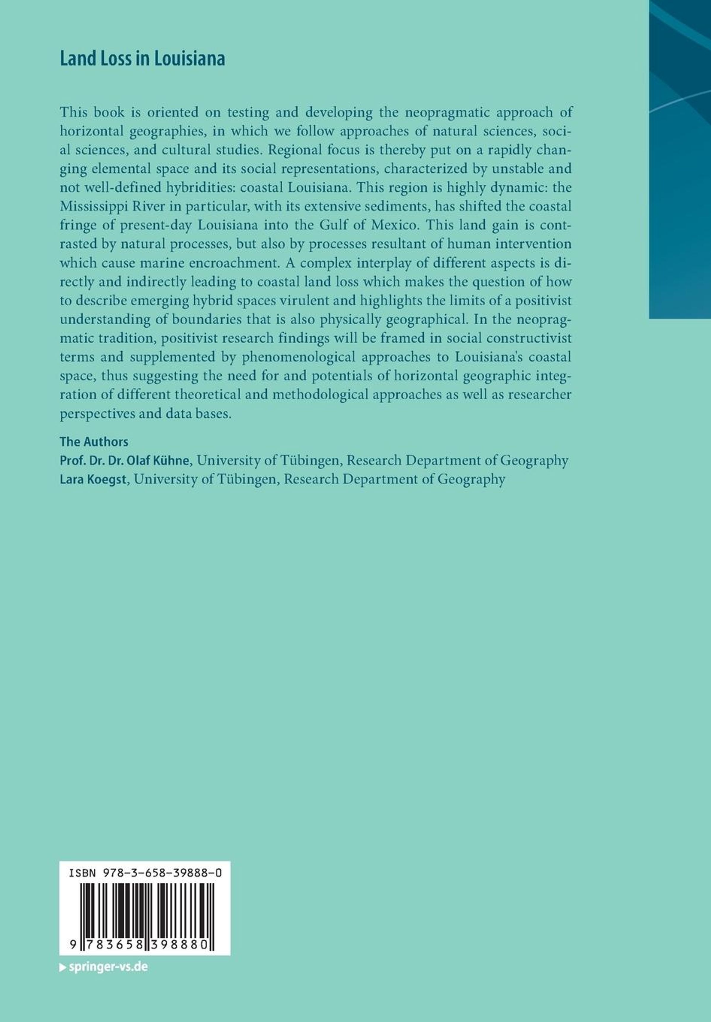 This book is oriented on testing and developing the neopragmatic approach of horizontal geographies, in which we follow approaches of natural sciences, social sciences, and cultural studies. Regional focus is thereby put on a rapidly changing elemental space and its social representations, characterized by unstable and not well-defined hybridities: coastal Louisiana. This region is highly dynamic: the Mississippi River in particular, with its extensive sediments, has shifted the coastal fringe of present-day Louisiana into the Gulf of Mexico. This land gain is contrasted by natural processes, but also by processes resultant of human intervention which cause marine encroachment. A complex interplay of different aspects is directly and indirectly leading to coastal land loss which makes the question of how to describe emerging hybrid spaces virulent and highlights the limits of a positivist understanding of boundaries that is also physically geographical. In the neopragmatic tradition, positivist research findings will be framed in social constructivist terms and supplemented by phenomenological approaches to Louisiana's coastal space, thus suggesting the need for and potentials of horizontal geographic integration of different theoretical and methodological approaches as well as researcher perspectives and data bases.