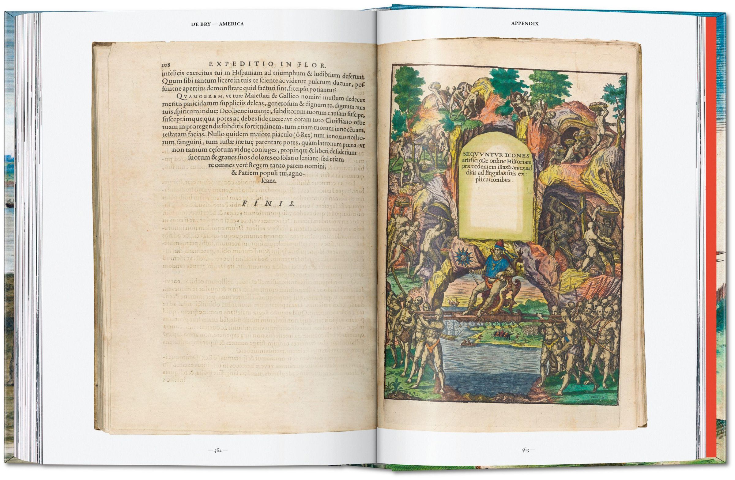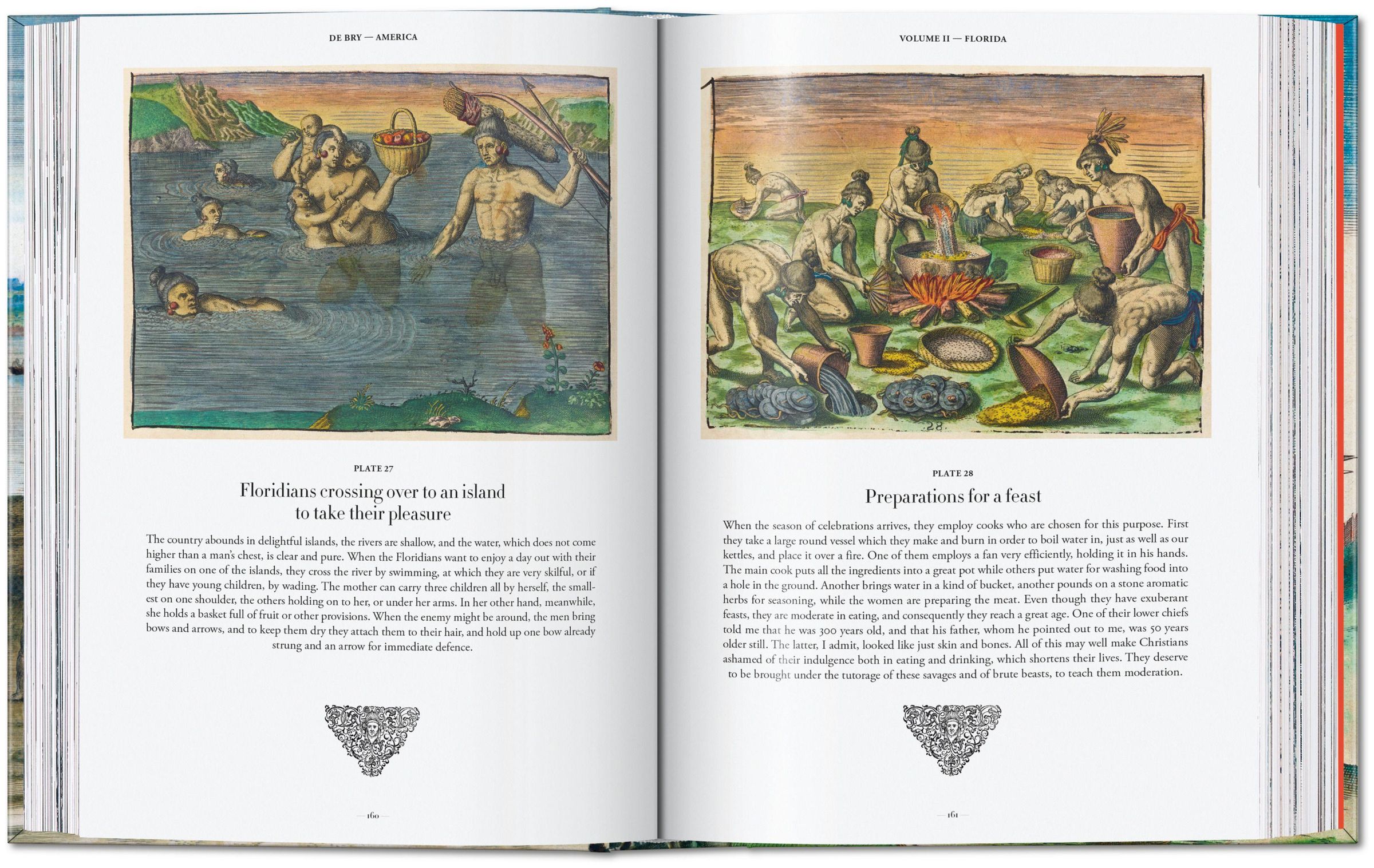 Von "Virginia" (dem heutigen North Carolina) und Florida, durch Zentralamerika bis hinunter nach Patagonien zeigen die ersten neun Bände von America Landschaften, fremdartiges Kulturinventar und erste Begegnungen zwischen indigener Bevölkerung und Europäern. TASCHENs Ausgabe zeigt alle 218 Bildtafeln dieser neun Bände mitsamt ihren jeweiligen Frontispizen und Karten. Die Bände I bis VI basieren auf den handkolorierten Originaldrucken, die in den John-Hay- und John-Carter-Brown-Bibliotheken an der Brown-Universität in Providence aufbewahrt werden; die Vorlagen für die Bände VII bis IX stammen aus der Staats- und Stadtbibliothek in Augsburg. Die Kupferstiche der de Brys mitsamt ihrer Bildlegenden sind Kunstwerke von außergewöhnlicher Qualität und in ihrer Komplexität auch heute noch spannend zu dechiffrierende Dokumente des frühen Kolonialdiskurses.
