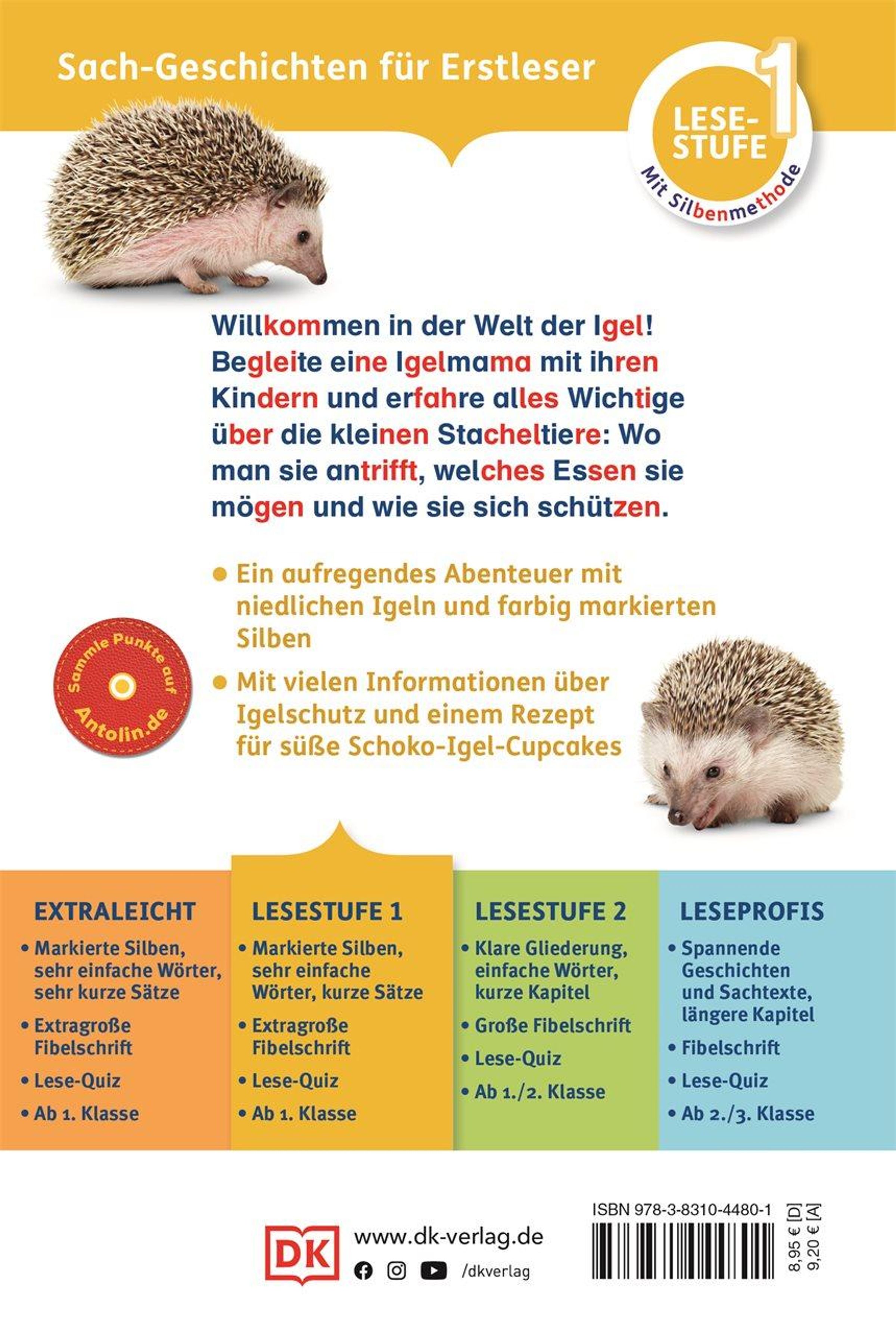 Dieses Erstlesebuch über die Welt der Igel eignet sich mit kurzen Sätzen, einfacher Sprache und extra großer Fibelschrift perfekt zur Leseförderung. Farbig markierte Silben, ein praktisches Lesebändchen und ein übersichtliches Glossar zum Nachschlagen der Wörter erleichtern das Lesenlernen - und mit dem Mix aus fesselnder Erzählung und spannendem Sachwissen zu den stacheligen Waldbewohnern, kniffligem Quiz und einem Rezept für Schoko-Igel-Cupcakes macht Lesen üben gleich dreimal so viel Spaß!