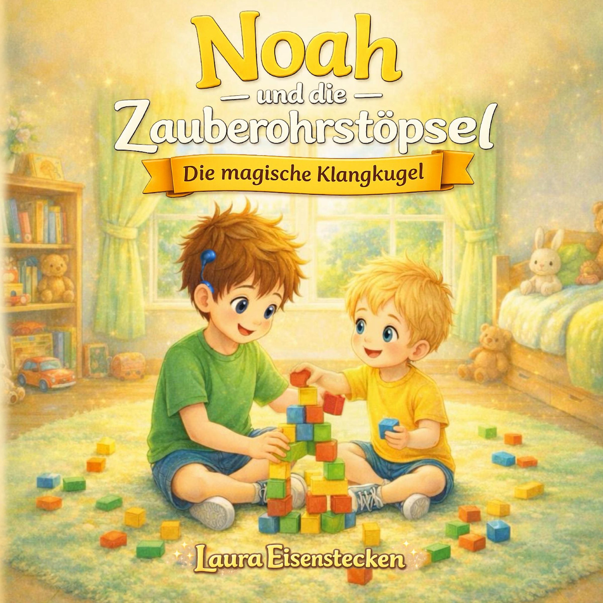 „Noah und die Zauberohrstöpsel: Die magische Klangkugel“ von Laura Eisenstecken. Zwei Kinder spielen mit Bauklötzen., Buch