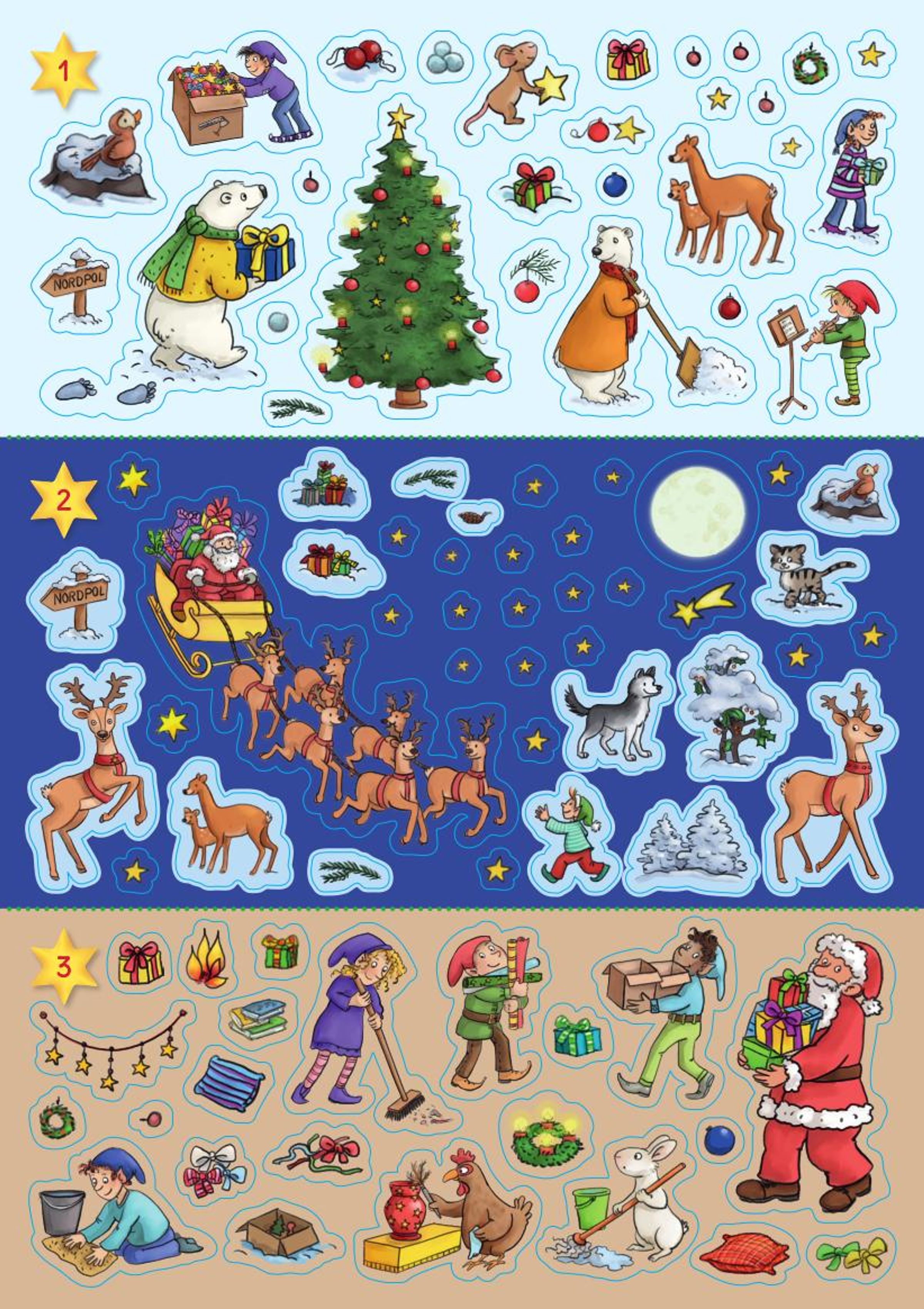 Für jeden Tag im Advent enthält das Heft eine schöne Weihnachtsszene aus der Heimat des Weihnachtsmanns und seiner Weihnachtselfen, Rentiere etc. sowie die dazu passenden Sticker zum Gestalten. Auf die Sticker, fertig - klebt!