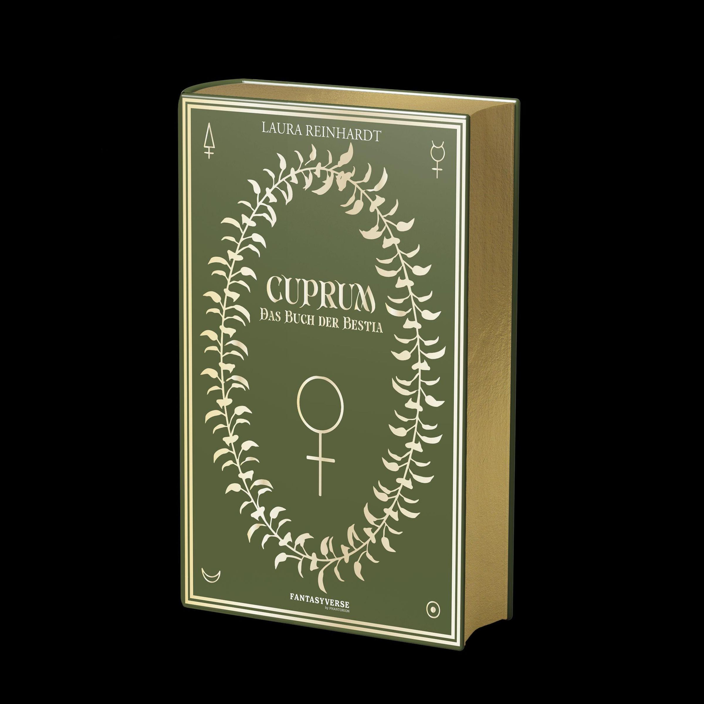 Ein Buch mit dem Titel "CUPRUM: Das Buch der Bestia" von Laura Reinhardt, umrahmt von symbolischen Verzierungen., Buch