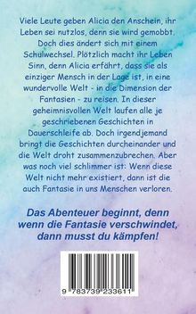 Viele Leute geben Alicia den Anschein, ihr Leben sei nutzlos, denn sie wird gemobbt. Doch dies ändert sich mit einem Schulwechsel. Plötzlich macht ihr Leben Sinn, denn Alicia erfährt, dass sie als einziger Mensch in der Lage ist, in eine wundervolle Welt - in die Dimension der Fantasien - zu reisen. In dieser geheimnisvollen Welt laufen alle je geschriebenen Geschichten in Dauerschleife ab. Doch irgendjemand bringt die Geschichten durcheinander und die Welt droht zusammenzubrechen. Aber was noch viel schlimmer ist: Wenn diese Welt nicht mehr existiert, dann ist die auch Fantasie in uns Menschen verloren. Das Abenteuer beginnt, denn wenn die Fantasie verschwindet, dann musst du kämpfen!