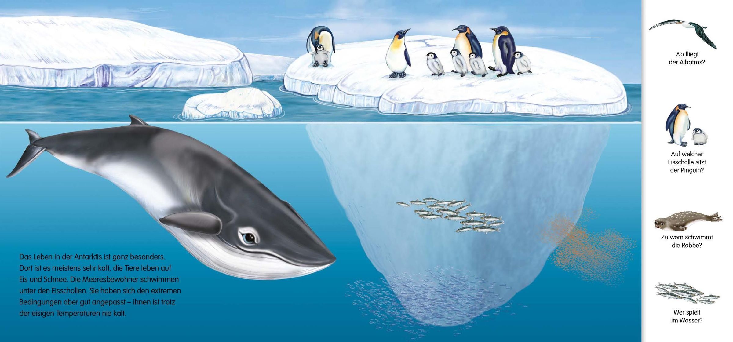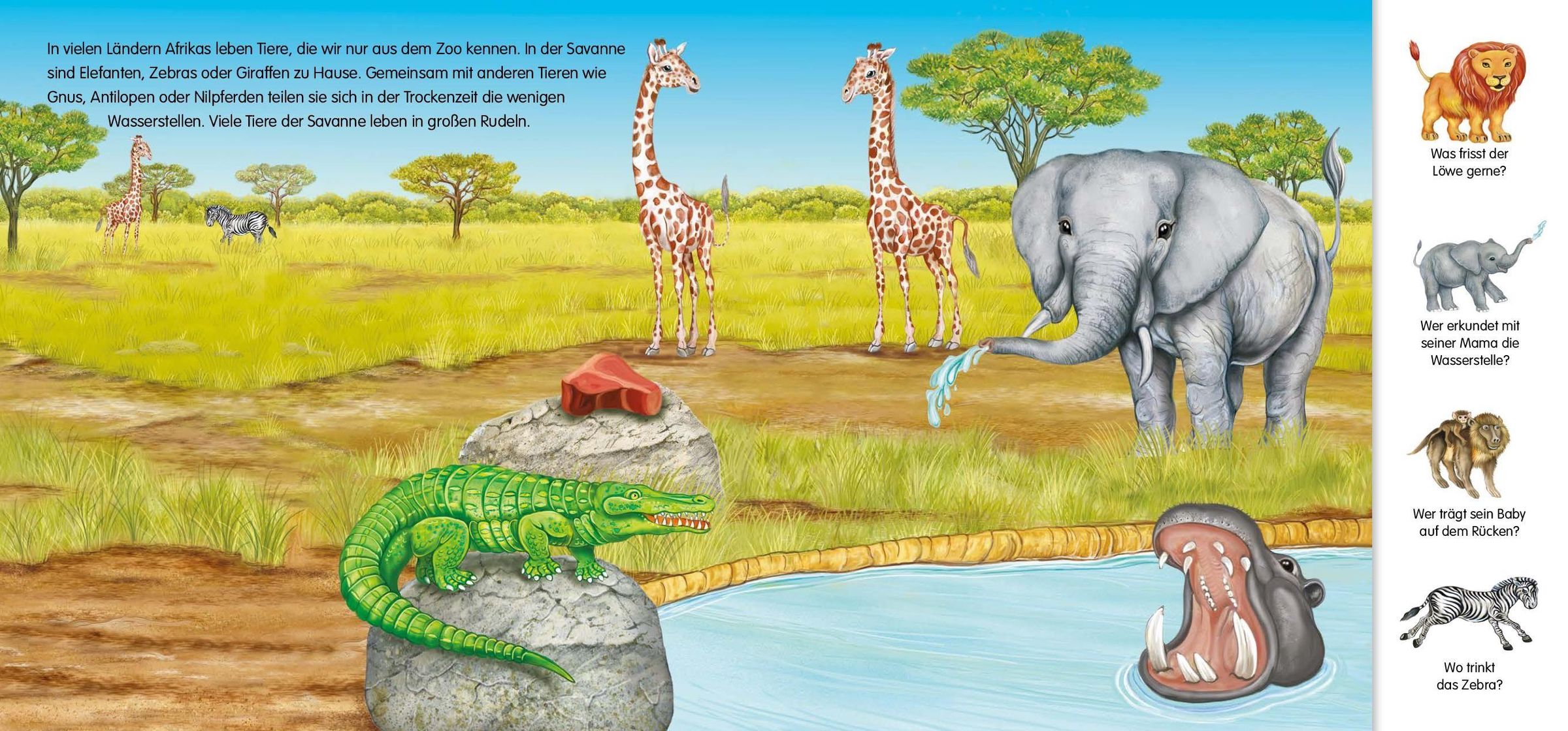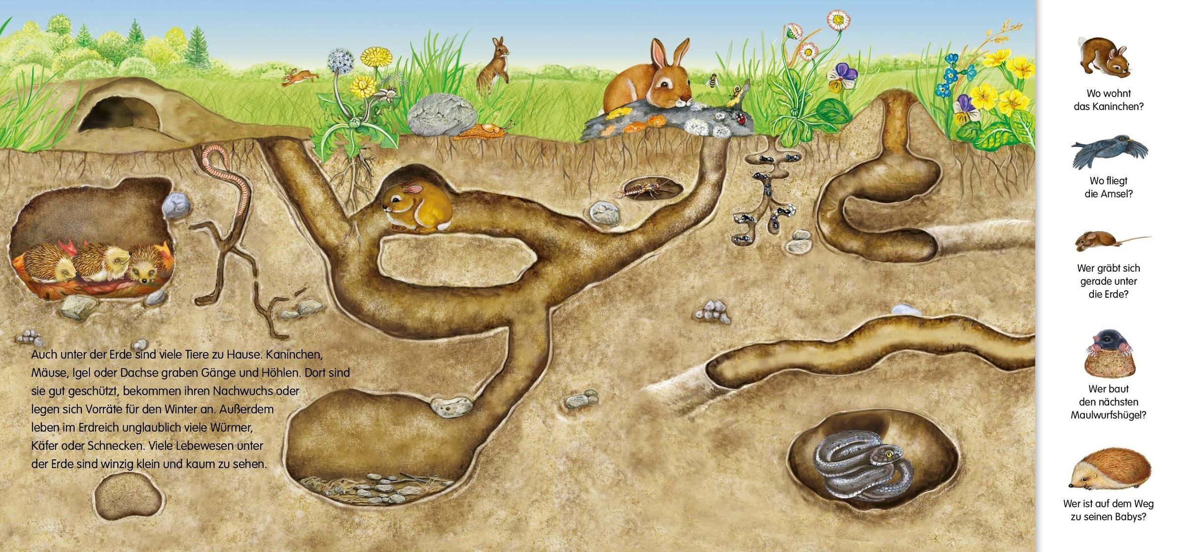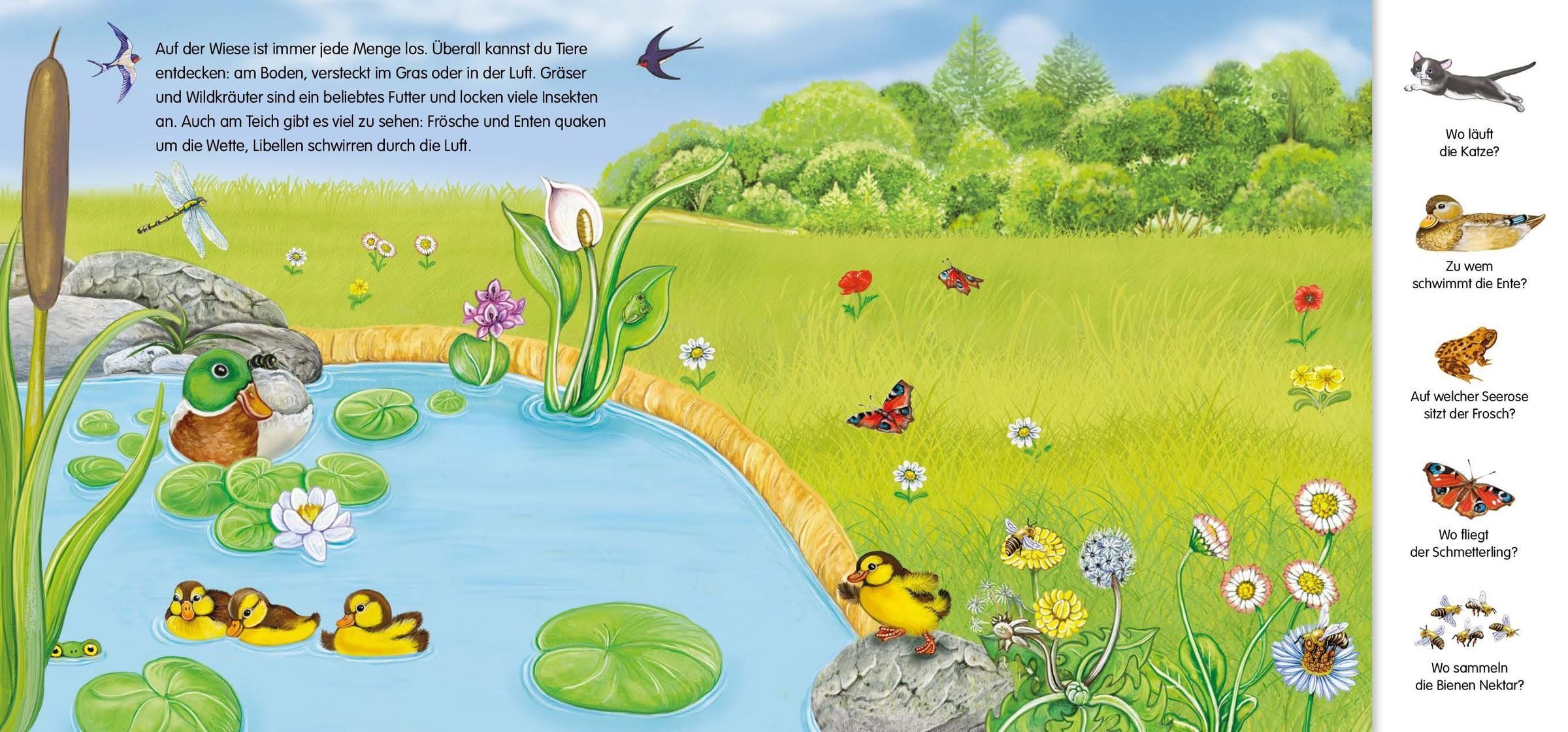 Pädagogisch wertvoll: kleine Texte und Aufforderungen im Bild leiten an, fördern Wortschatz, Orientierung, Feinmotorik und erstes Sachwissen über Tiere