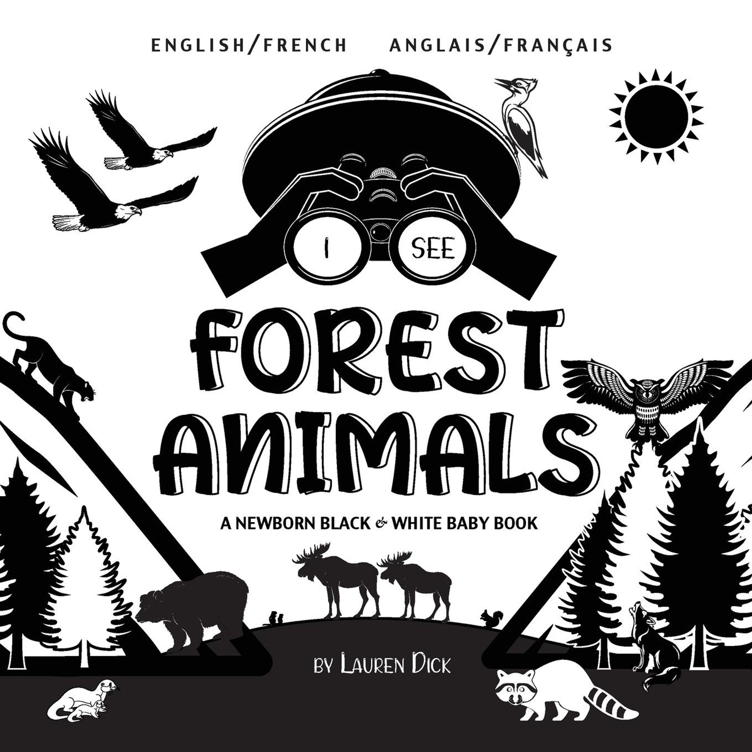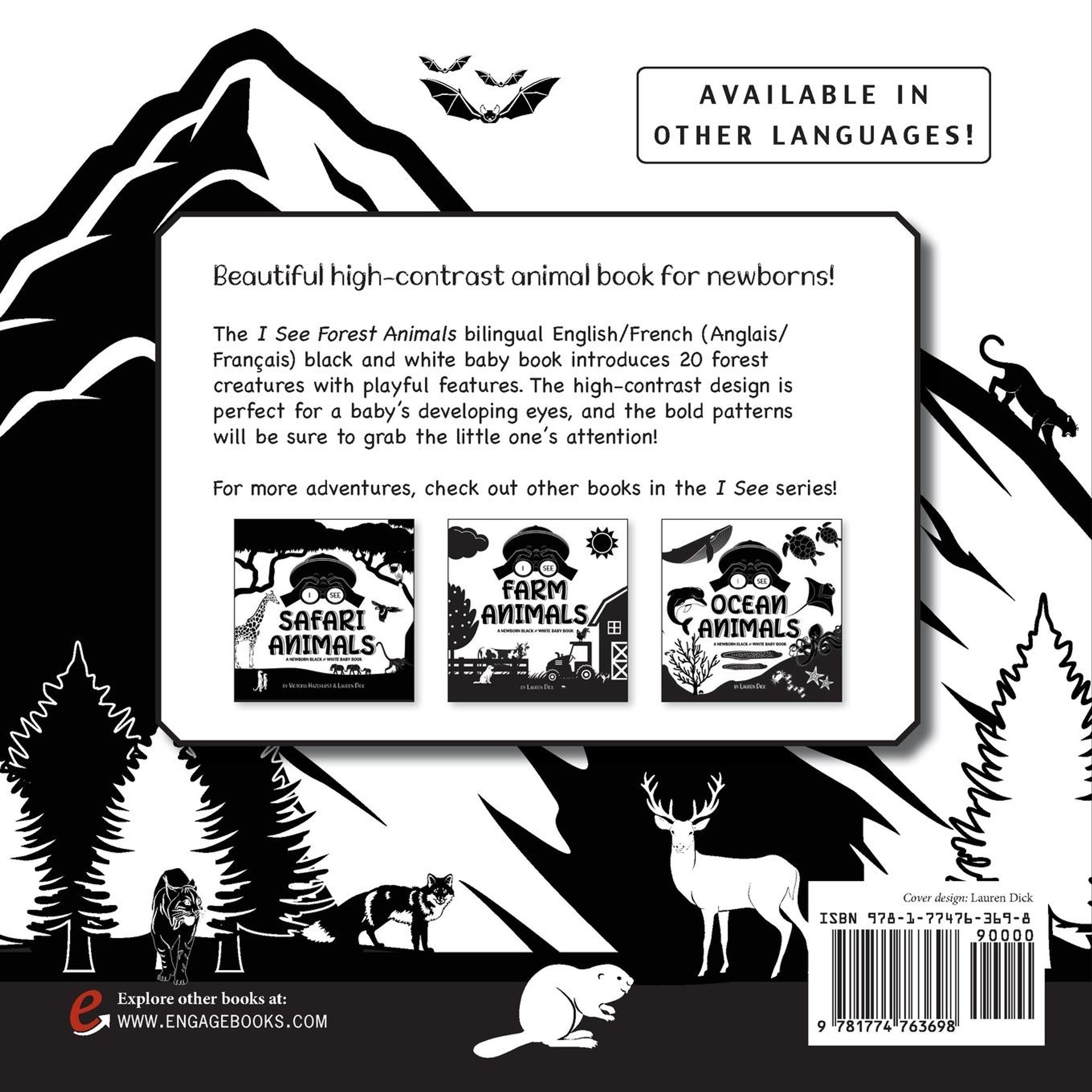 Beautiful high-contrast animal book for newborns! The I See Forest Animals bilingual English / French (Anglais / Français) black and white baby book introduces 20 forest creatures with playful features. Help your baby get to know bear, moose, deer, cougar, wolf, fox, beaver, skunk, owl, eagle, woodpecker, bat, and more. The high-contrast design is perfect for a baby's developing eyes, and the bold patterns will be sure to grab the little one's attention! For more adventures, check out other books in the I See series!I See Safari Animals I See Farm Animals I See Ocean Animals I See Forest Animals I See Garden Animals I See Zoo Animals