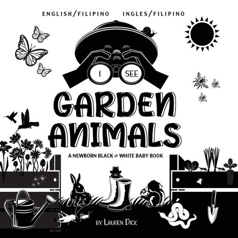 Beautiful high-contrast animal book for newborns! The I See Garden Animals bilingual English / Filipino (Ingles / Filipino) black and white baby book introduces 20 garden creatures with playful features. Help your baby get to know hummingbird, butterfly, dragonfly, snail, bee, spider, snake, frog, mouse, rabbit, mole, and more. The high-contrast design is perfect for a baby's developing eyes, and the bold patterns will be sure to grab the little one's attention! For more adventures, check out other books in the I See series!I See Safari Animals I See Farm Animals I See Ocean Animals I See Forest Animals I See Garden Animals I See Zoo Animals