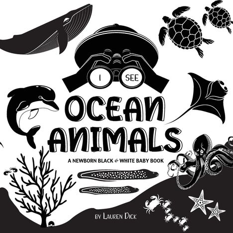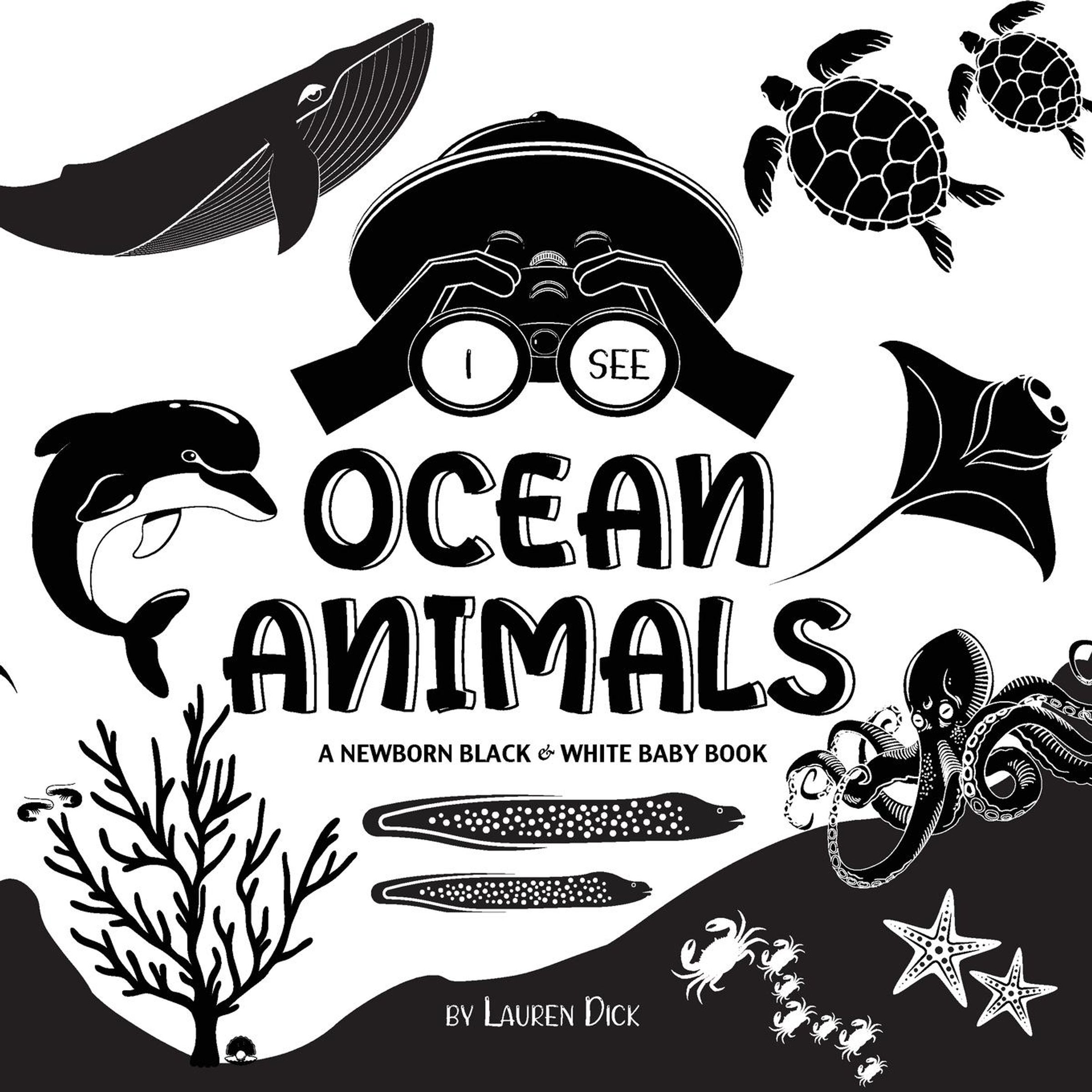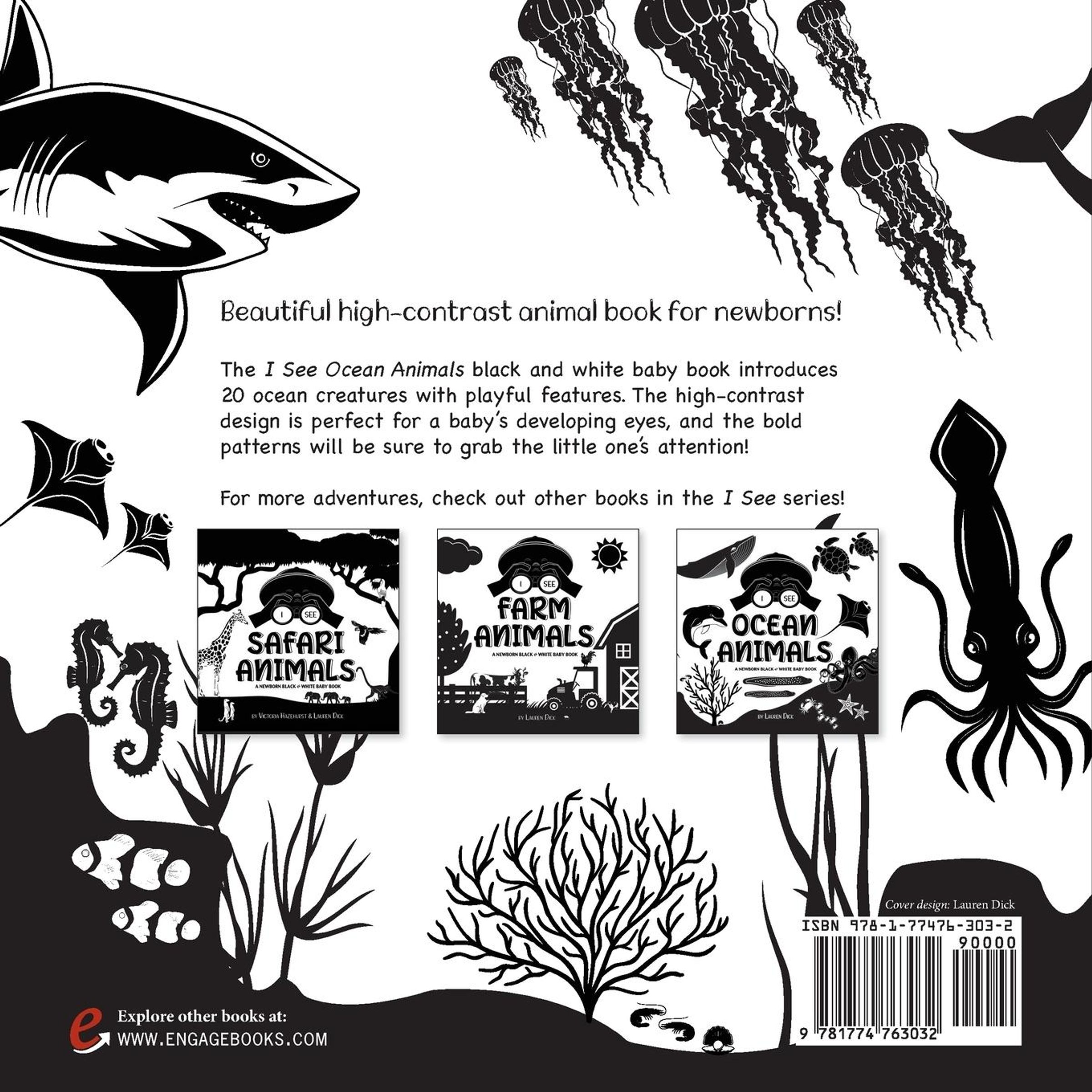 Beautiful high-contrast animal book for newborns! The I See Ocean Animals black and white baby book introduces 20 ocean creatures with playful features. Help your baby get to know whales, dolphins, sharks, turtles, seals, octopuses, stingrays, jellyfish, seahorses, starfish, crabs, and more. The high-contrast design is perfect for a baby's developing eyes, and the bold patterns will be sure to grab the little one's attention! For more adventures, check out other books in the I See series!I See Safari Animals I See Farm Animals I See Ocean Animals I See Forest Animals I See Garden Animals I See Zoo Animals