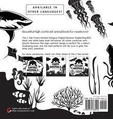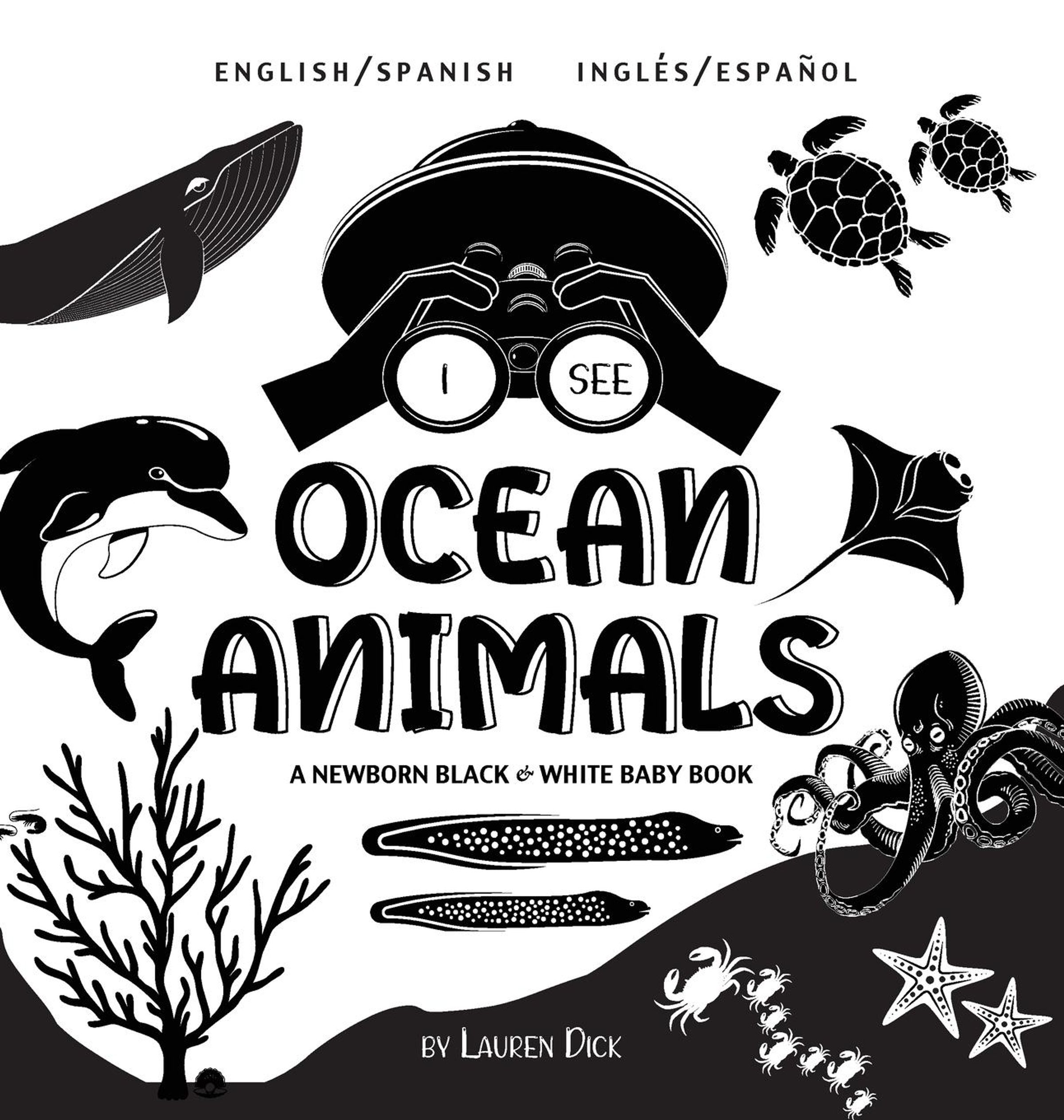 Beautiful high-contrast animal book for newborns! The I See Ocean Animals bilingual English / Spanish (Inglés / Español) black and white baby book introduces 20 ocean creatures with playful features. Help your baby get to know whales, dolphins, sharks, turtles, seals, octopuses, stingrays, jellyfish, seahorses, starfish, crabs, and more. The high-contrast design is perfect for a baby's developing eyes, and the bold patterns will be sure to grab the little one's attention! For more adventures, check out other books in the I See series!I See Safari Animals I See Farm Animals I See Ocean Animals I See Forest Animals I See Garden Animals I See Zoo Animals
