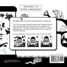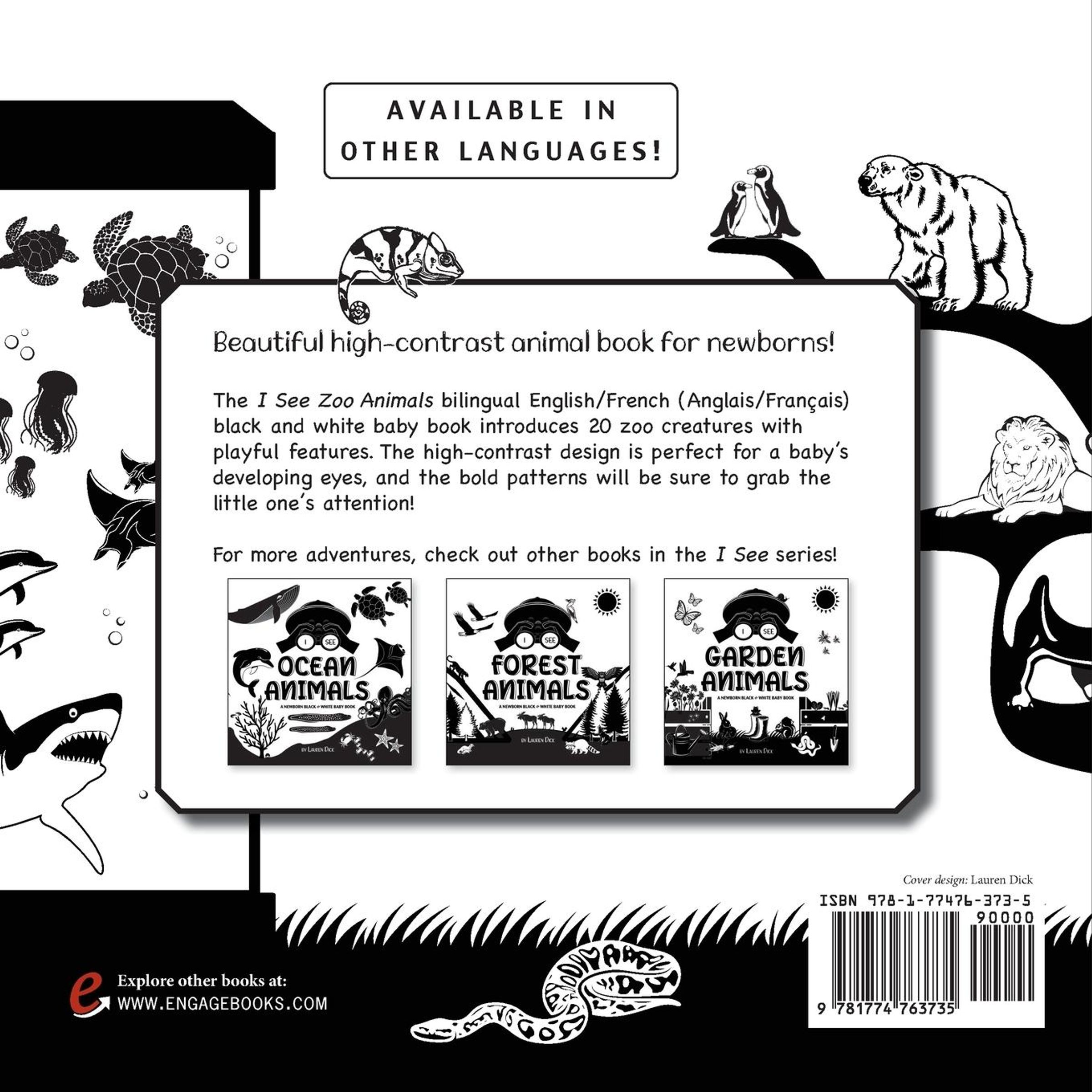 Beautiful high-contrast animal book for newborns! The I See Zoo Animals bilingual English / French (Anglais / Français) black and white baby book introduces 20 zoo creatures with playful features. Help your baby get to know pandas, koalas, sloths, monkeys, kangaroos, giraffes, elephants, lions, tigers, chameleons, sharks, dolphins, turtles, penguins, polar bears, and more. The high-contrast design is perfect for a baby's developing eyes, and the bold patterns will be sure to grab the little one's attention! For more adventures, check out other books in the I See series!I See Safari Animals I See Farm Animals I See Ocean Animals I See Forest Animals I See Garden Animals I See Zoo Animals