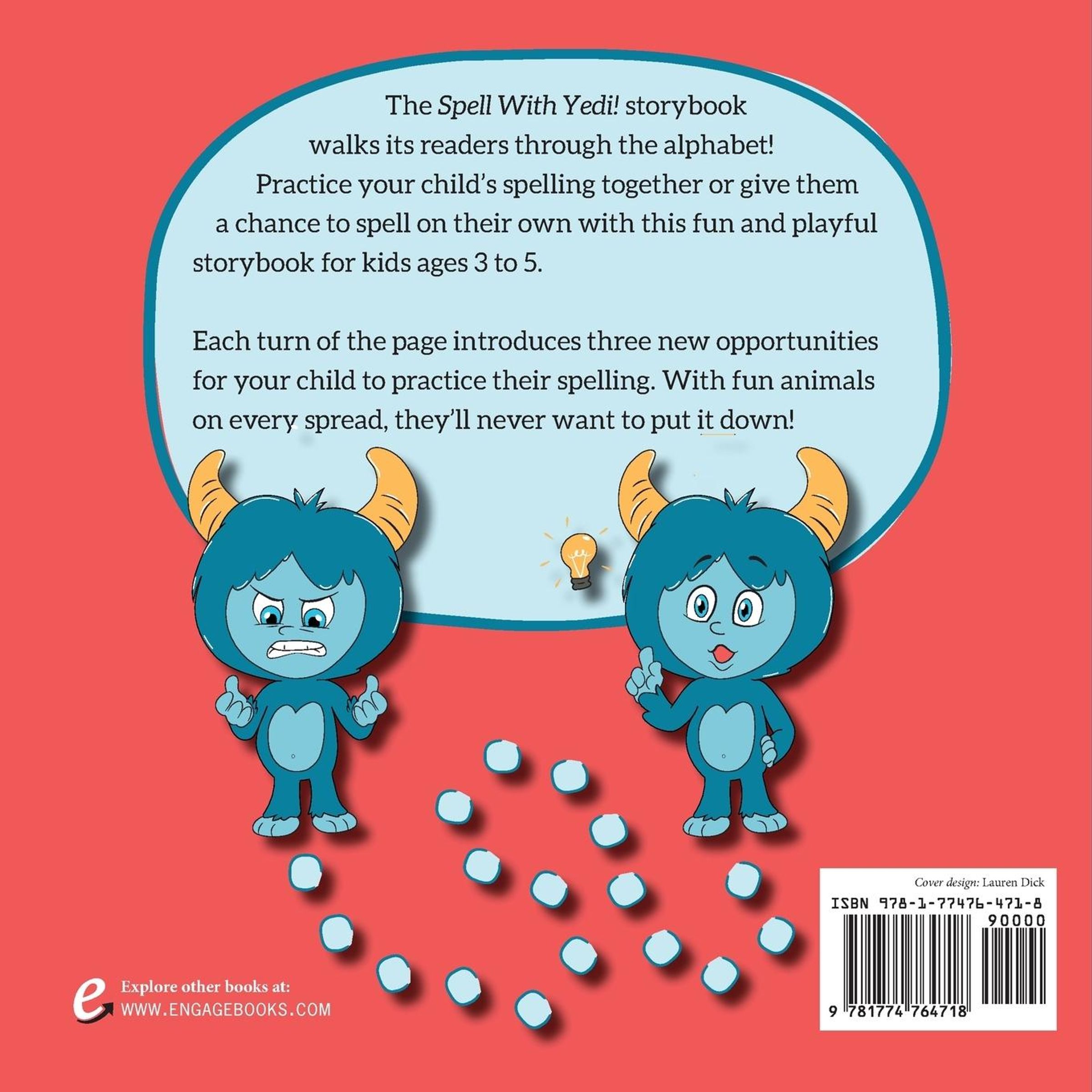 Practice Your Spelling With Yedi! The Spell With Yedi! storybook walks its readers through the alphabet! Practice your child's spelling together or give them a chance to spell on their own with this fun and playful storybook for kids ages 3 to 5. Each turn of the page introduces three new opportunities for your child to practice their spelling. With fun animals on every spread, they'll never want to put it down!