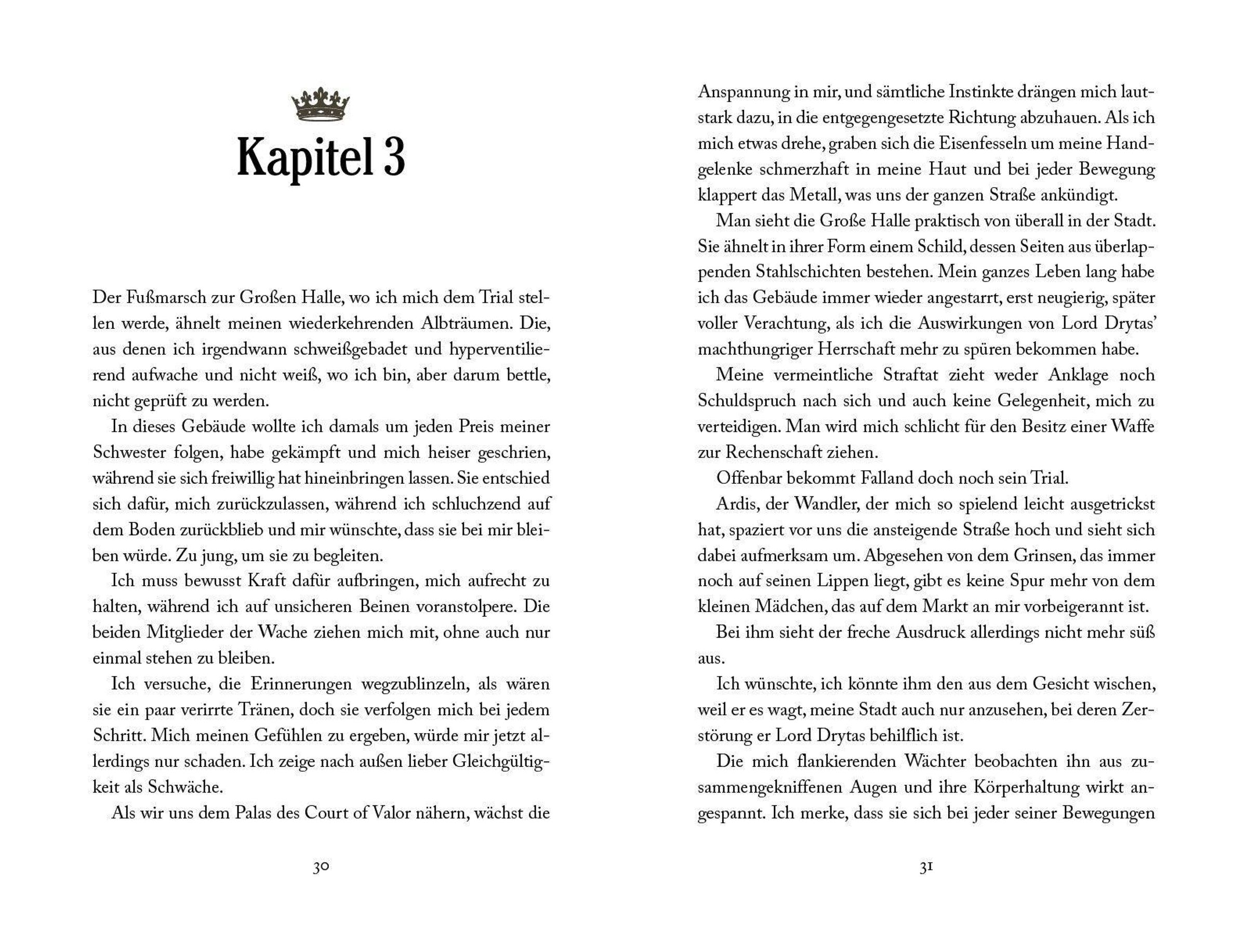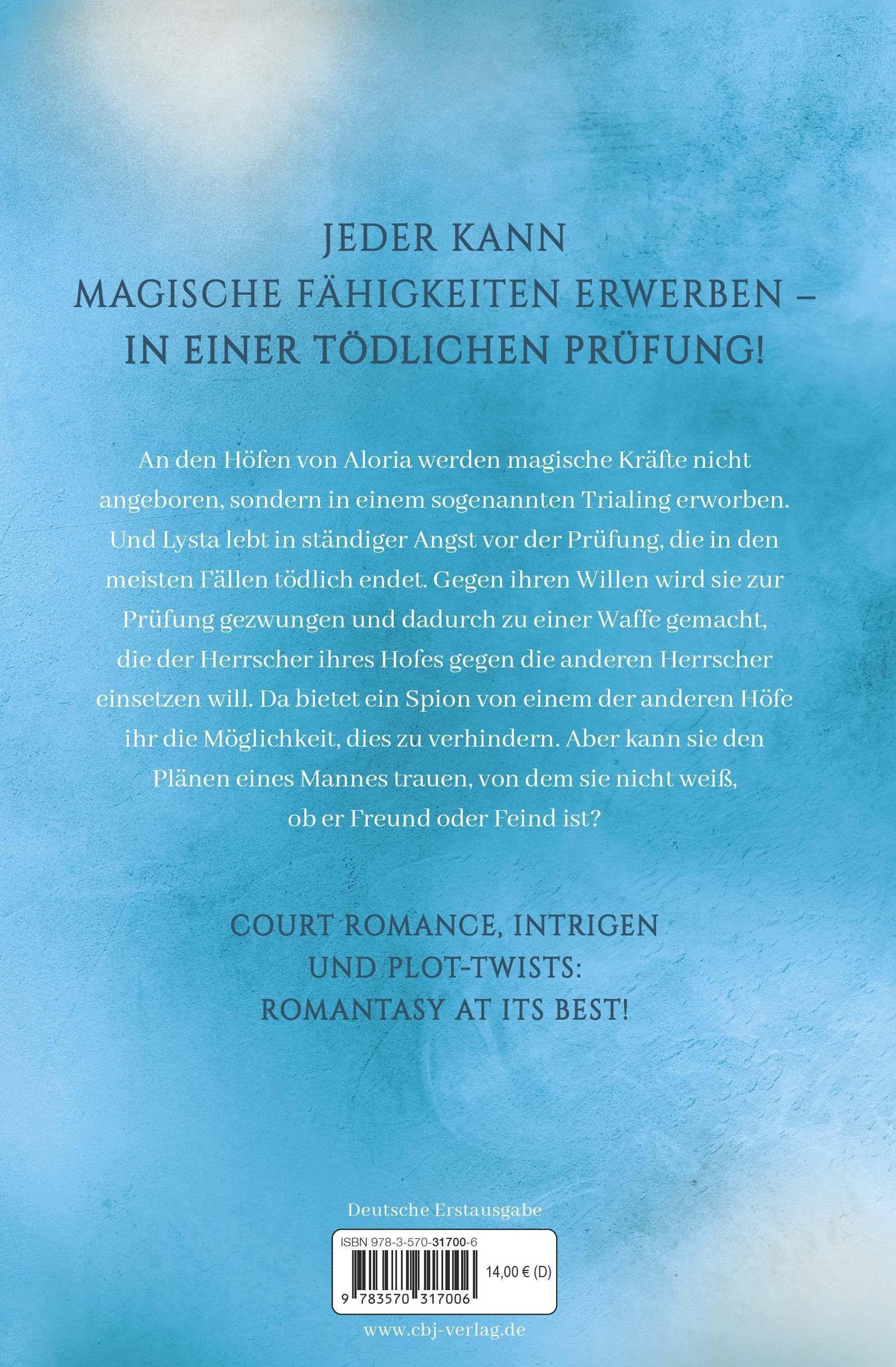 An den Höfen von Aloria werden magische Kräfte nicht angeboren, sondern in einem sogenannten Trialing erworben. Und Lysta lebt in ständiger Angst vor der Prüfung, deren Siegern zwar Fähigkeiten verliehen werden - die aber in den meisten Fällen tödlich endet. Gegen ihren Willen wird sie zur Prüfung gezwungen und dadurch zu einer Waffe gemacht, die der Herrscher ihres Hofes gegen die anderen Herrscher einsetzen will. Da bietet ein Spion von einem der anderen Höfe ihr die Möglichkeit, dies zu verhindern. Aber kann sie den Plänen eines Mannes trauen, von dem sie nicht weiß, ob er Freund oder Feind ist?